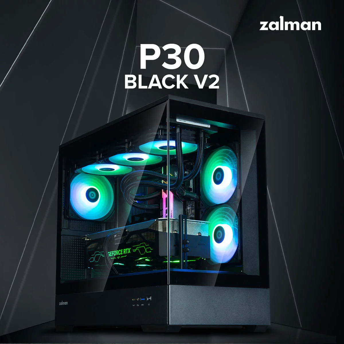 Панорамний корпус Zalman P30 BLACK V2 для сучасної домашньої чи ігрової станції, сумісний із актуальними компонентами. Передня та бічна панелі із загартованого скла. Забезпечено активне обдування компонентів за рахунок перфорації металевої поверхні панелей корпусу. Продумано захист від пилу. У комплекті 3х120мм ARGB вбудованих вентиляторів. Вентилятори на бічній панелі – реверсні: забезпечують постачання повітря ззовні. Вентилятор на задній панелі працює на видуві. Корпус укомплектований усіма необхідними деталями для складання та подальшої експлуатації, є стандартні сучасні актуальні інтерфейси та роз'єми.