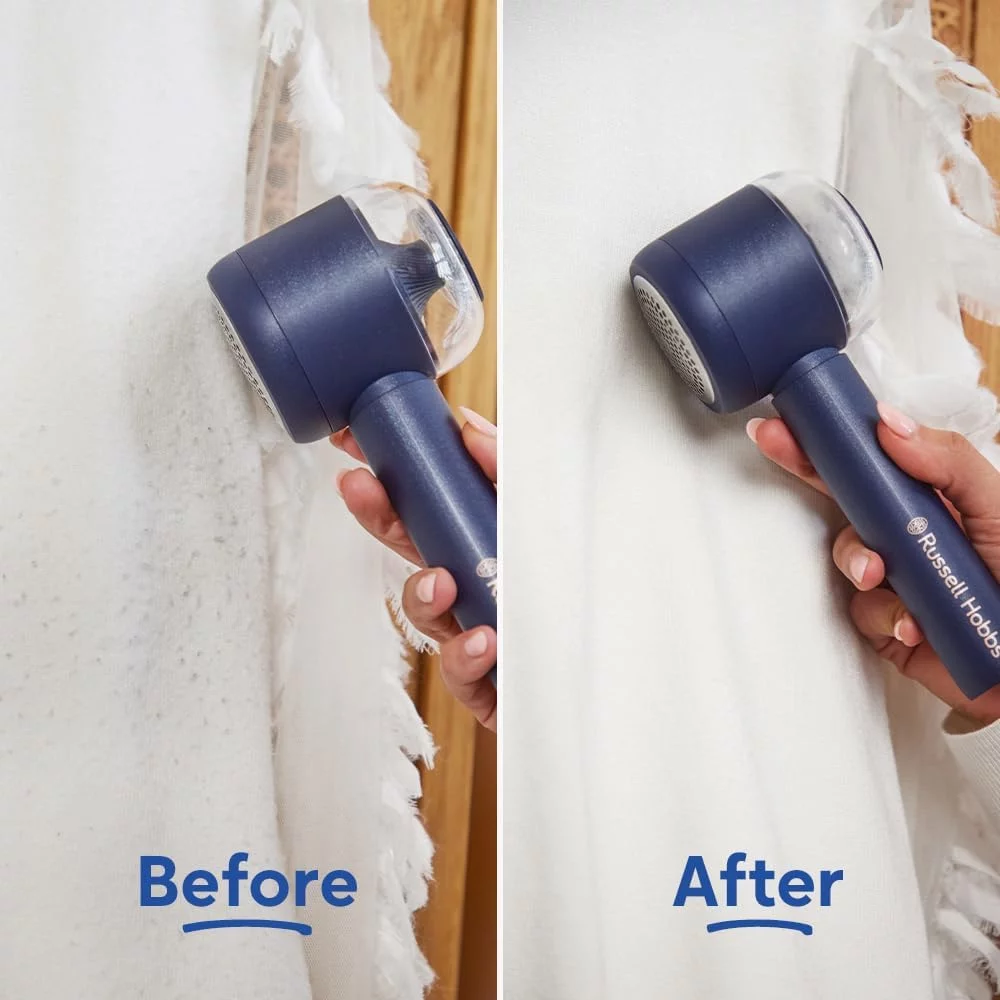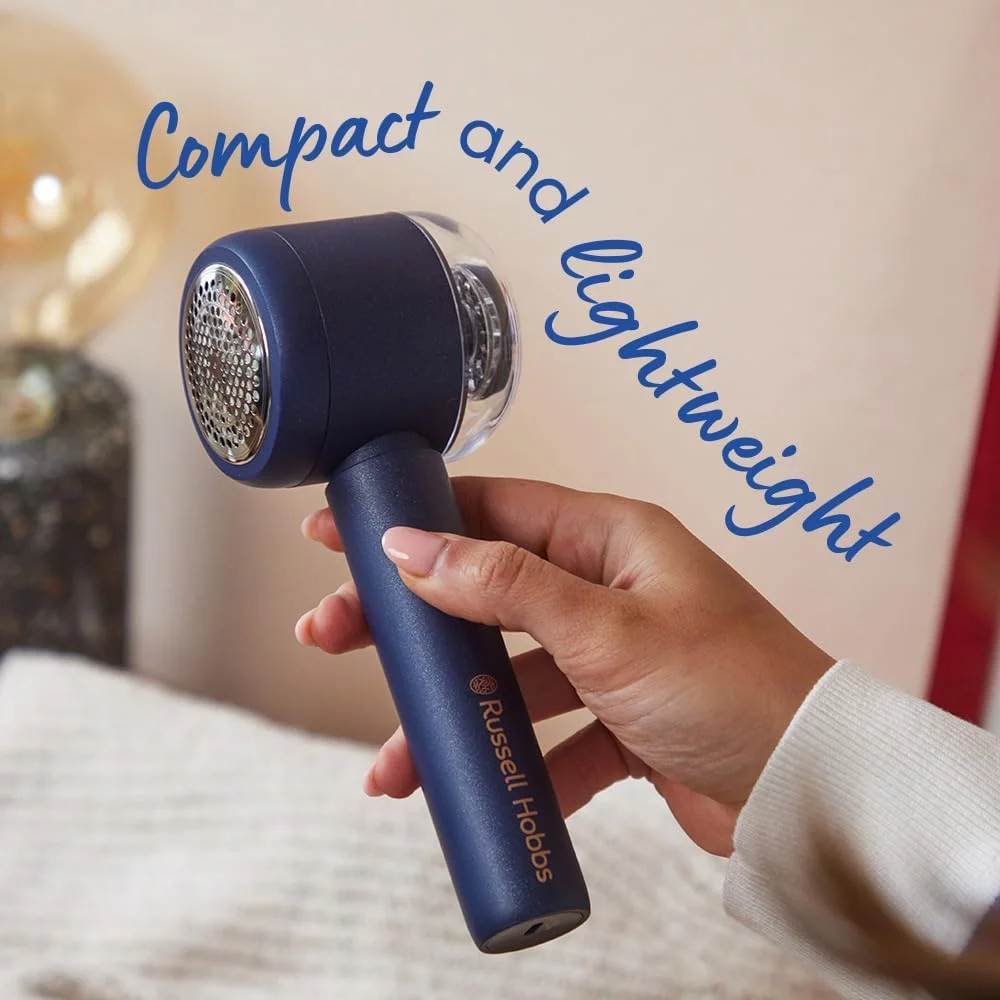 Russell Hobbs 27660-56 — портативна машинка для видалення катишків із великою площею лез для швидкого догляду за одягом! 90 хвилин роботи на одному заряді через USB, синій колір і ергономічний дизайн — зручний помічник для свіжого вигляду речей будь-де!