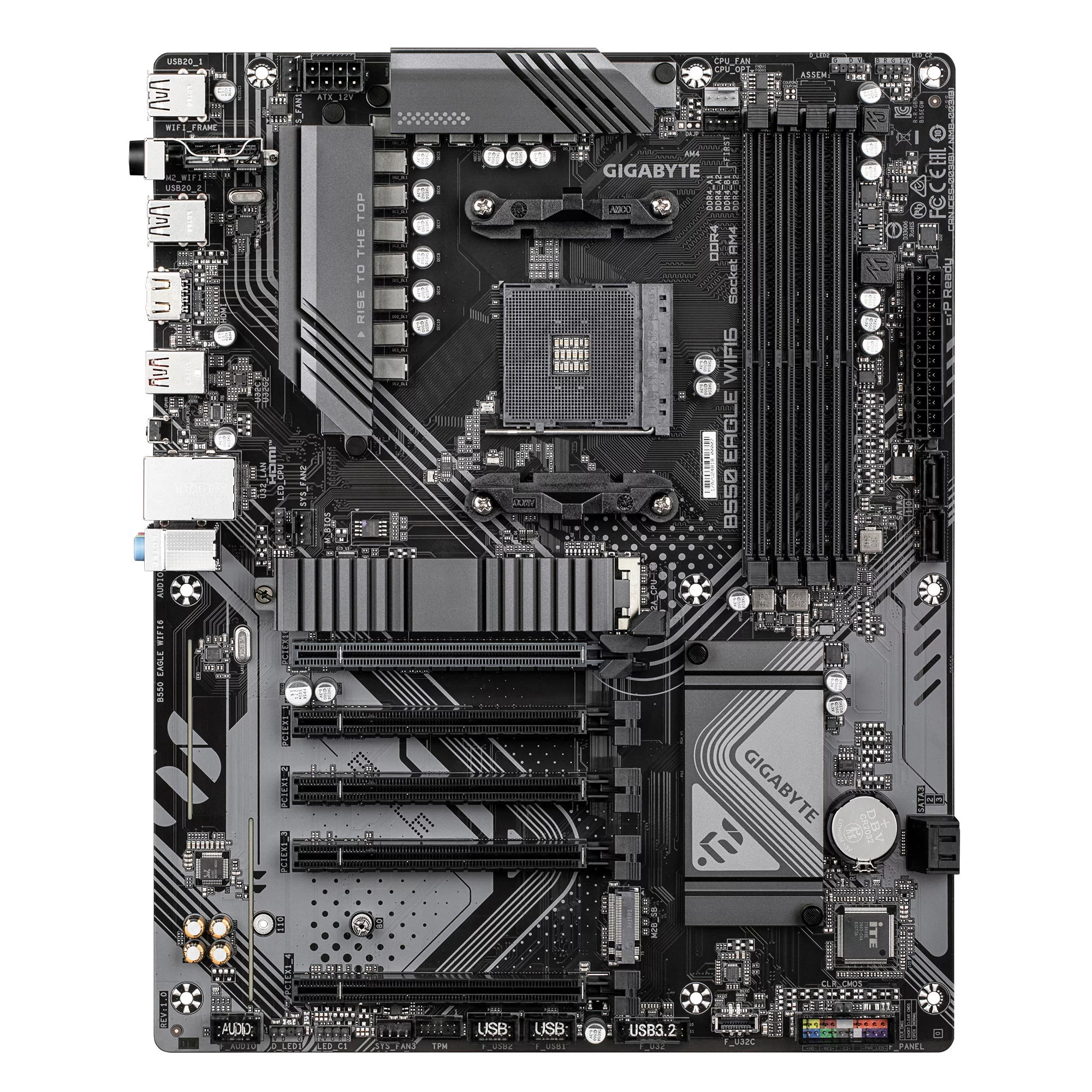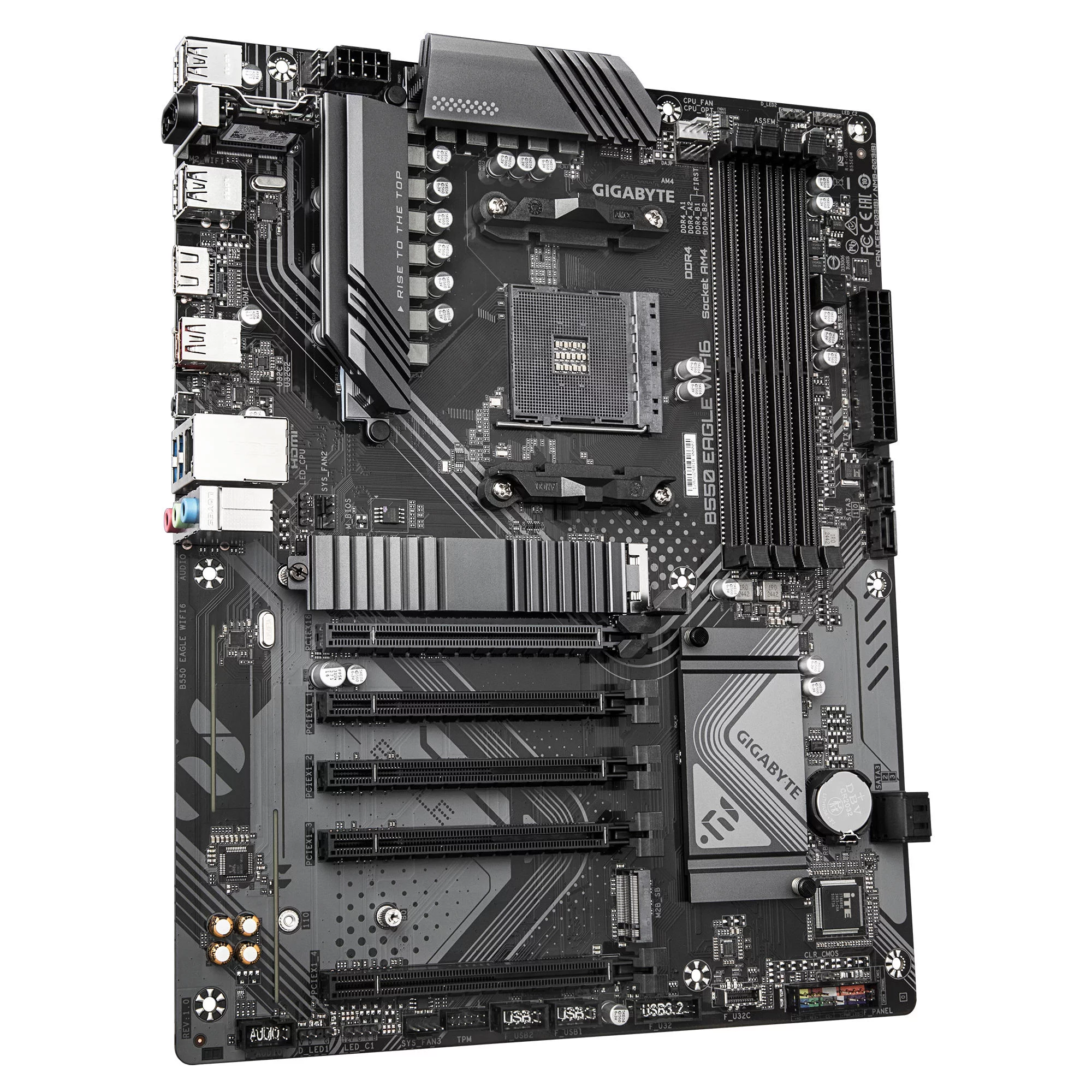 Материнська плата GIGABYTE B550 EAGLE WIFI6 формату ATX для процесорів AMD Ryzen (Socket AM4). Оснащена чипсетом B550, підтримує до 128 ГБ DDR4 у 4 слотах, два M.2 для SSD, 4 SATA, PCIe 4.0/3.0, HDMI, а також сучасні інтерфейси USB. Має вбудований Wi-Fi 6, Bluetooth 5.3, гігабітний LAN та аудіо Realtek 7.1. LED-підсвічування RGB Fusion та Q-Flash Plus забезпечують зручність у використанні.