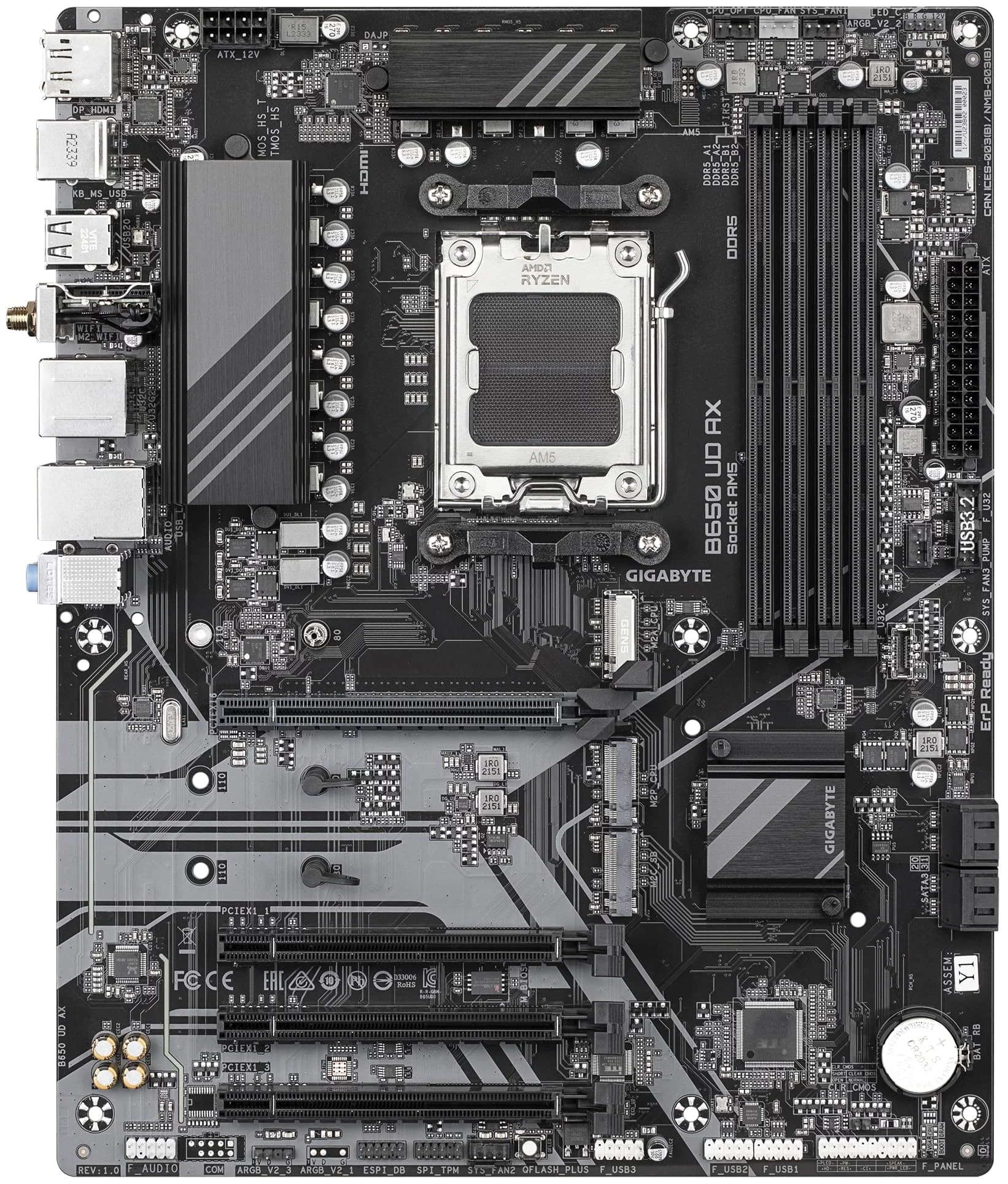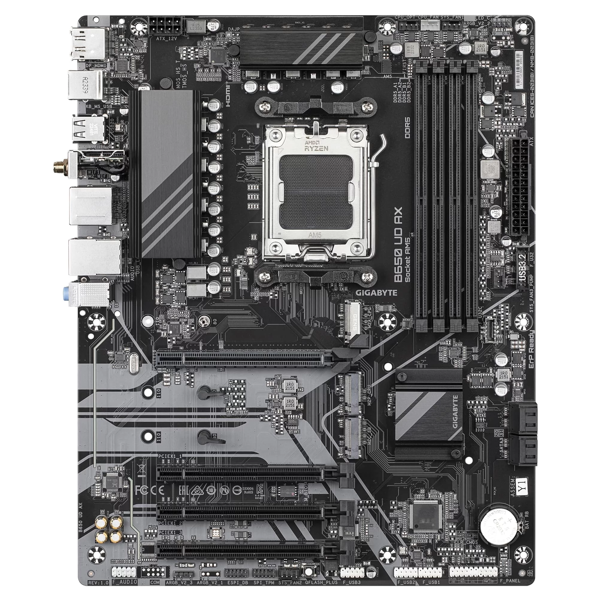 Материнська плата GIGABYTE B650 UD AX - надійне рішення для сучасних ПК на базі процесорів AMD Ryzen 7000/8000/9000. Підтримує DDR5 пам’ять до 256 ГБ із тактовою частотою до 8000 МТ/с (OC), що забезпечує високу продуктивність. Для розширення графічних можливостей є слот PCIe 4.0 x16. Зберігання даних реалізується через три M.2 PCIe 5.0/4.0 слоти та чотири SATA 6 Гбіт/с.