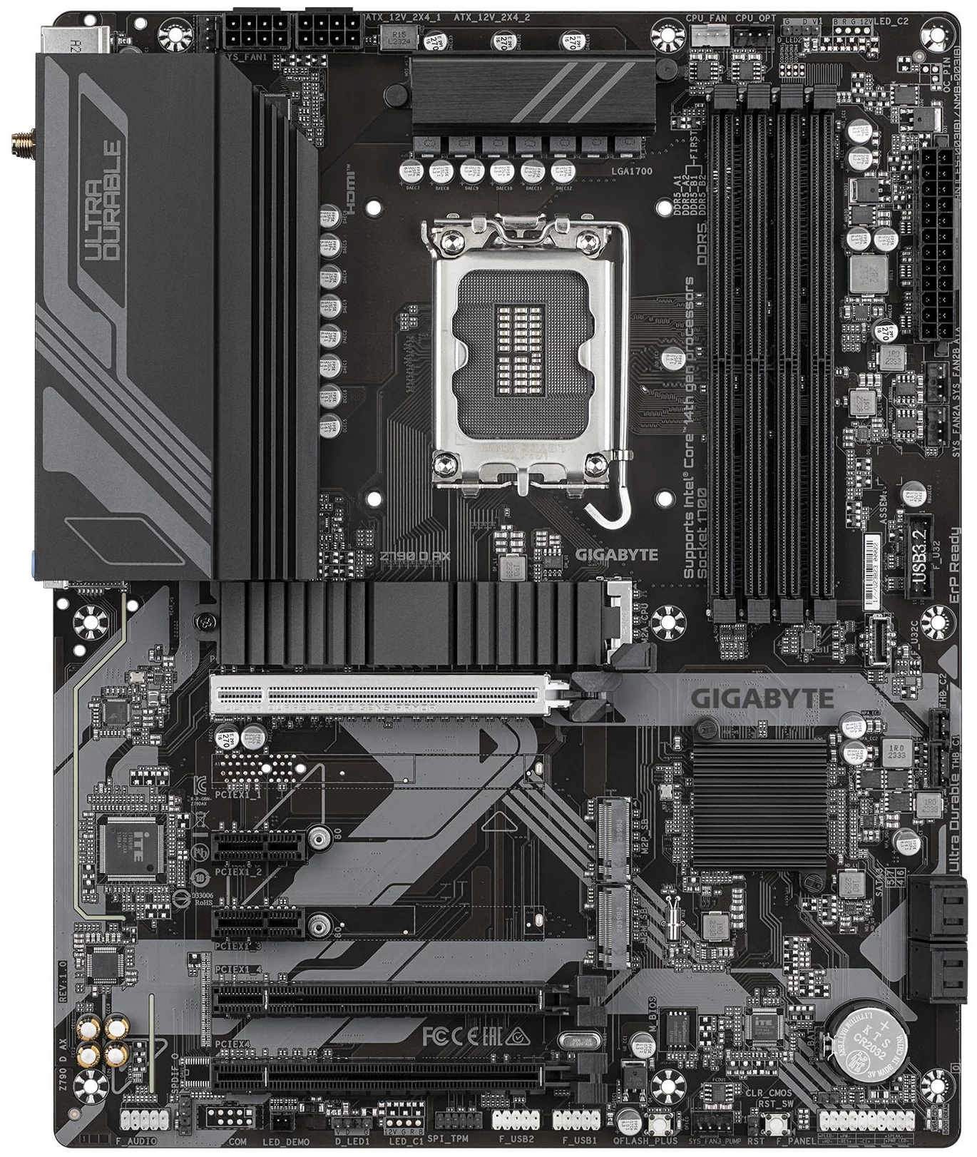 Материнська плата GIGABYTE Z790 D AX – потужне ATX-рішення для процесорів Intel 12–14 покоління з підтримкою DDR5 до 7600 МГц (OC) і обсягом до 256 ГБ. Оснащена слотами PCIe 5.0 і PCIe 4.0, трьома M.2 для SSD, 2.5G LAN, Wi-Fi 6E та Bluetooth 5.3. Пропонує HDMI 2.1 і DisplayPort, 7.1-канальний звук, сучасні USB-порти (включно з USB-C Gen2), підтримку RAID і RGB.