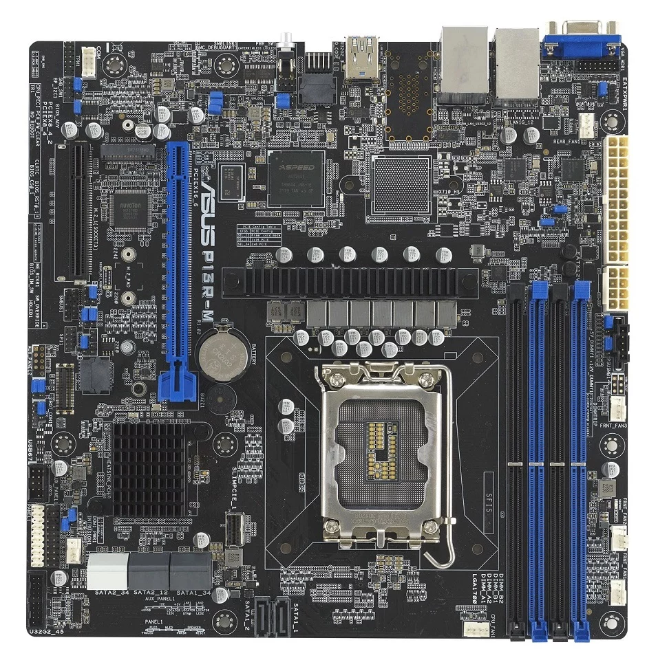 ASUS P13R-M – це серверна материнська плата формату microATX з роз’ємом LGA1700 і чипсетом Intel C262, що підтримує процесори Intel Xeon E, Xeon 6300 та Pentium. Має 4 слоти DDR5 (до 128 ГБ), розширення через PCIe 5.0 x16 та PCIe 4.0 x8, а також підтримку сховища через 8 портів SATA3 і M.2 NVMe/SATA.