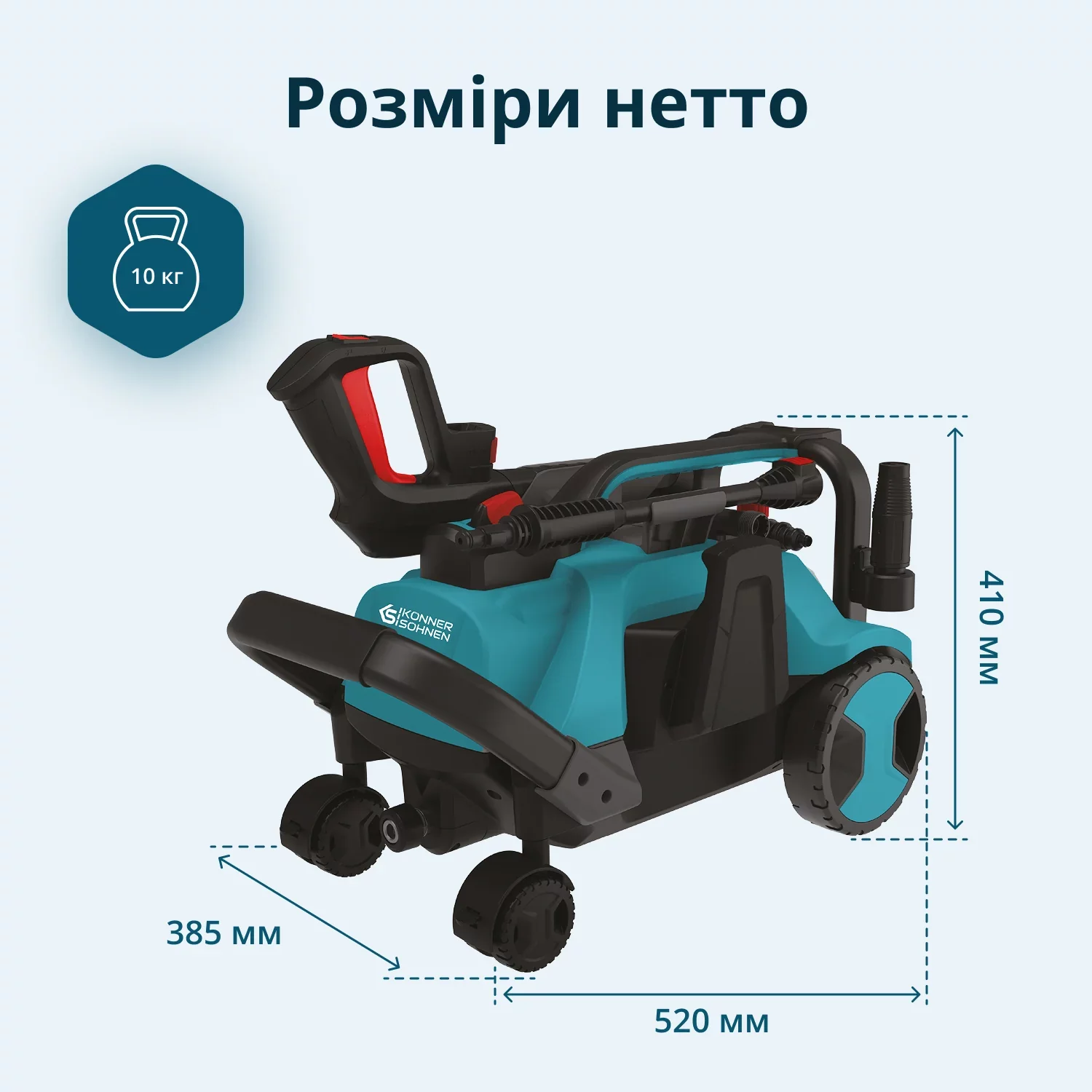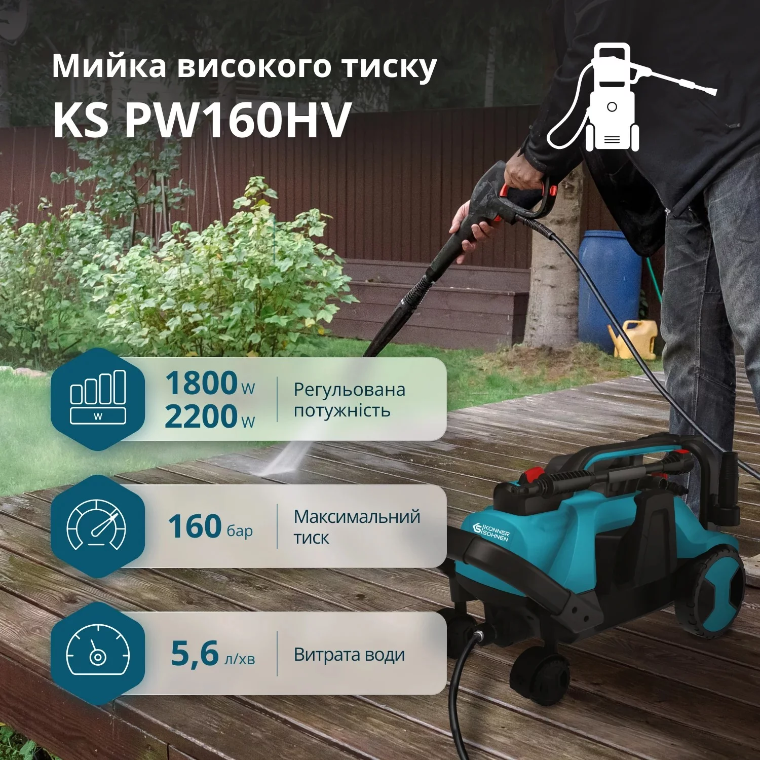 Мийка високого тиску Kоnner & Sоhnen® KS PW160HV — зручне рішення для очищення авто, доріжок, фасадів та садового інвентарю. Два робочі положення (горизонтальне/вертикальне), регулювання потужності 1800–2200 Вт, вбудований піноутворювач збільшеного об’єму й система Start/Stop забезпечують ефективну, контрольовану роботу. Подовжений 8-метровий шланг дає широкий радіус дії.