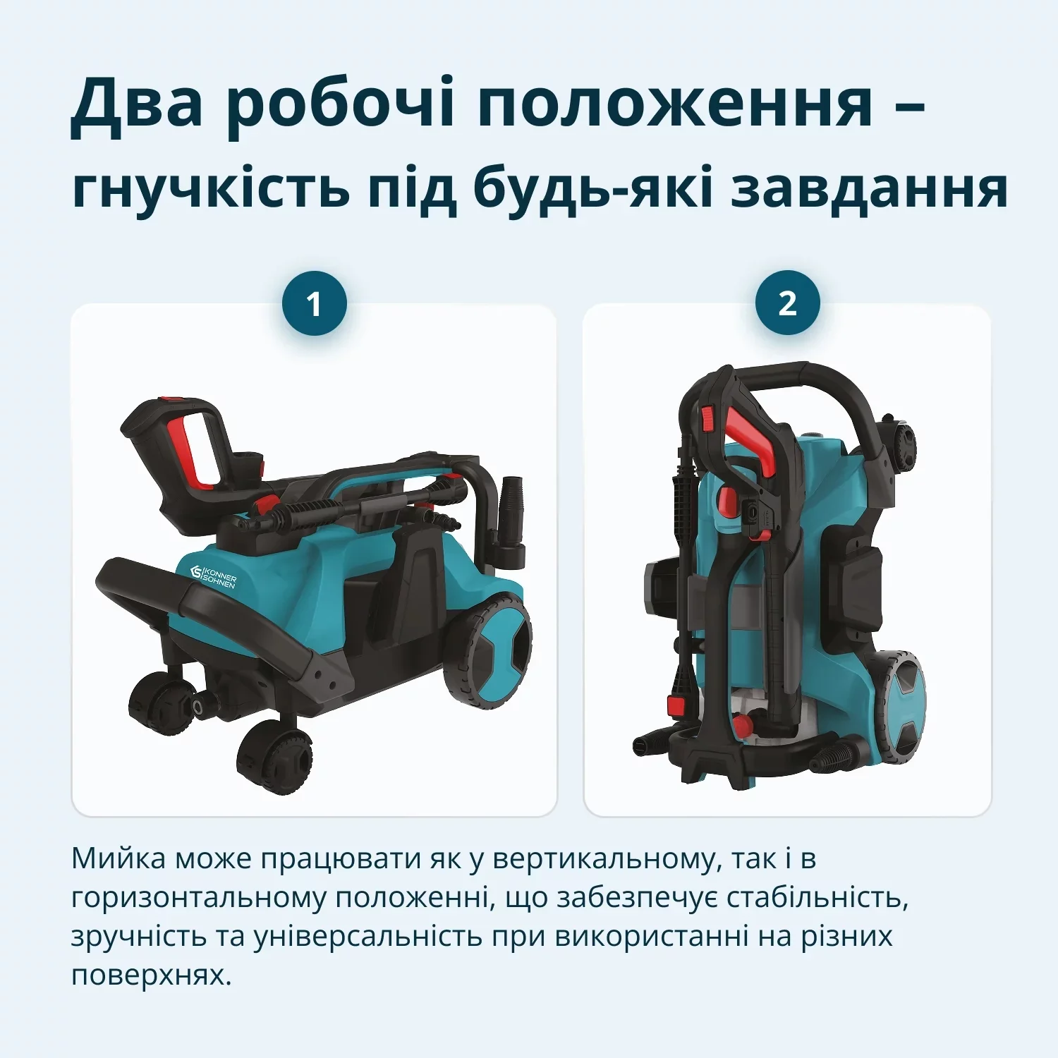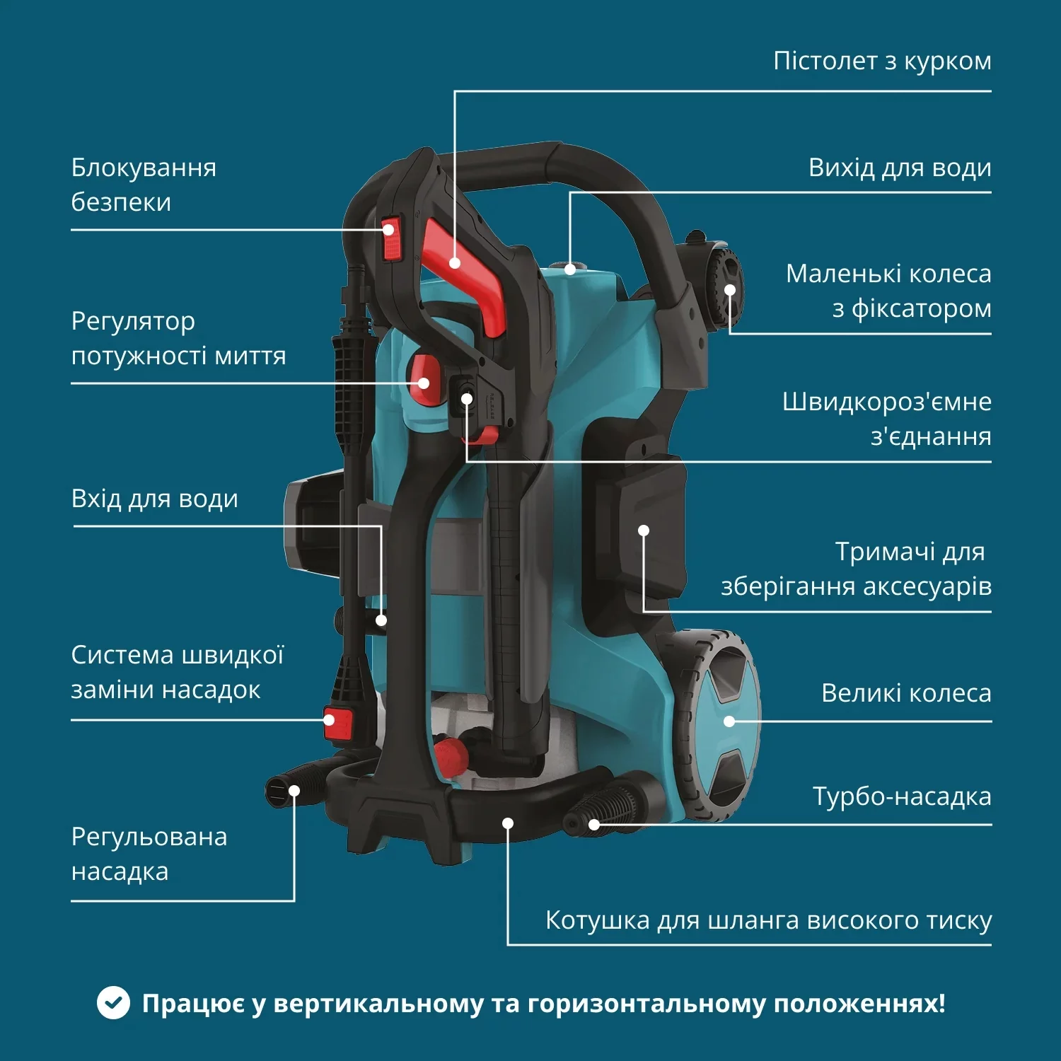 зберігання аксесуарів на мийці, регулювання потужності, система автоматичного Start/Stop, 2 робочі положення: горизонтальне та вертикальне