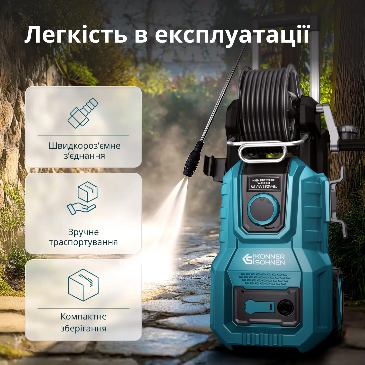Мийка високого тиску Konner&Sohnen KSPW160V-BL — ефективний інструмент для очищення автомобіля, тротуарної плитки, фасадів, садового інвентаря та іншого обладнання. Її можна використовувати як у побуті, так і для напівпрофесійних завдань. Цей пристрій поєднує потужність, довговічність і зручність, дозволяючи досягати високого рівня чистоти за мінімальний час і зусилля.