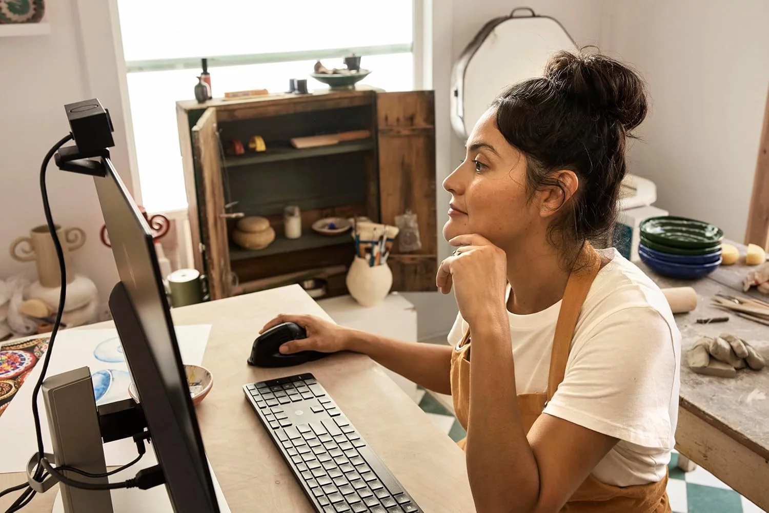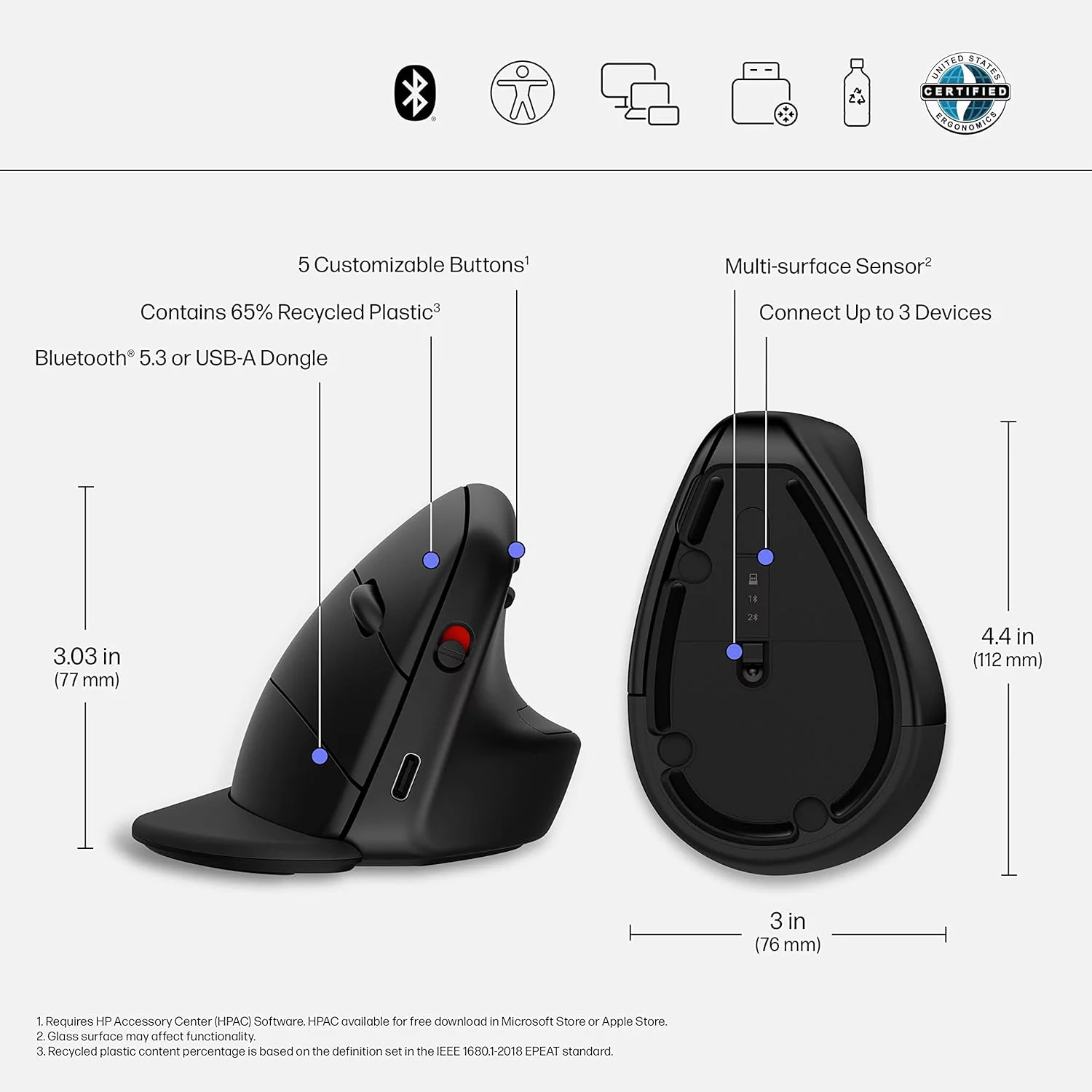 HP 920 Ergonomic Vertical Mouse (6H1A4AA) — інноваційна миша для комфортної та продуктивної роботи. Вона має вертикальний дизайн, що забезпечує природне положення руки та знижує напруження м’язів на 12%. Підключення можливе через USB-A, Bluetooth 5.3 або бездротовий донгл, дозволяючи одночасно працювати з трьома пристроями. Миша оснащена сенсором для роботи на різних поверхнях, п’ятьма програмованими кнопками та батареєю, яка працює до 16 тижнів на одному заряді. Знімна підставка для зап’ястя додає додатковий комфорт. Корпус виготовлений із 65% переробленого пластику