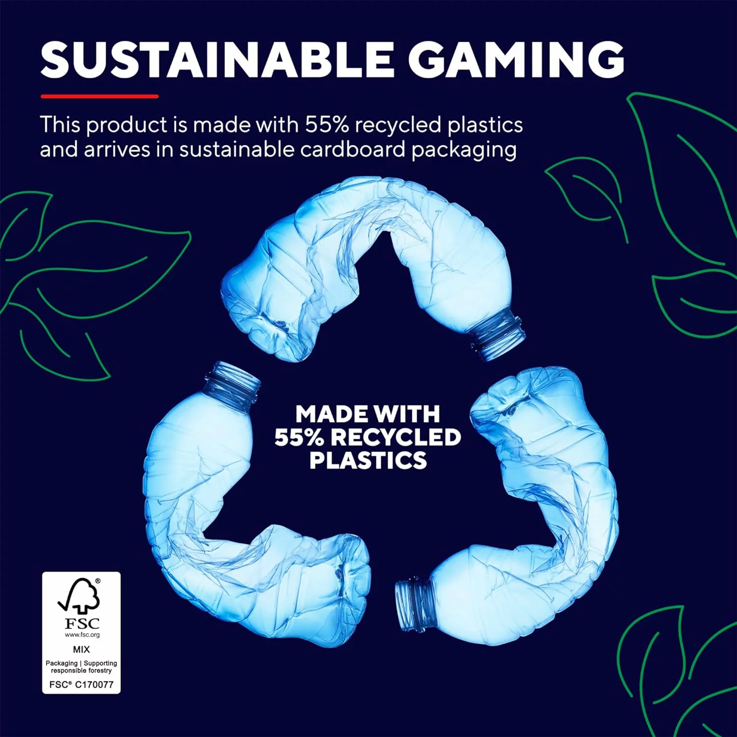 на 55 % виготовлений із переробленого пластику, перемикачі Kailh витримують до 80 мільйонів натискань, повне RGB-підсвічування 3 зон з 16,8 мільйона колірних комбінацій для стильної гри, Тефлонові накладки