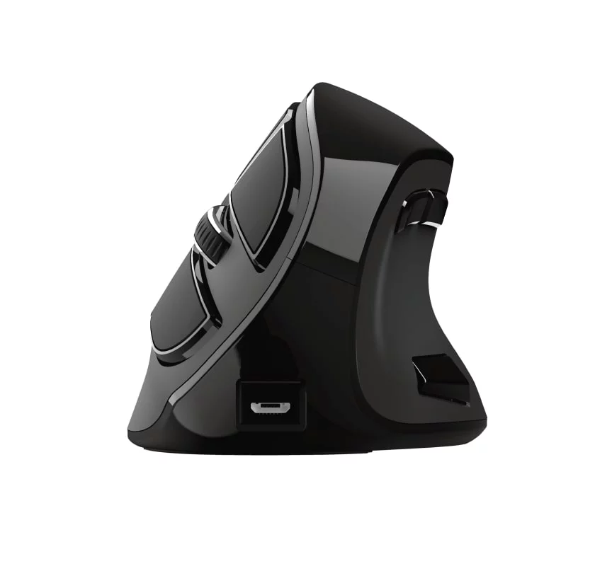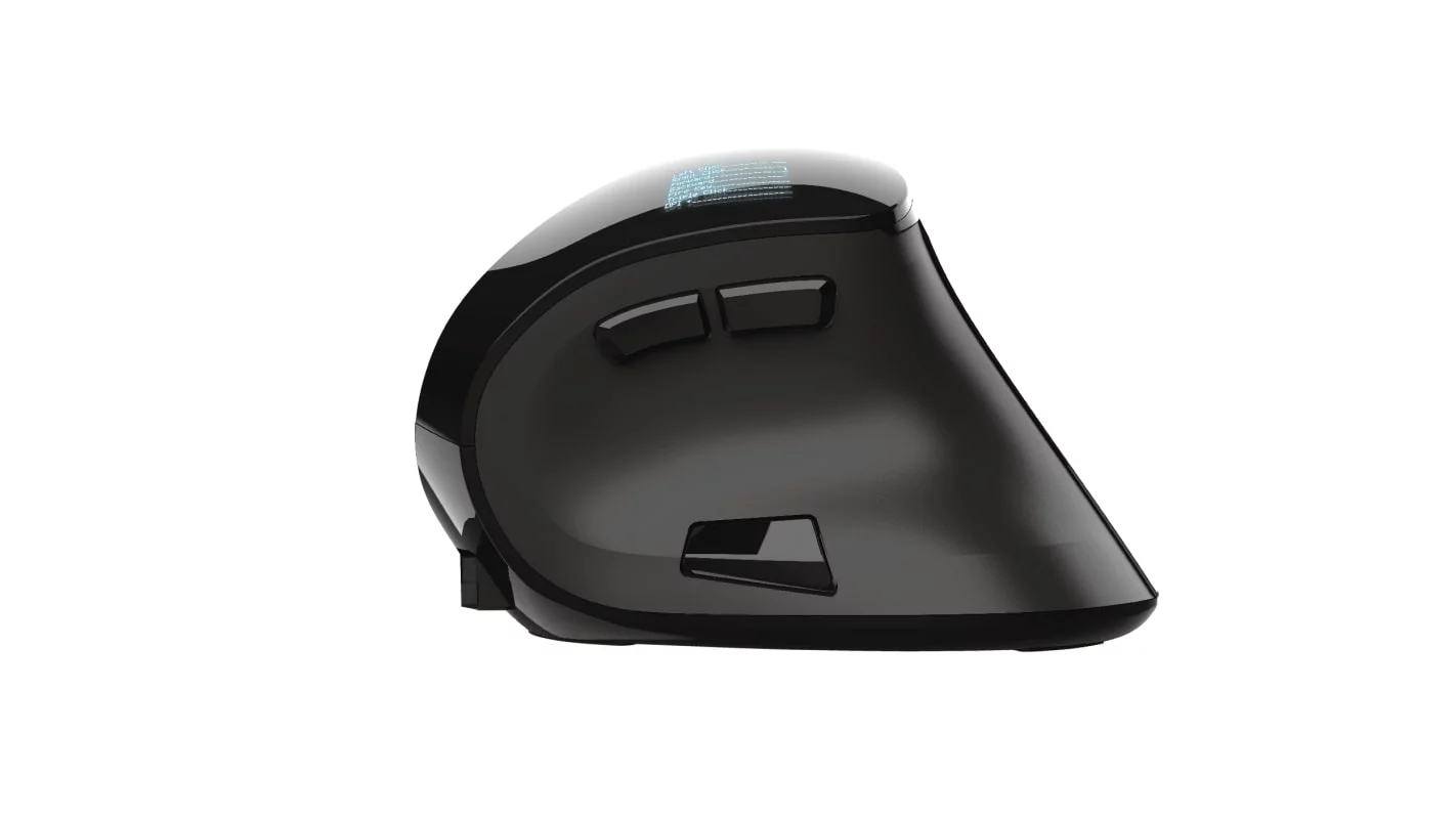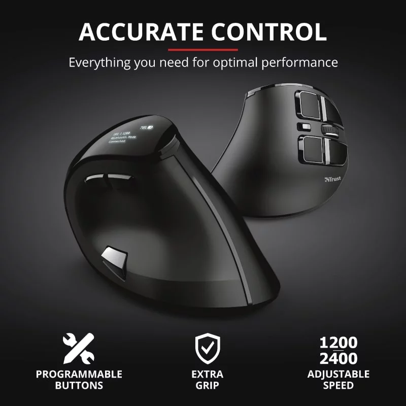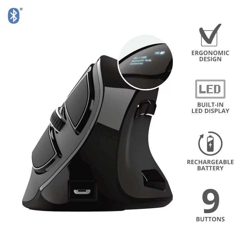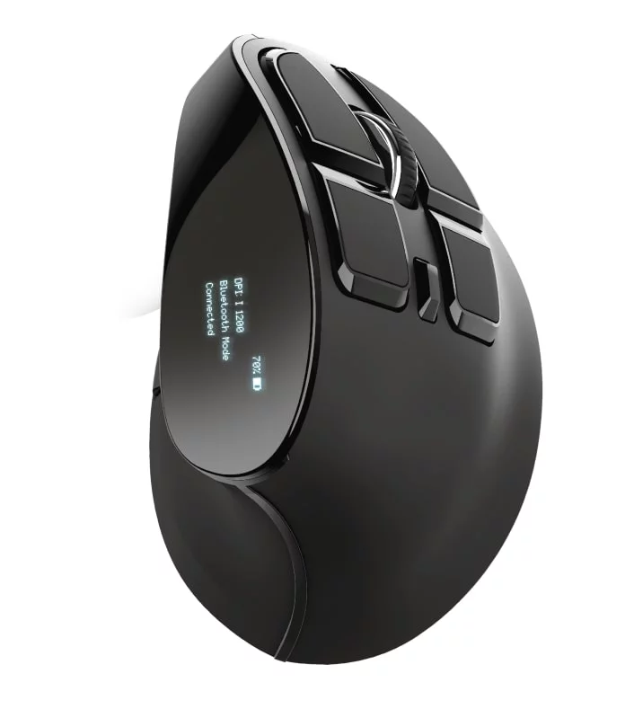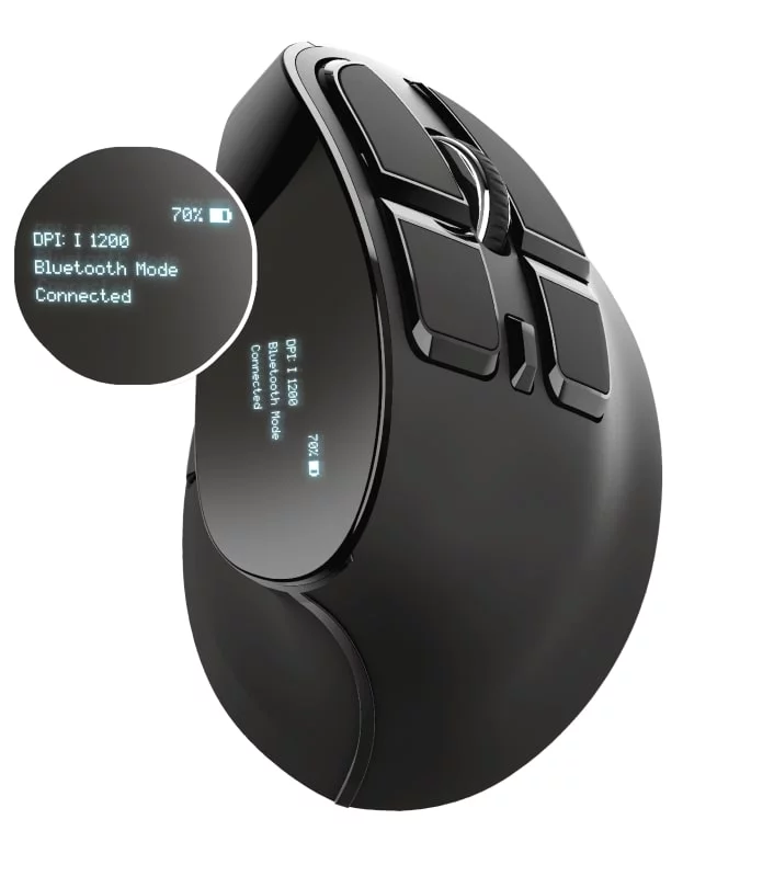 Бездротова миша з цифровим екраном і ергономічним похилим корпусом для максимальної зручності використання. Trust Voxx Rechargeable Ergonomic Wireless Mouse — це бездротова миша з вертикальним дизайном, що забезпечує зручну роботу без напруження зап'ястя та руки. Вона підтримує як Bluetooth, так і 2.4GHz RF з'єднання, має 9 програмованих кнопок та можливість регулювання DPI в діапазоні від 1200 до 2400. Спеціальний LED-дисплей показує рівень заряду, режим підключення та поточні налаштування DPI. Завдяки вбудованому акумулятору, миша легко підзаряджається через USB, а її зручний дизайн робить роботу тривалою та комфортною(
