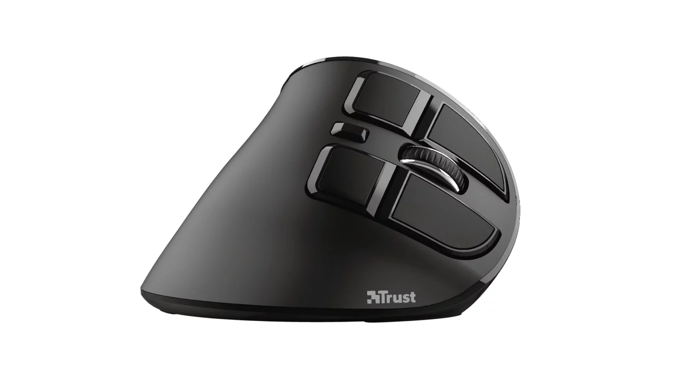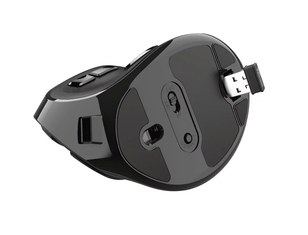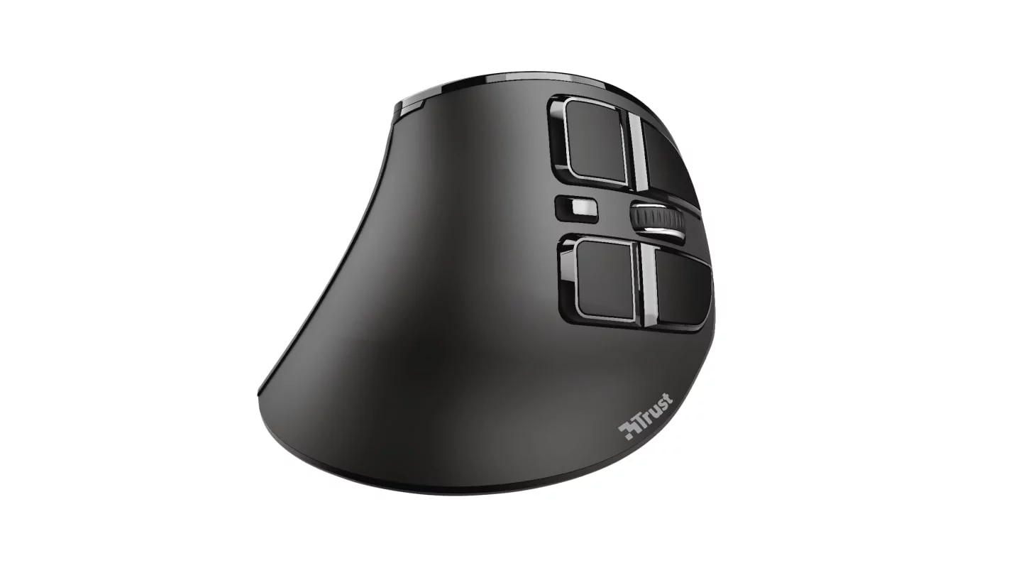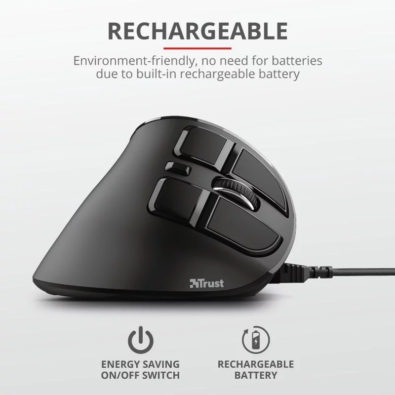 Бездротова миша з цифровим екраном і ергономічним похилим корпусом для максимальної зручності використання. Trust Voxx Rechargeable Ergonomic Wireless Mouse — це бездротова миша з вертикальним дизайном, що забезпечує зручну роботу без напруження зап'ястя та руки. Вона підтримує як Bluetooth, так і 2.4GHz RF з'єднання, має 9 програмованих кнопок та можливість регулювання DPI в діапазоні від 1200 до 2400. Спеціальний LED-дисплей показує рівень заряду, режим підключення та поточні налаштування DPI. Завдяки вбудованому акумулятору, миша легко підзаряджається через USB, а її зручний дизайн робить роботу тривалою та комфортною(