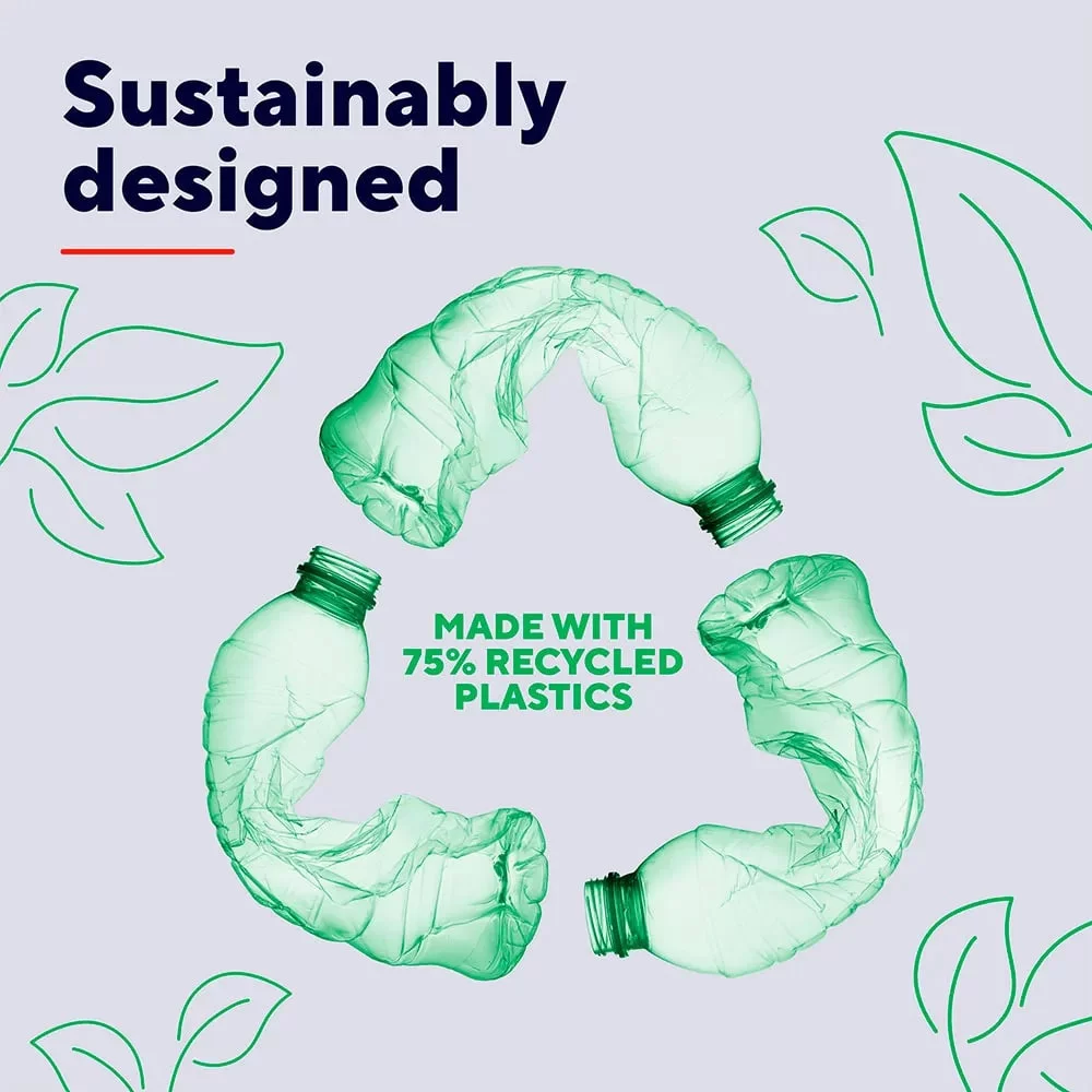 До 12 місяців роботи від батареї, Легко підключайте до 3 пристроїв одночасно, На 75% виготовлена з переробленого пластику та поставляється в упаковці без пластику
