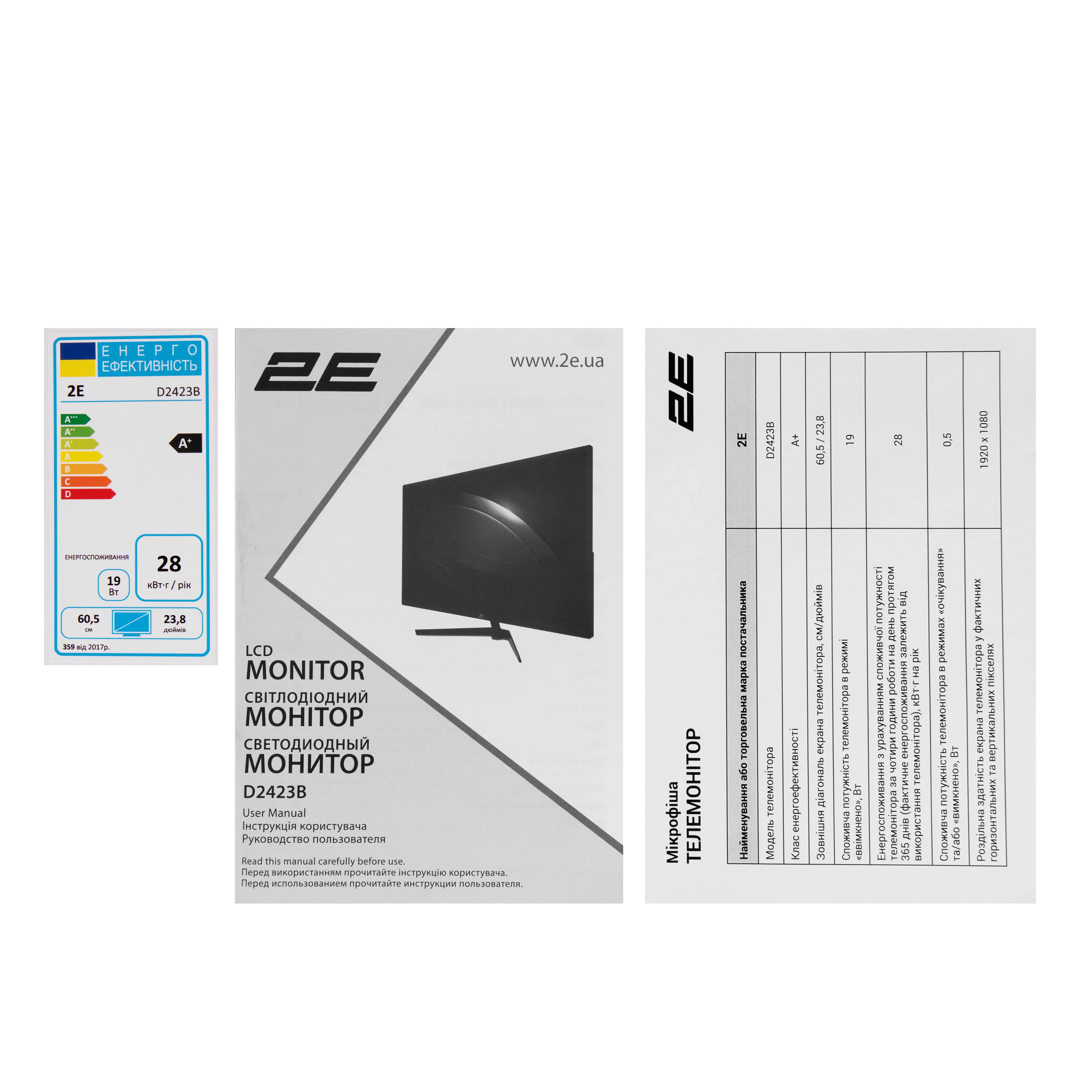 Модель 2E D2423B із діагоналлю екрана 23,8″ є вдалим вибором для тих, хто шукає якісний монітор із новітніми функціями. IPS-матриця має роздільну здатність 1 920 × 1 080 пікселів і співвідношення сторін 16:9. Яскравість моделі становить 250 кд/м², а контрастність – 1 000:1. Зі швидкістю оновлення зображення 75 Гц і часом відгуку 5 мс відтворення відео та ігор буде рівномірним із багатою динамікою. Кути огляду: 178°/178°.