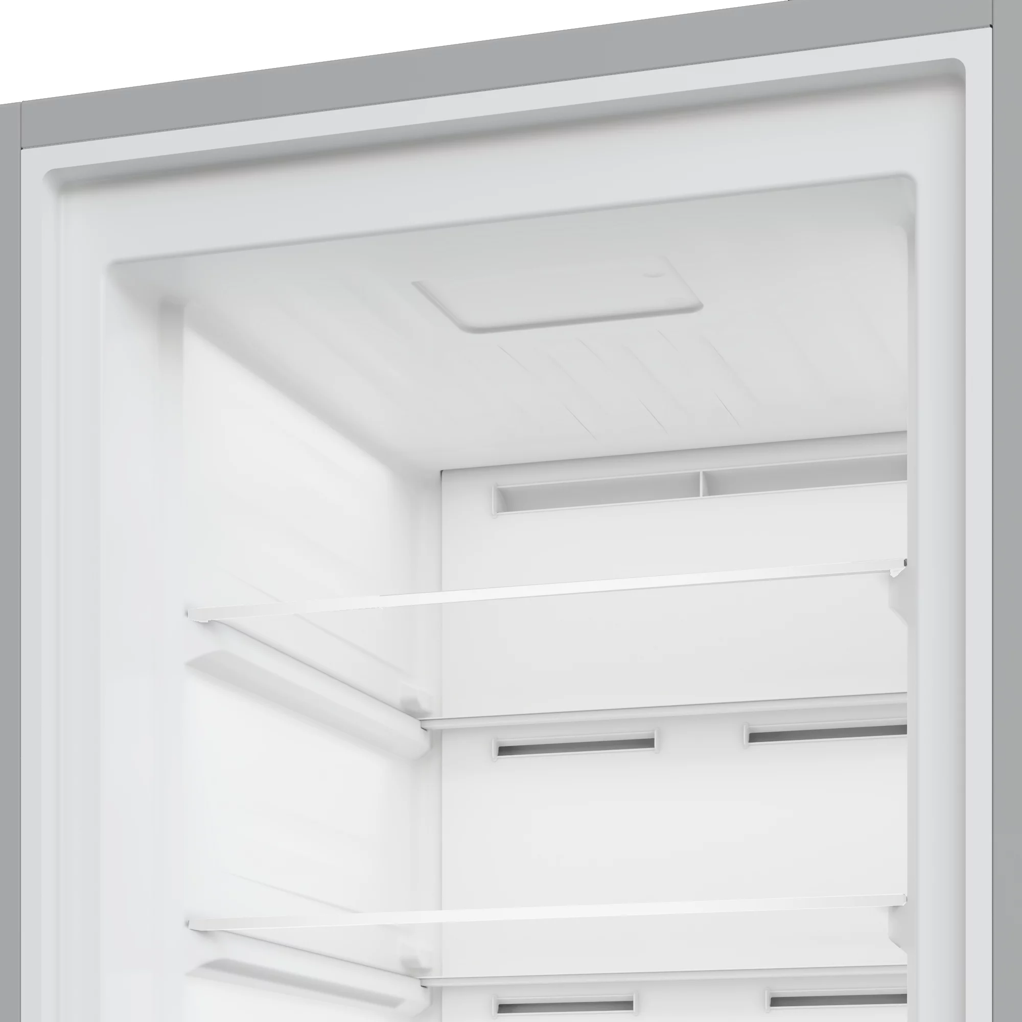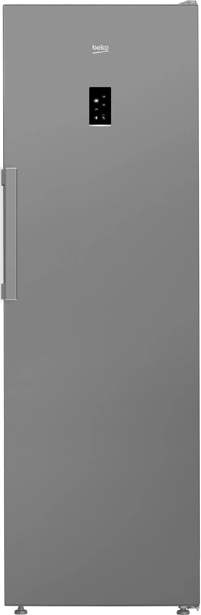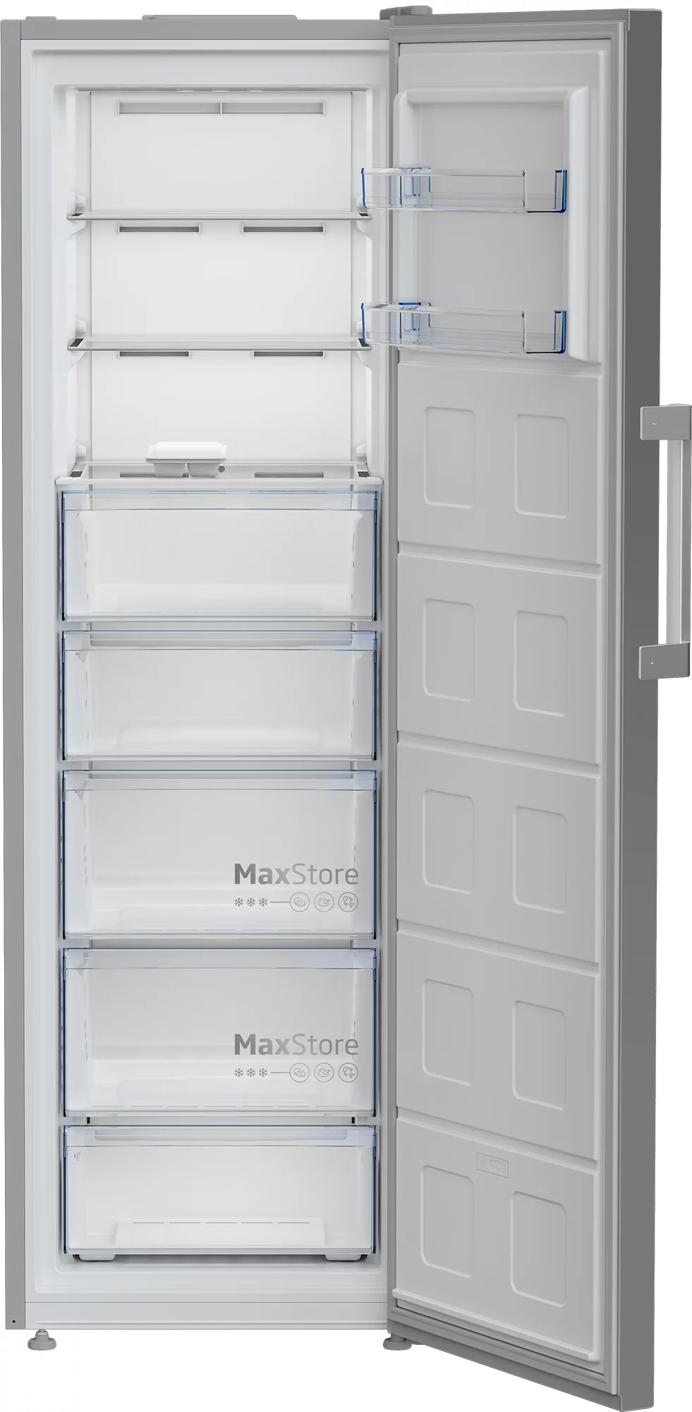 Вертикальна морозильна камера з об’ємом 286 л, класом енергоефективності A+ і системою No Frost — без інею й крижаної кірки. Максимальна продуктивність — до 14 кг продуктів на добу. Вбудований електронний дисплей і сигнал відкритих дверцят спрощують користування. Захист від дітей, можливість перевішення дверей, LED-освітлення й модуль FreezerGuard — гарантія стабільної роботи навіть за температур до –15 °C. За рік споживає близько 332 кВт·год, працює тихо (38 дБ). Висота ~186 см, ширина 60 см, глибина 71 см — підходить для кухонь із обмеженим простором. Надійний вибір для великої сім’ї чи кафе.