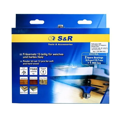 Набір фрез S&R для твердої деревини 12 шт. 216904012 - комплект фрез з 8-мм хвостовиком для роботи з дерев'яними заготовками. Поставляється у зручному футлярі, виконаному з дерева.