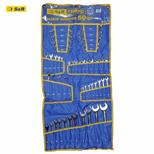 Набір ключів S&R Tempo 50 шт у тканинному чохлі-скрутці - призначений для побутового та професійного використання. Включає ріжкові, накидні та ріжково-накидні (комбіновані) гайкові ключі різних форм (прямі, вигнуті, С-подібні, S-подібні) і діаметрів.