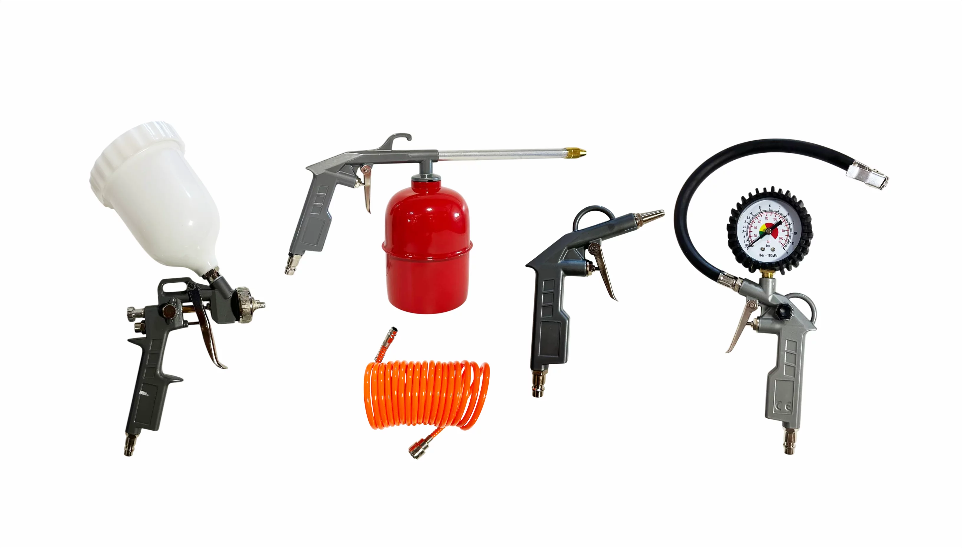 Універсальний набір пневматичних інструментів — ідеальне рішення для фарбування, обслуговування авто та майстерень. Інструменти працюють у широкому діапазоні тиску та повітряного потоку, що забезпечує сумісність з різними типами компресорів і матеріалів. Усі компоненти відрізняються надійністю, ергономікою та технічною збалансованістю.