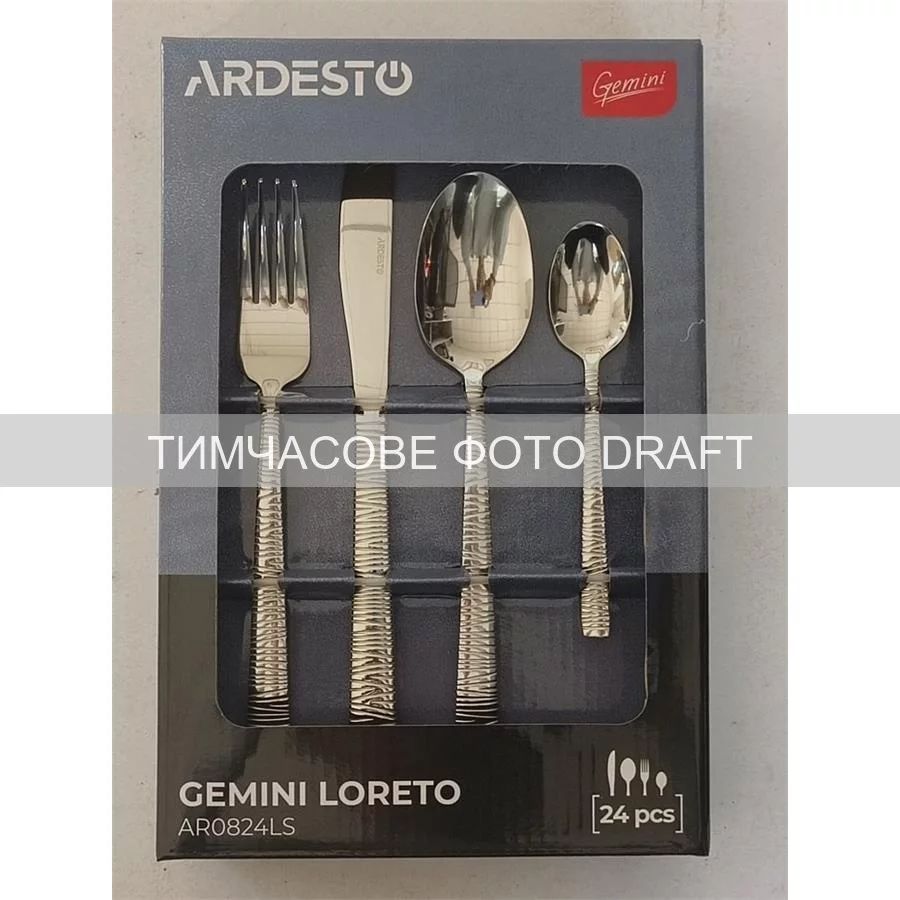 Набір столових приборів ARDESTO Gemini Loreto виготовлено з нержавіючої сталі. У складі – 24 предмети, кожен з яких має продумані пропорції: столові ножі (6 шт., сталь 13/0, 84 г, 226 мм), виделки (42 г, 2,5 мм, 204 мм), столові ложки (46 г, 2,5 мм, 203 мм) і чайні ложки (по 6 шт., сталь 18/0, 19 г, 2 мм, 143 мм). Дзеркальне полірування надає елегантного блиску сервіруванню. Можливість миття в посудомийній машині забезпечує зручність догляду.