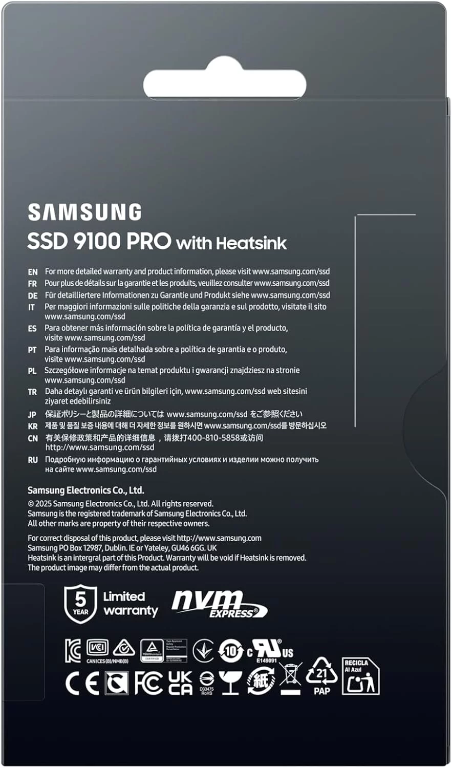 Samsung 9100 PRO 1TB — це надшвидкий SSD нового покоління з інтерфейсом PCIe 5.0, що забезпечує неймовірну швидкість читання до 14 700 МБ/с і запису до 13 300 МБ/с. Завдяки вбудованому радіатору та технології Dynamic Thermal Guard, накопичувач ефективно розсіює тепло, забезпечуючи стабільну роботу навіть під високими навантаженнями. Цей SSD ідеально підходить для геймерів, творців контенту та професіоналів, які працюють з великими обсягами даних, включаючи 4K-відео, 3D-графіку та AI-застосунки. Сумісний з ПК, ноутбуками та PlayStation 5, він пропонує надійність, високу продуктивність та довговічність завдяки використанню V-NAND TLC пам'яті та власного контролера Samsung.