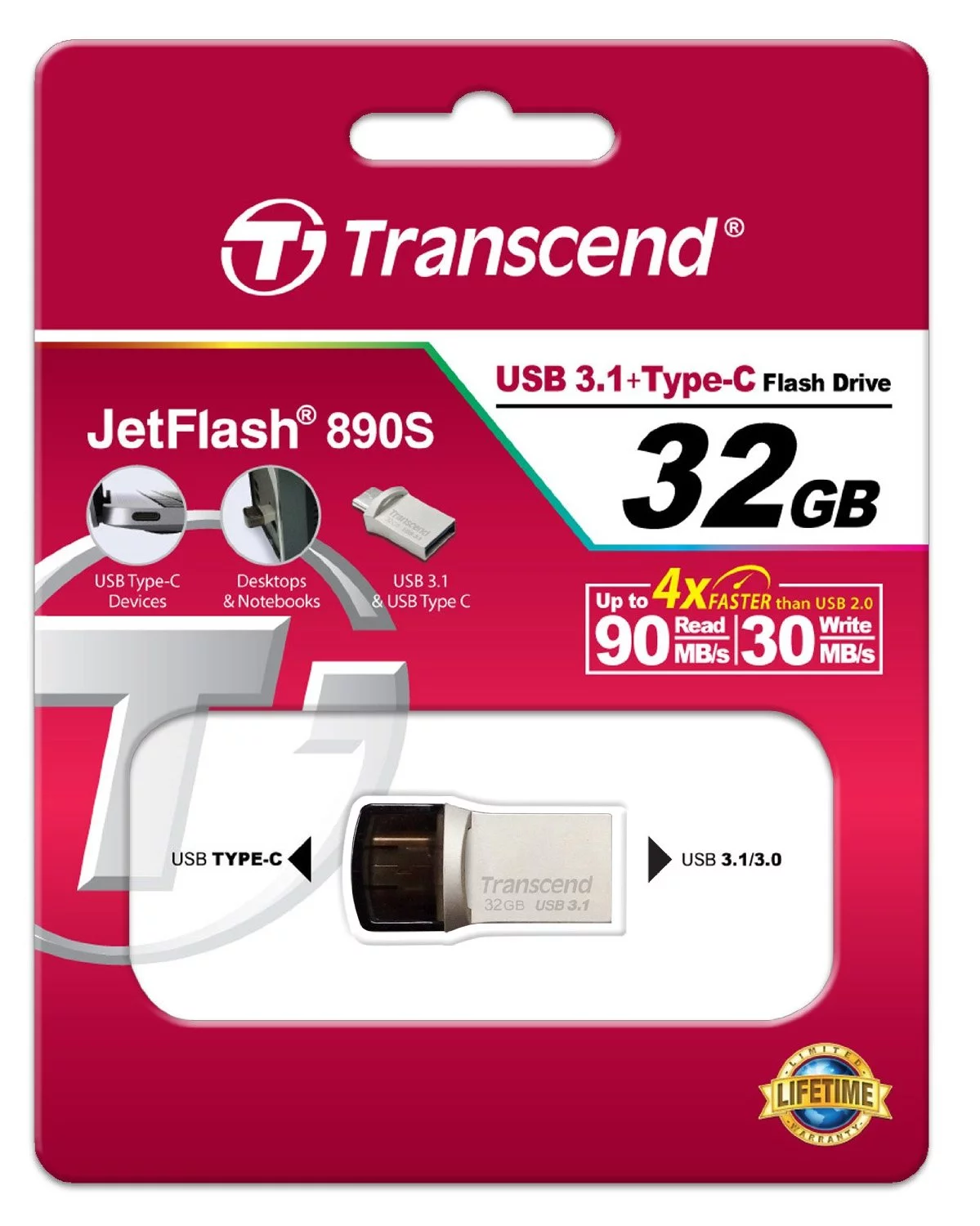 Накопичувач Transcend об'ємом 32 гігабайти з інтерфейсами USB 3.1 Type-A та Type-C. Забезпечує швидкість читання до 90 МБ/с та швидкість запису до 30 МБ/с. Це компактний і універсальний пристрій для зберігання та передачі даних між пристроями з різними портами.