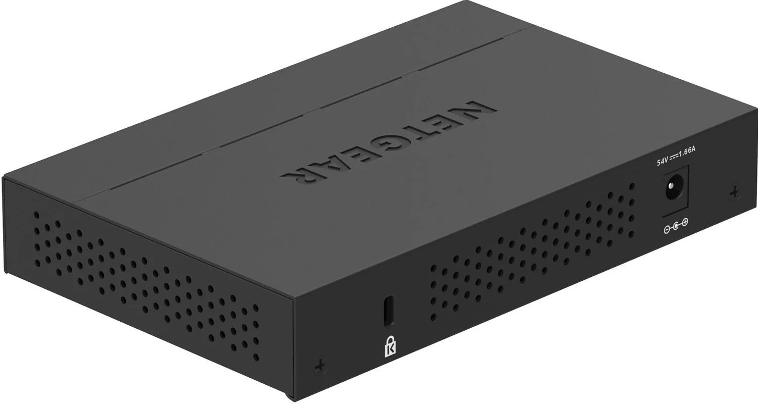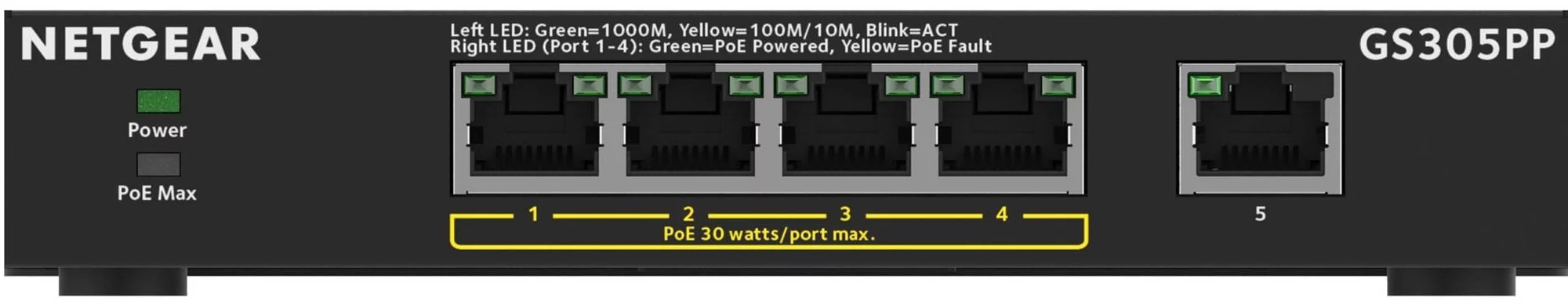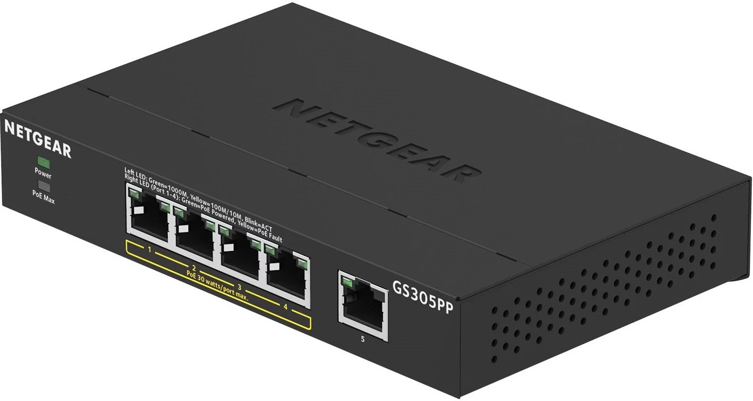 Некерований гігабітний комутатор NETGEAR GS305PP з 5 портами Gigabit Ethernet, у тому числі 4 порти PoE+, із загальним бюджетом потужності 83Вт та фірмовою технологією автоматичного балансу потужності NETGEAR FlexPoE.