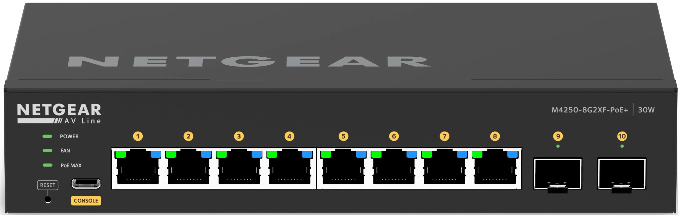 2 x SFP+, 8 x 10/100/1000 Gigabit Ethernet PoE+