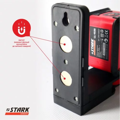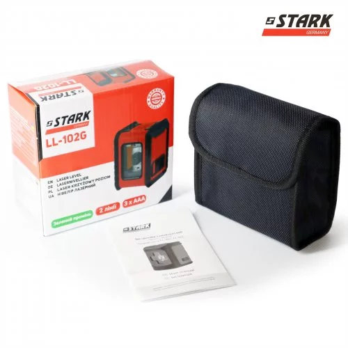 Нівелір лазерний STARK LL-102G 2 лінії – інструмент професійного класу, який будує 2 лінії (вертикальну та горизонтальну). Колір ліній – зелений. Даний інструмент дозволяє позиціонувати предмети ідеально в приміщенні. Може використовуватись під час проведення ремонтних, будівельних робіт, а також у побуті при позиціонуванні декорацій тощо.