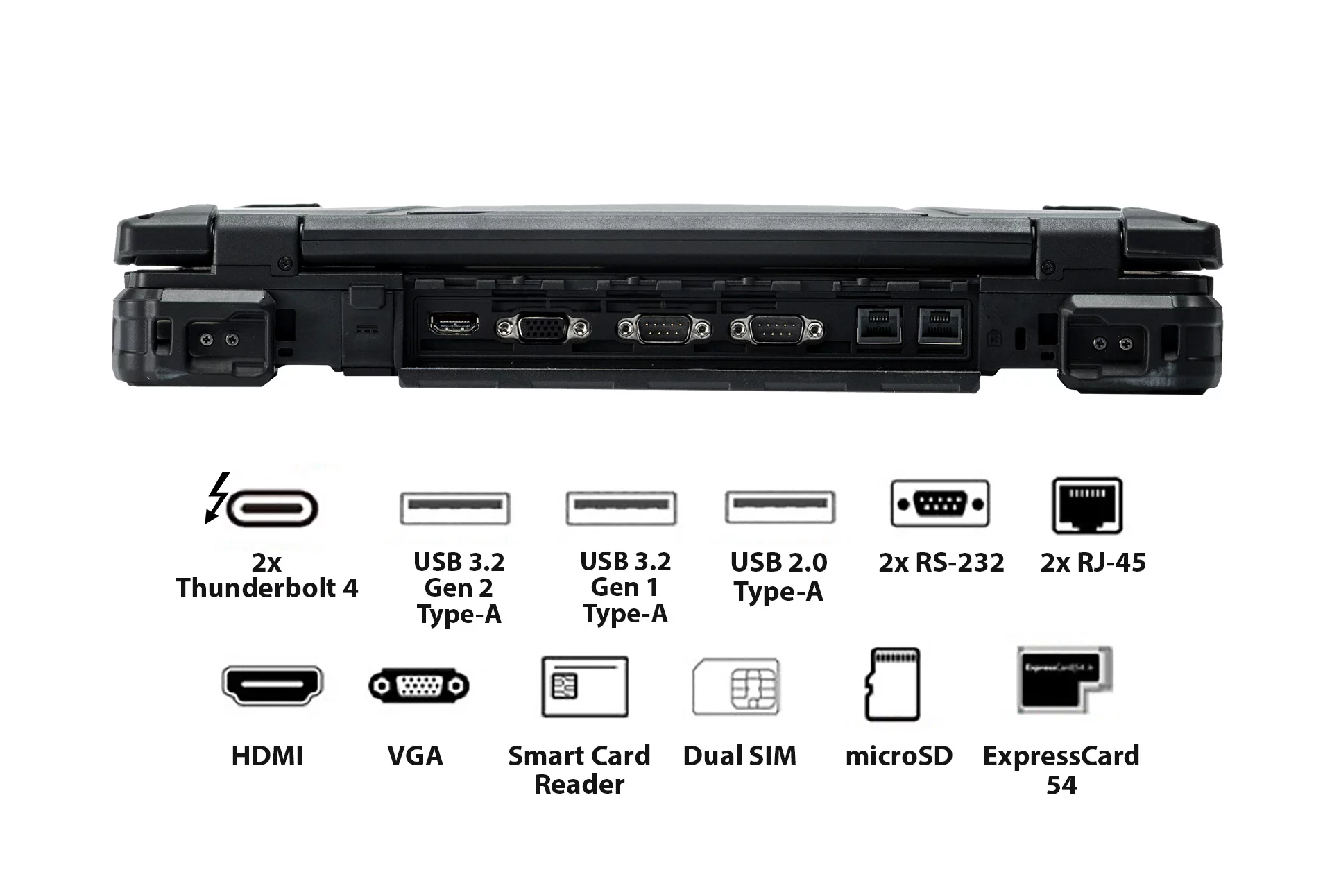 ExpressCard, SIM, Smart Card, VGA, Комбінований аудіопорт, Послідовний порт, Роз`єм для док-станції, 1 HDMI, 1 MicroSD Card Reader, 1 x DC-in, 1 x USB 2.0 (Type A), 1 x USB 3.2 Gen 1 (Type A), 2 x Thunderbolt 4 port, 2 x USB 3.2 Gen 2 (Type A), 10/100/1000 Ethernet