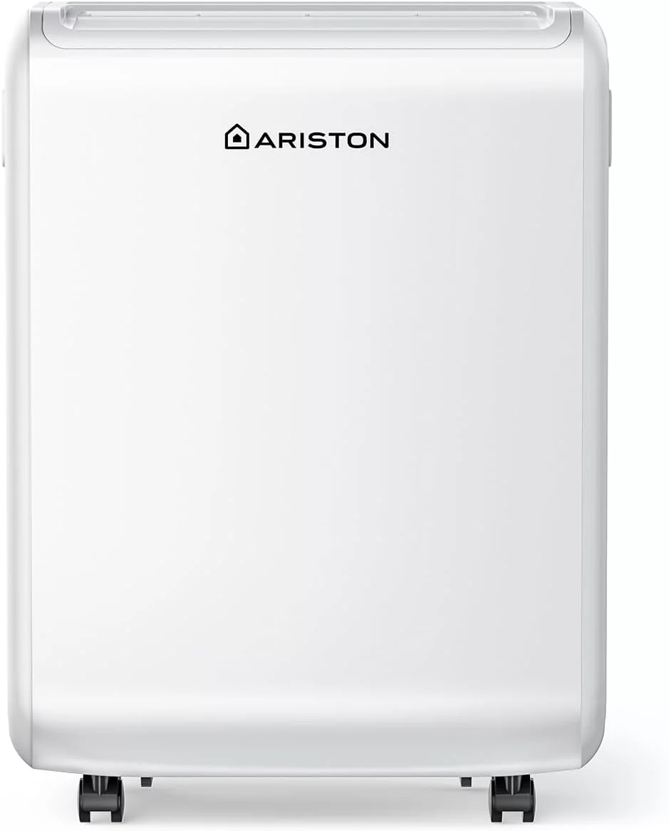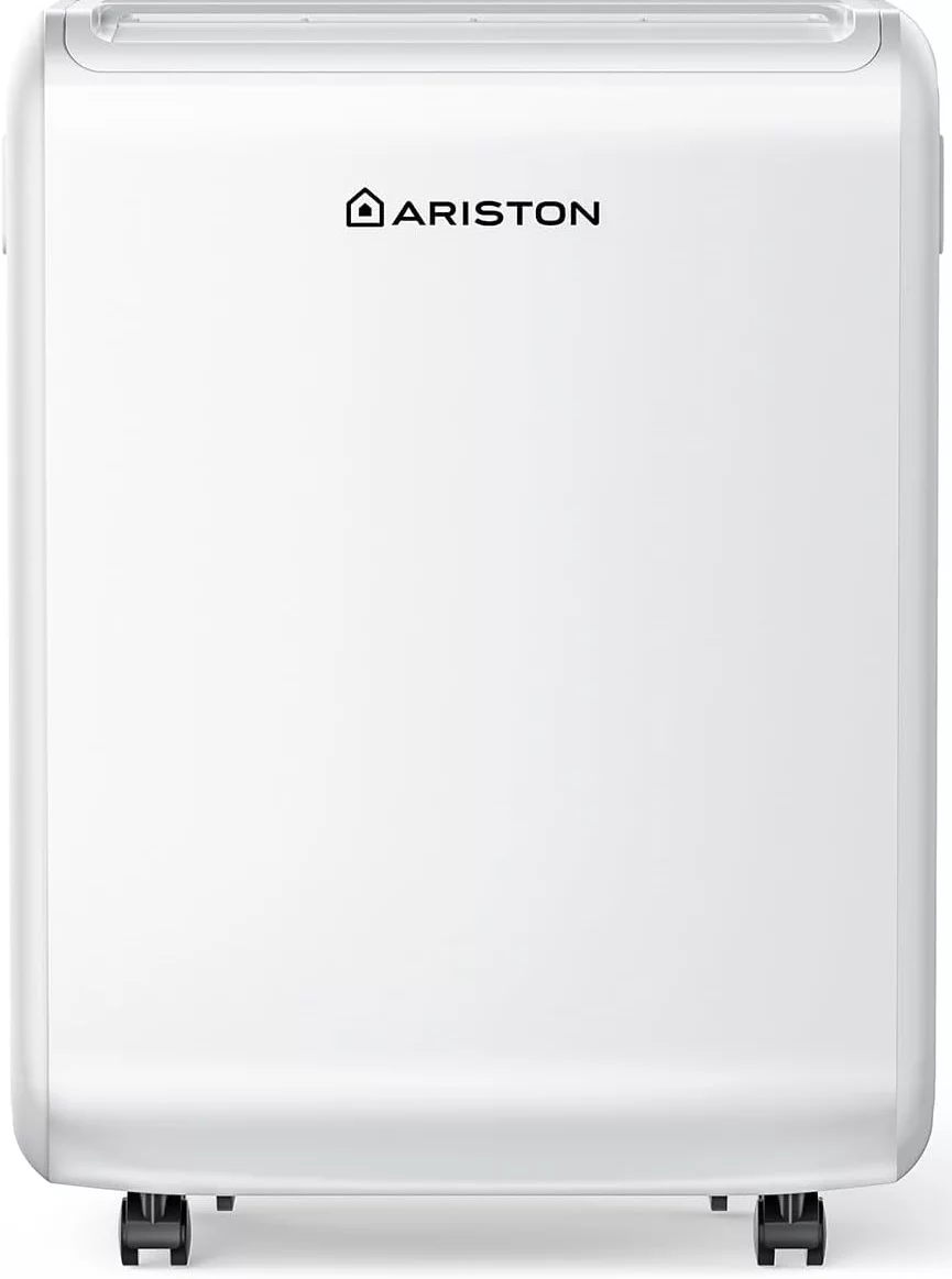 Ariston Deos EVO 12 — компактний побутовий осушувач повітря продуктивністю 12 л/добу для приміщень до 35 м². Оснащений фреоном R290, електронним керуванням, дисплеєм, таймером і гігростатом. Має бак 1,8 л, автовідключення, безперервний злив і колеса для мобільності. Споживає 210 Вт, рівень шуму до 42 дБ. Сірий корпус вагою 12,3 кг ідеально підходить для ванни, квартири чи будинку.