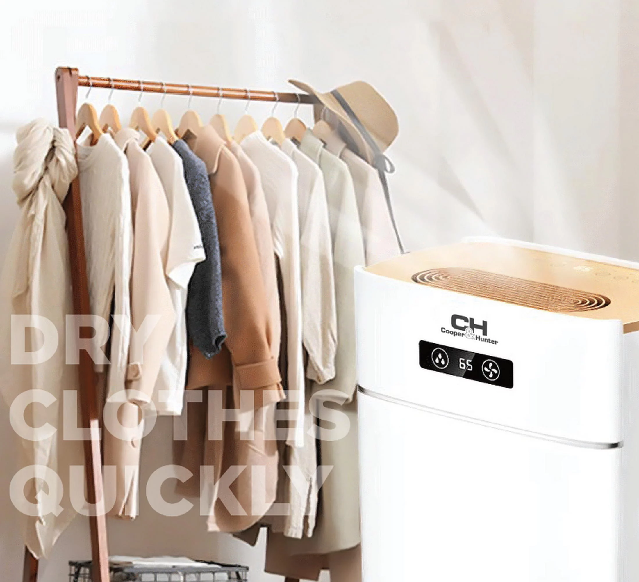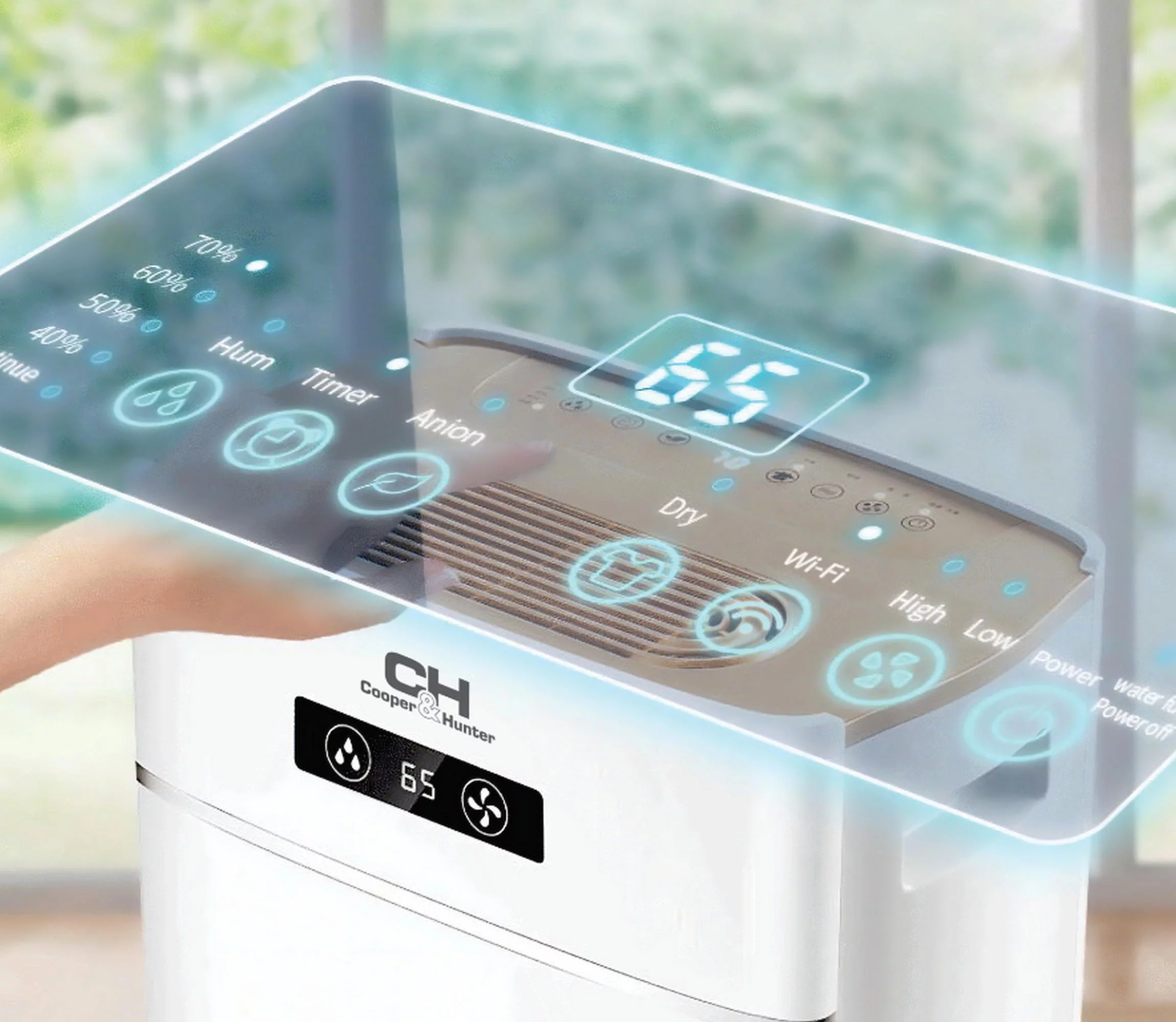 Осушувач повітря Cooper&Hunter CH-D014WD8-30LDWF розрахований на площу до 100 м² та продуктивність 30 л на добу. Прилад оснащений електронним керуванням, LED-дисплеєм, Wi-Fi та таймером на 24 години. Є функція іонізації, режими для різних потреб і резервуар на 5 л з автоматичним вимкненням при наповненні. Завдяки коліщаткам легко переміщується між кімнатами.