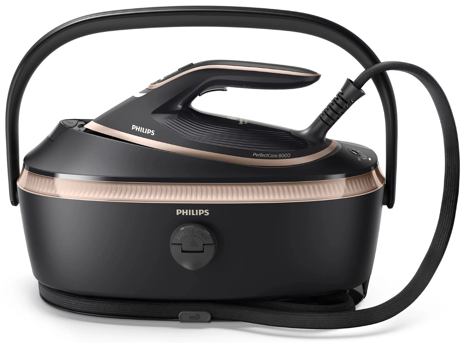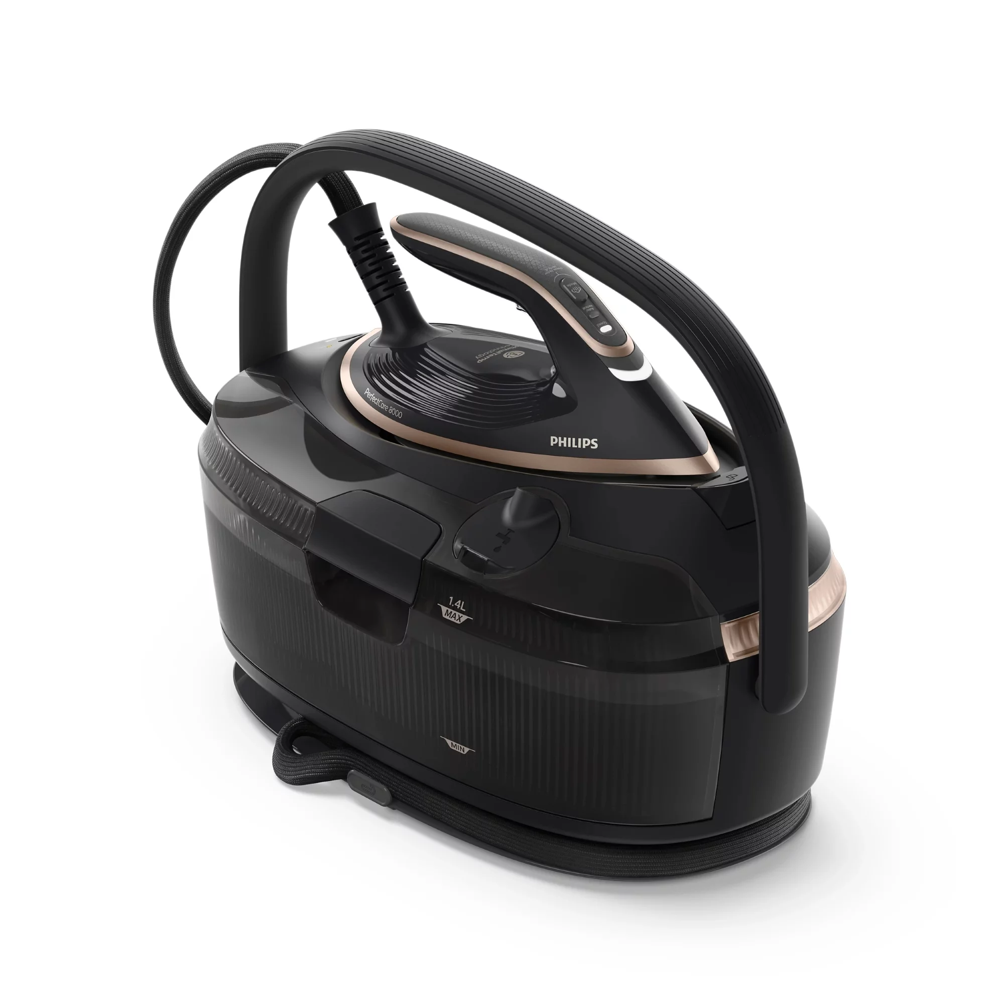 Компактний парогенератор Philips PerfectCare серії 8000 із розумним датчиком руху та технологією OptimalTEMP. Забезпечує до 210 г/хв постійної пари та паровий удар до 850 г, має знімний резервуар на 1,4 л і підошву SteamGlide Elite для легкого ковзання. Передбачено автоматичну подачу пари, вертикальне відпарювання, автовимкнення та зручну ручку для перенесення.