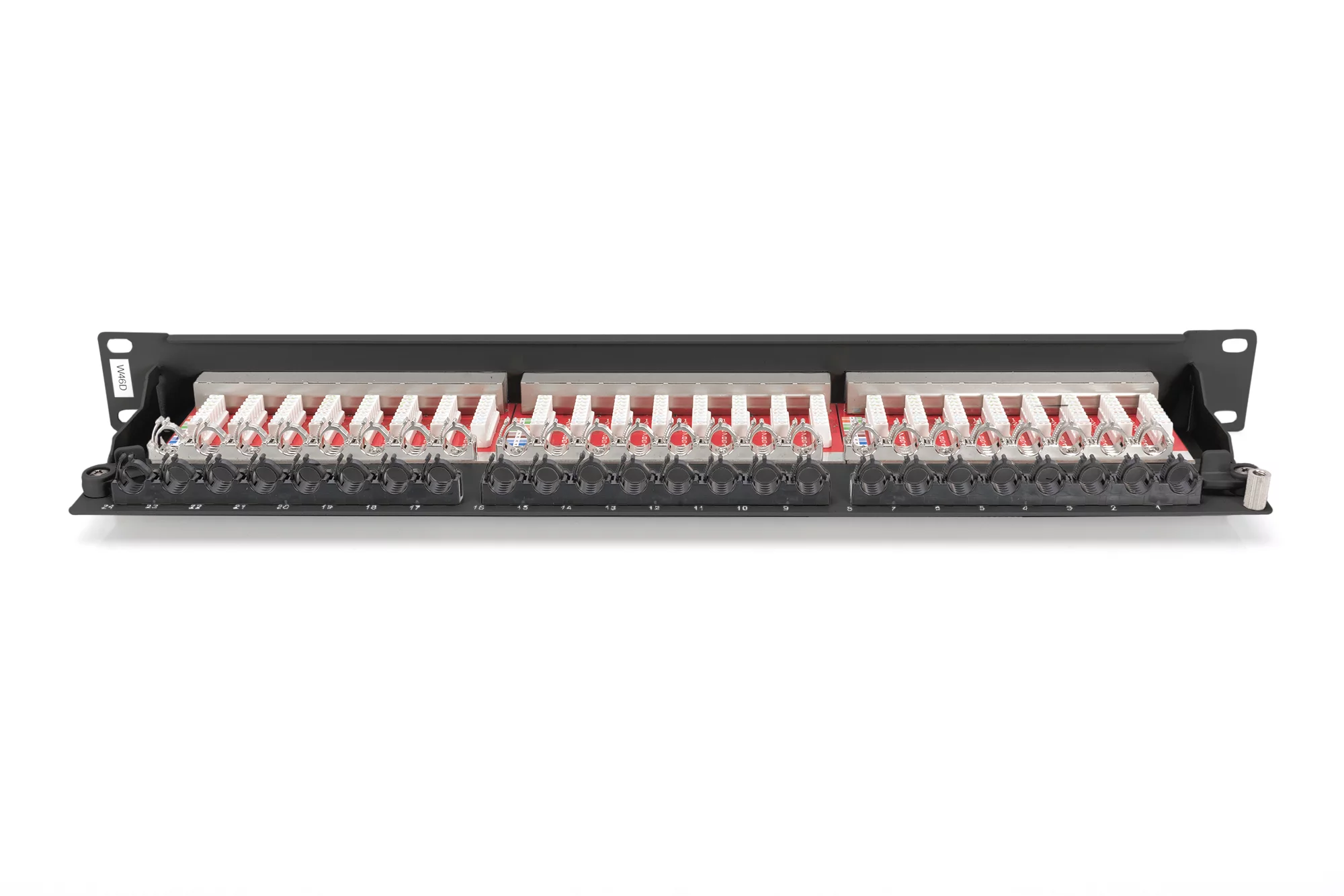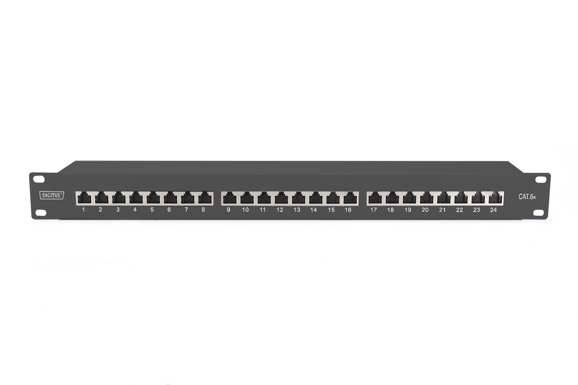 Патч-панель Digitus DN-91624S-EA CAT 6A доступна у версії з 24 портами та виготовлена із холоднокатаної сталі 1,5 мм, що робить її міцною патч-панеллю для 19-дюймової стійки. Вона відповідає стандарту 802.3at PoE+ і стандарт 802.3af PoE, оснащений жалюзі для захисту від пилу.