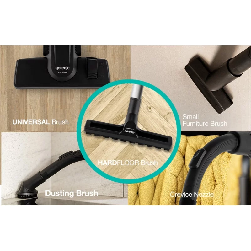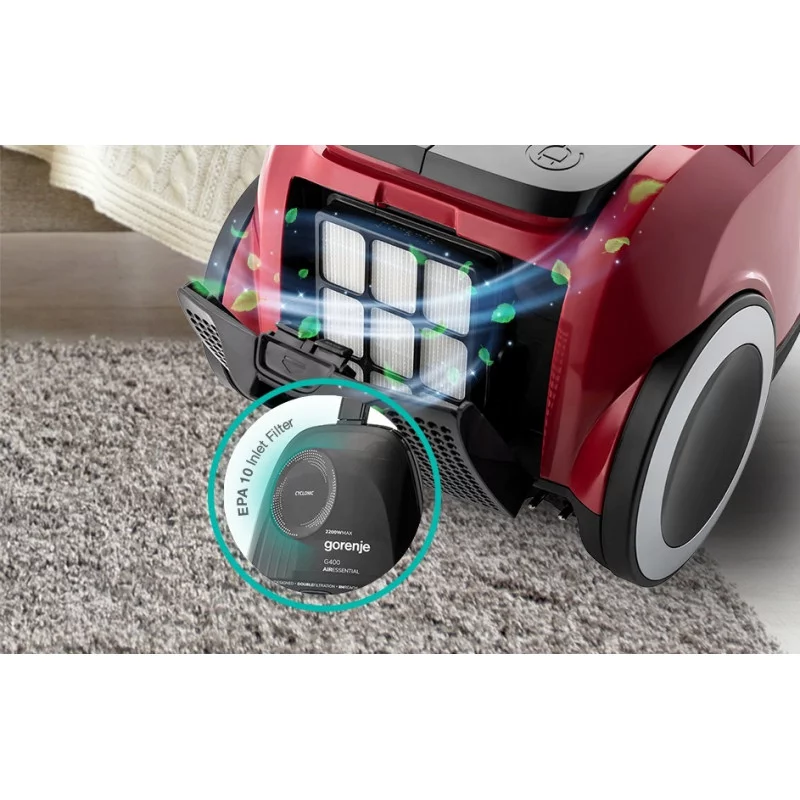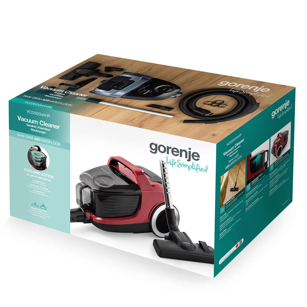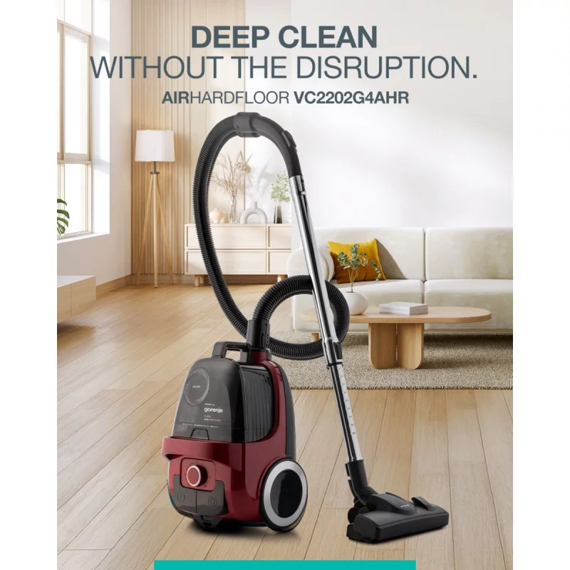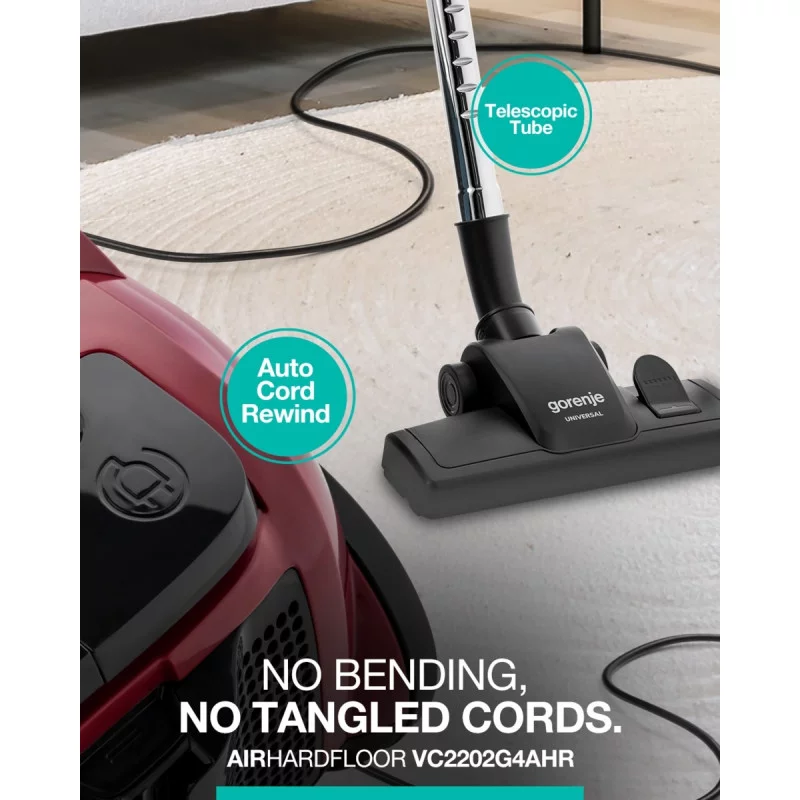 Пилосос AIRHARDFLOOR оснащений пластиковим контейнером об’ємом 3,3 л та потужністю всмоктування 330 Вт. Він має телескопічну металеву трубку та гнучкий шланг для зручного прибирання. Сенсорне управління та поворотна ручка забезпечують комфорт у використанні. Завдяки довгому кабелю, захисному бамперу та гумовим колесам прилад легко маневрує і безпечний у використанні.
