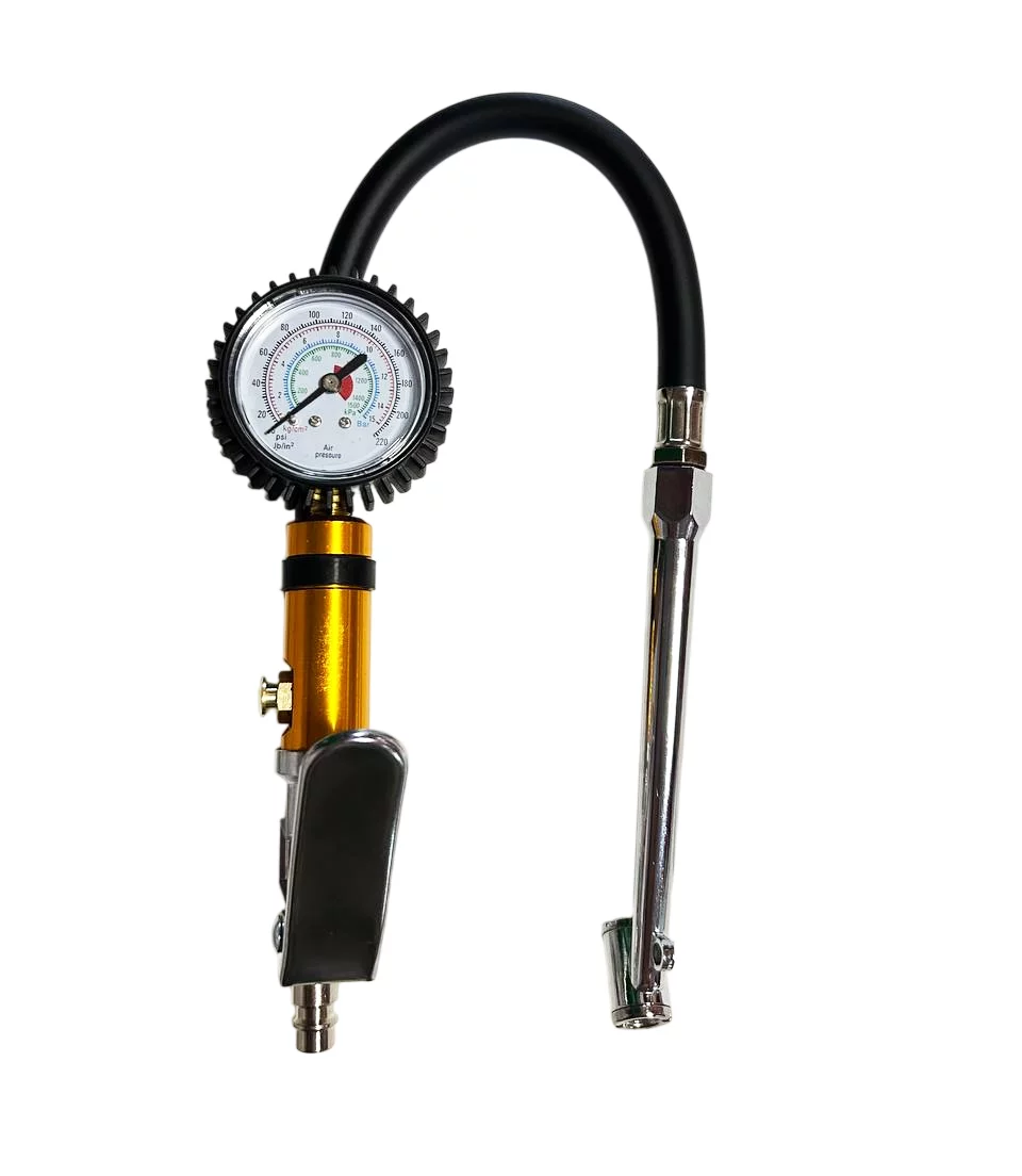 > Аналоговий манометр з подвійною шкалою (бар і psi) для точного вимірювання тиску. Захищений гумовим чохлом від пошкоджень.