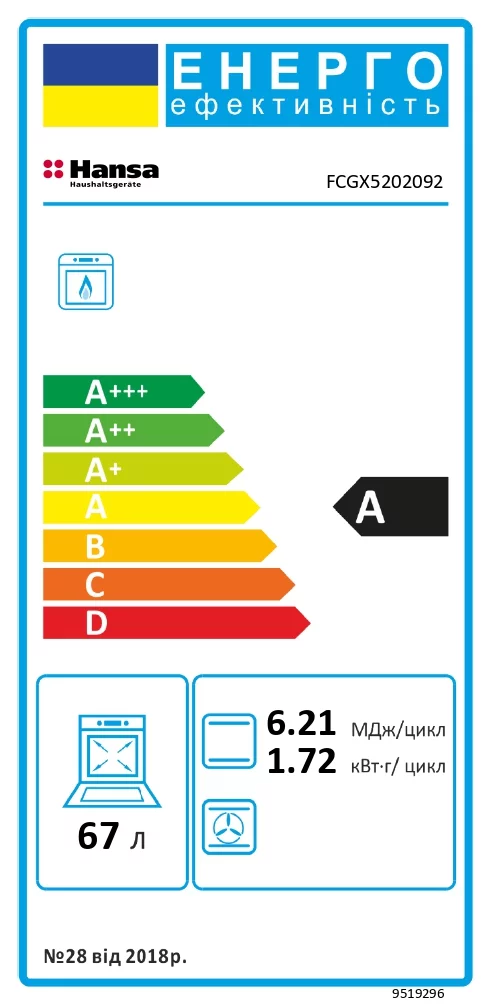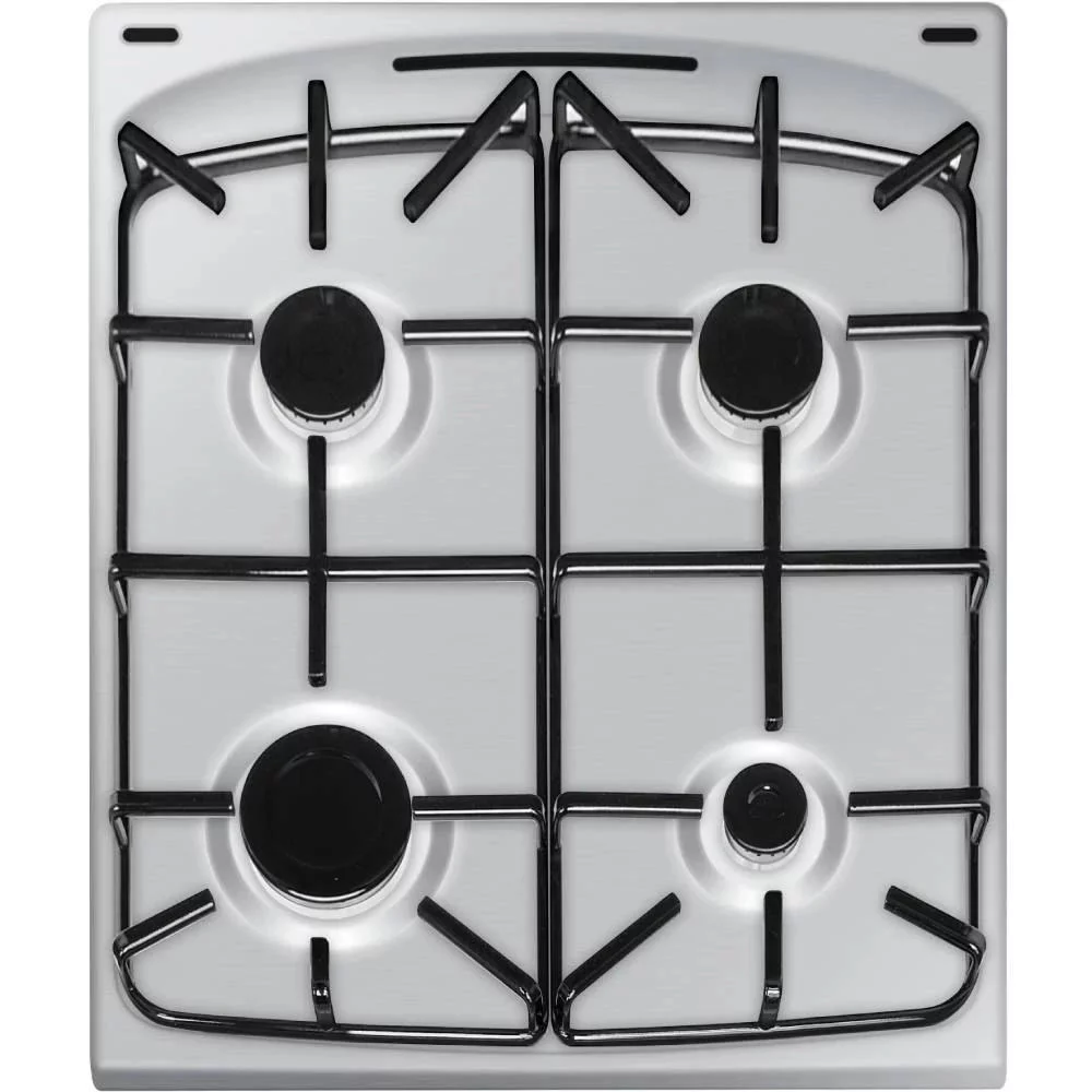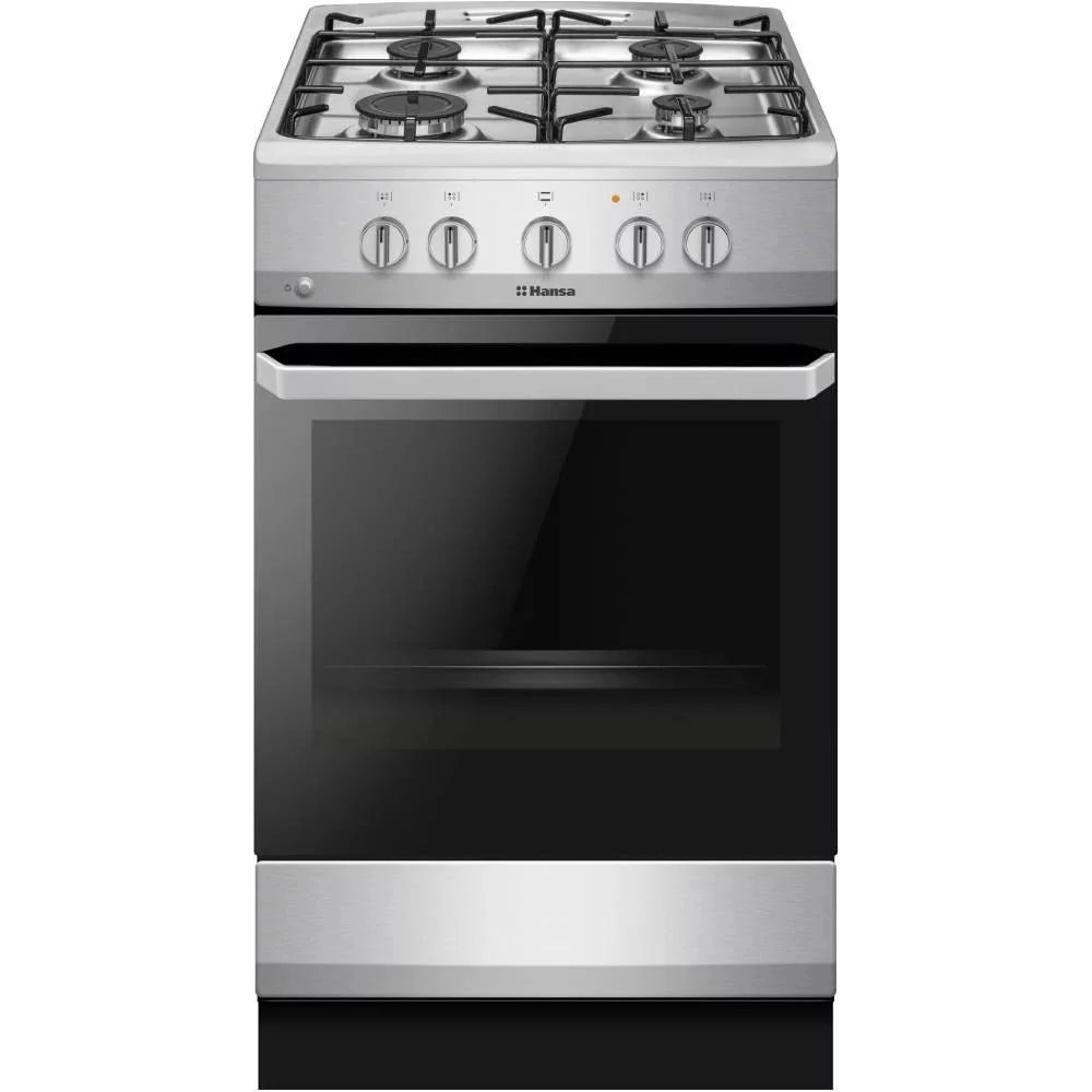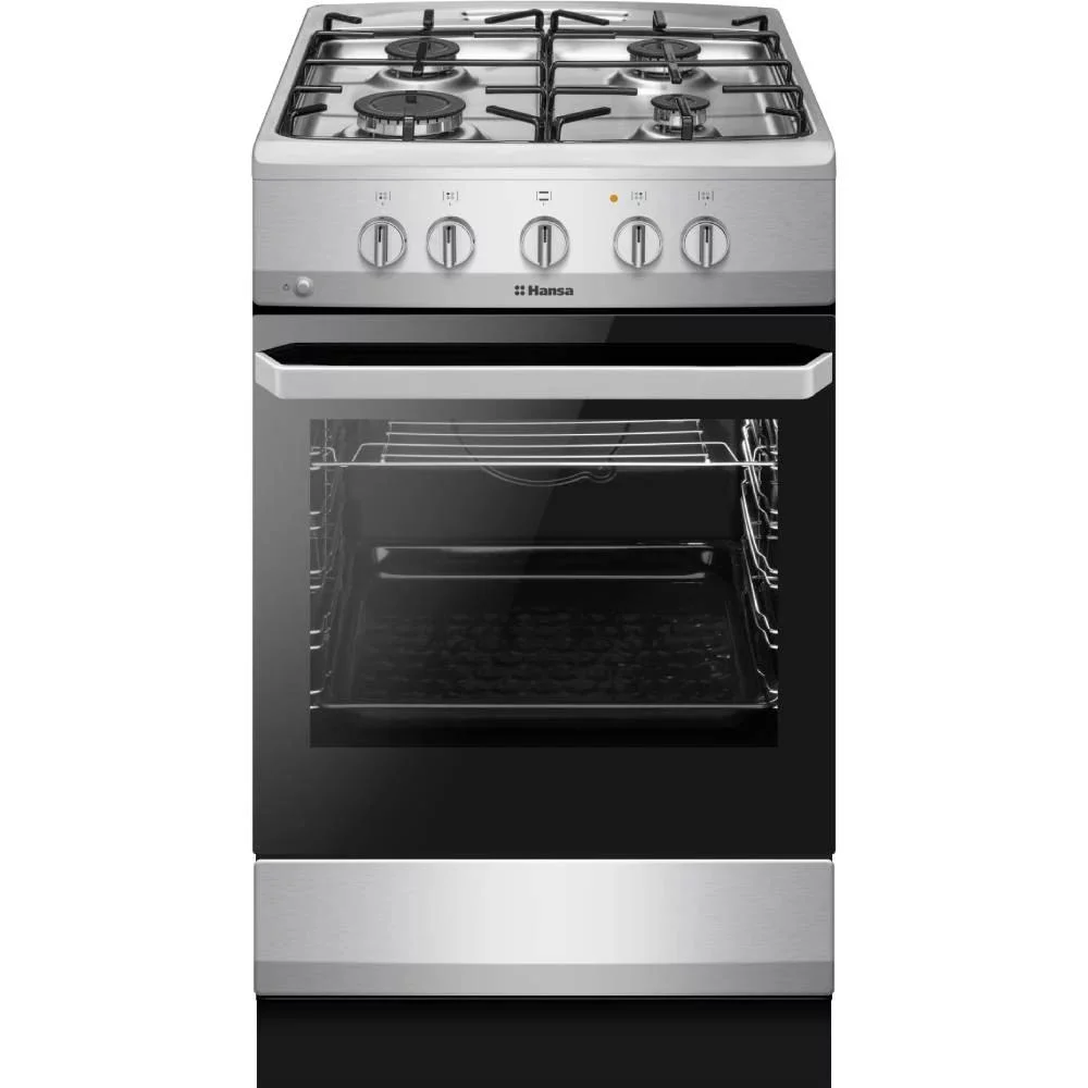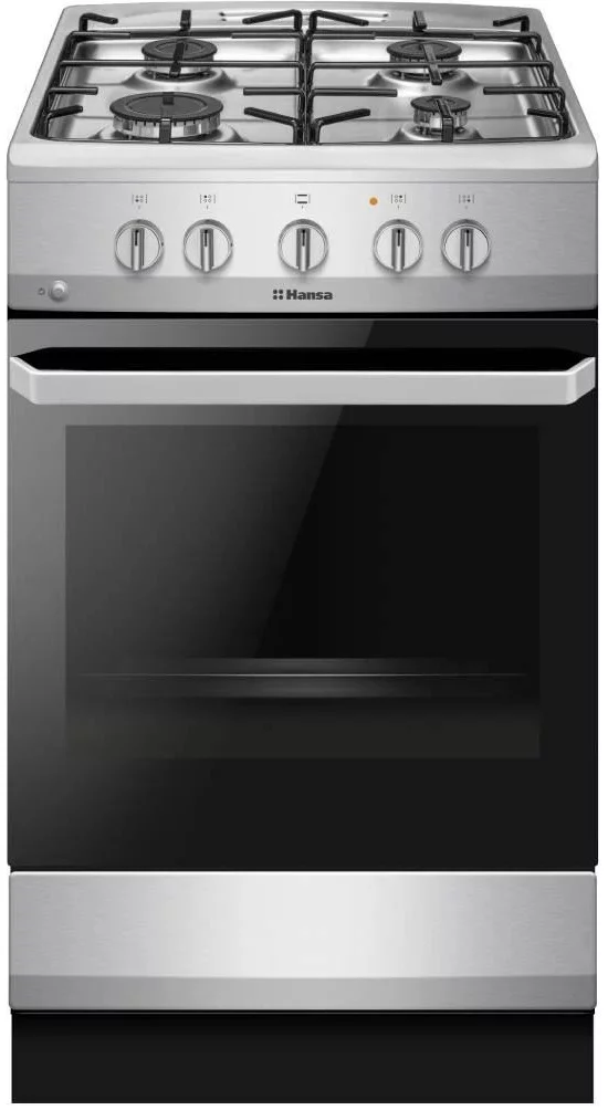 Газова плита Hansa FCGX5202092 з нержавіючої сталі оснащена 4 конфорками з газовим контролем і електрозапалюванням у ручках. Духовка об’ємом 67 л має підсвітку та стандартні напрямні, у комплекті стільникове деко.