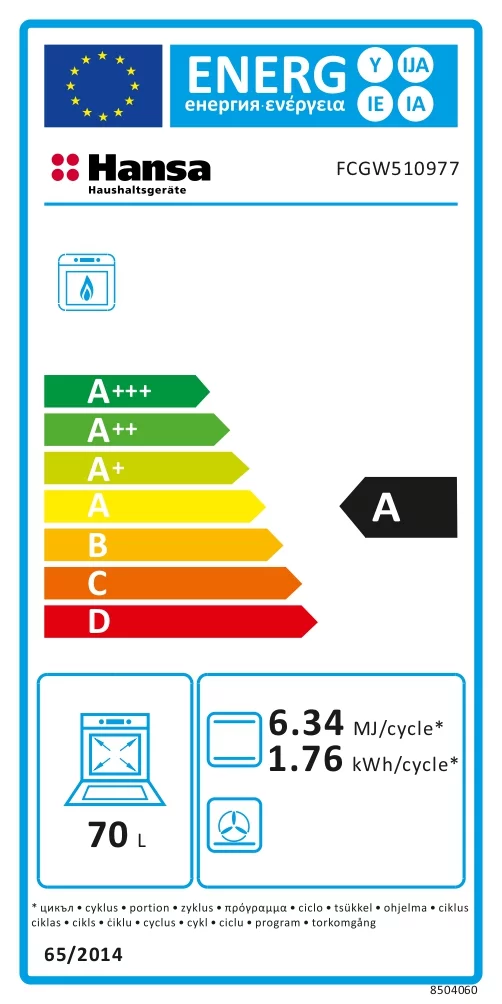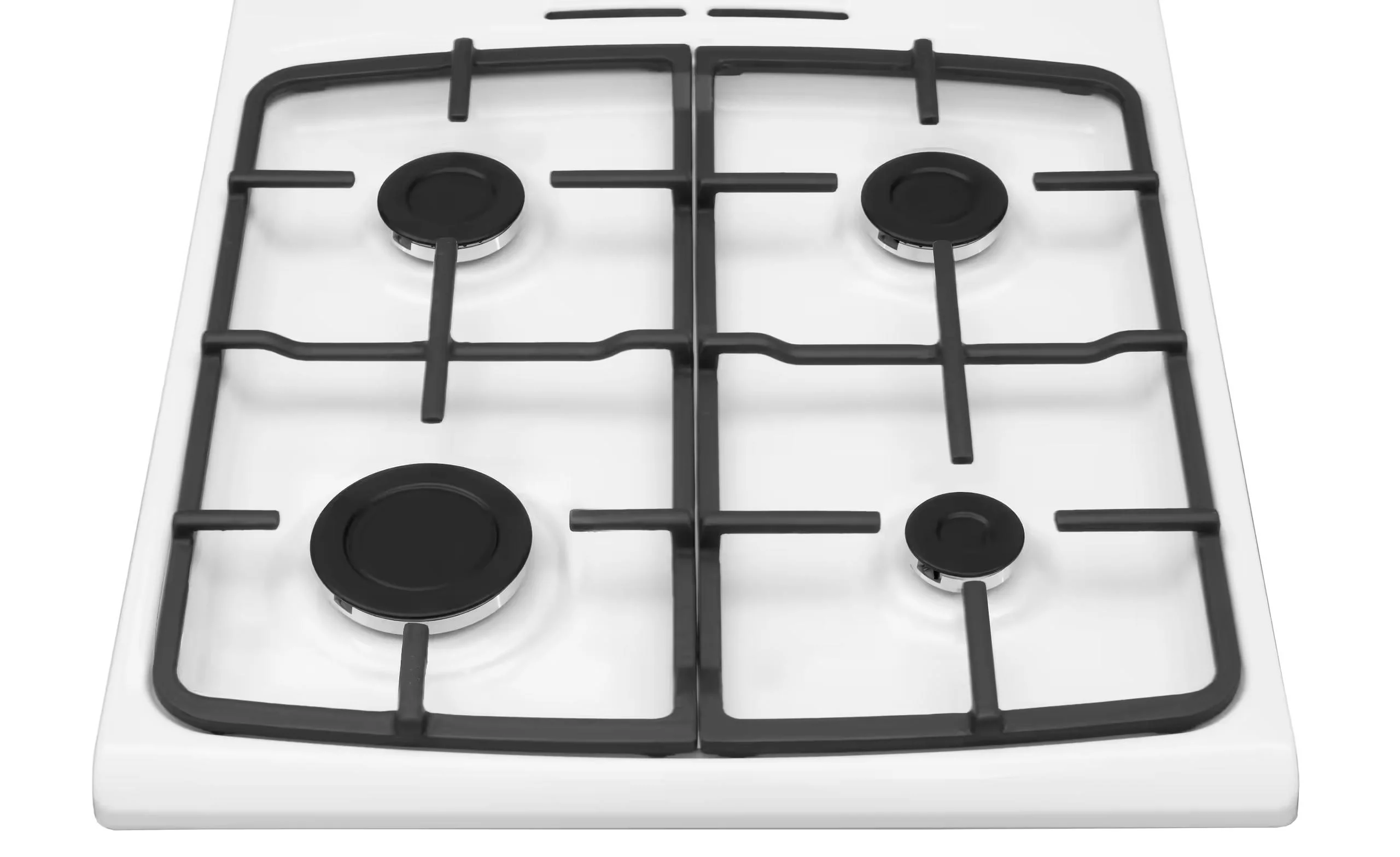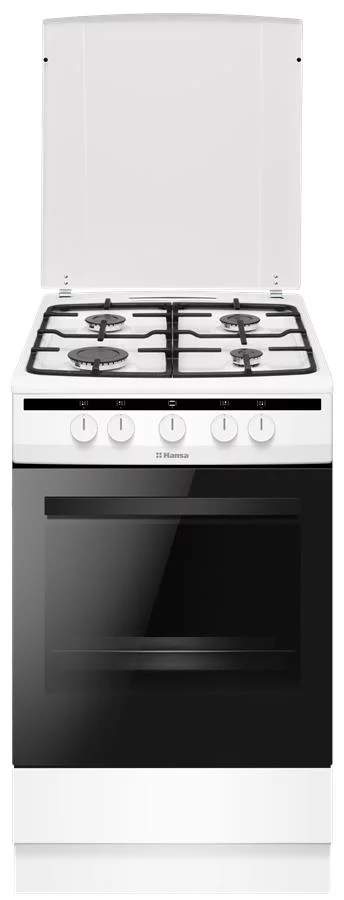 Газова плита Hansa FCGW510977 білого кольору з чавунними решітками, 4 конфорками та електрозапалюванням у ручках. Духовка об’ємом 70 л має нижній газовий нагрів, підсвітку та два дека у комплекті.