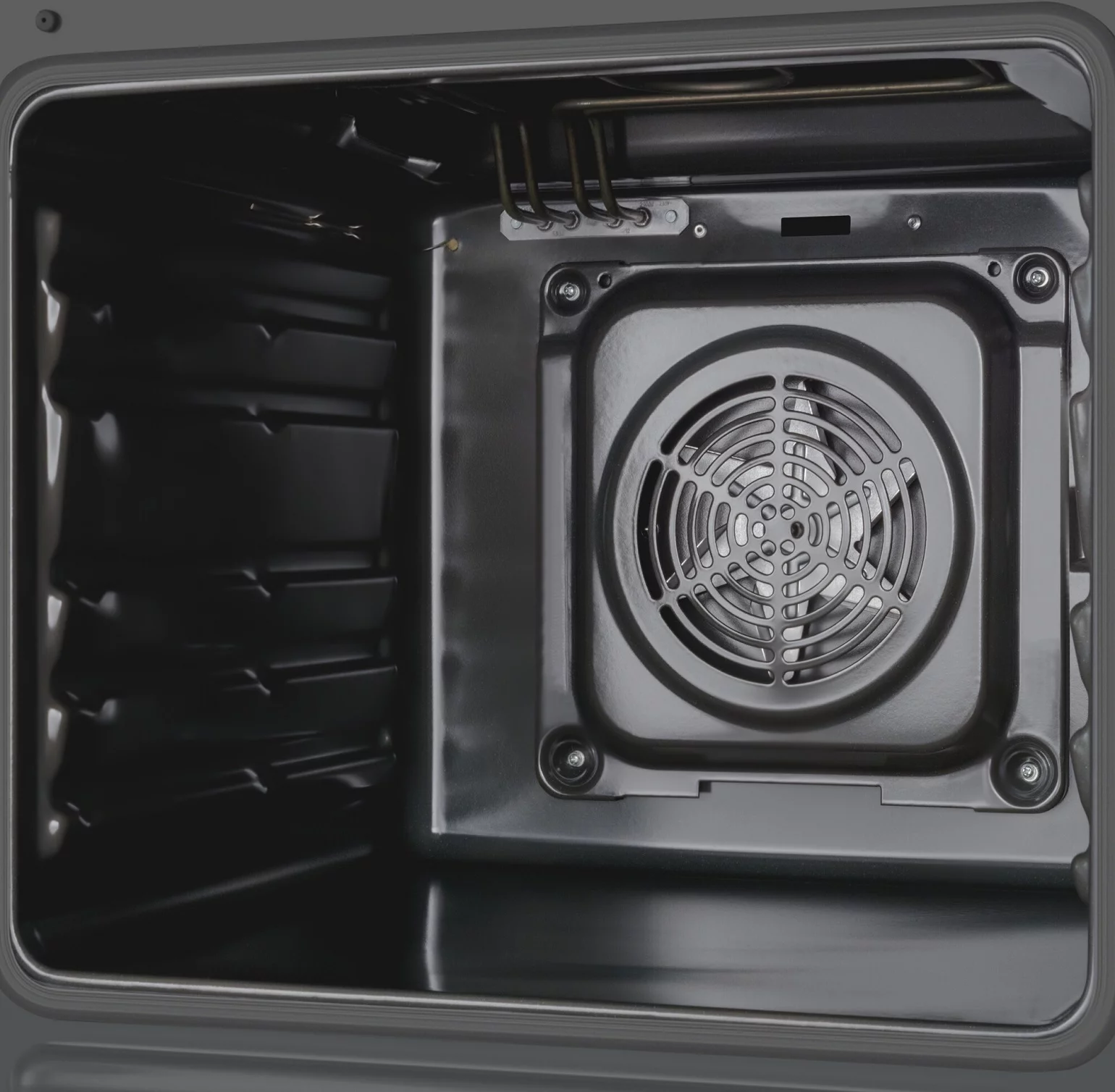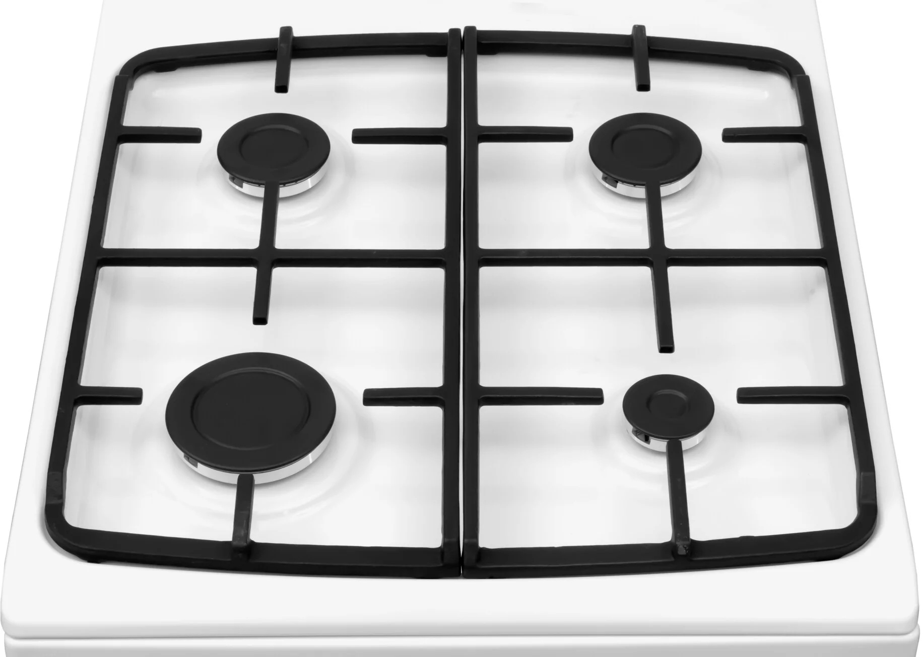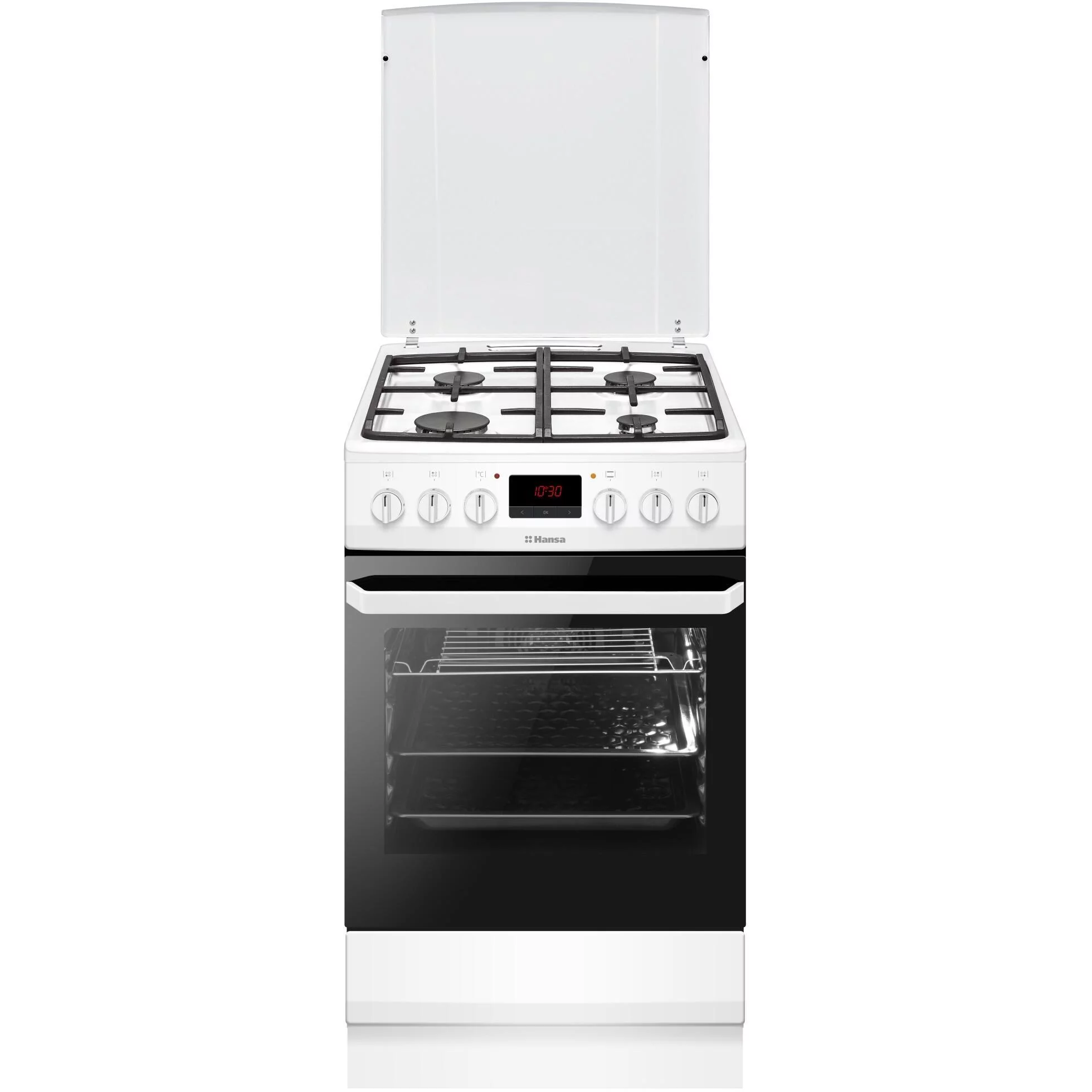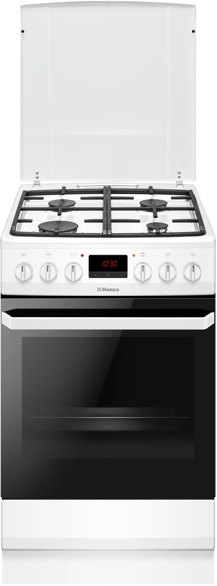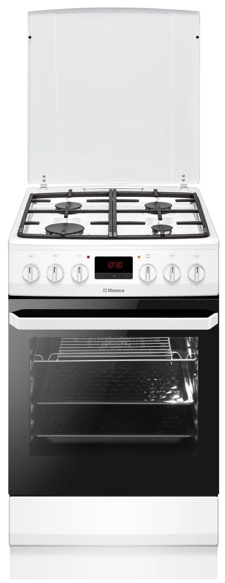 Комбінована плита з газовою варильною поверхнею та електричною духовкою об’ємом 62 л. Оснащена чавунними решітками, системою електрозапалювання в ручках і клапаном безпеки газу. Парове очищення спрощує догляд.