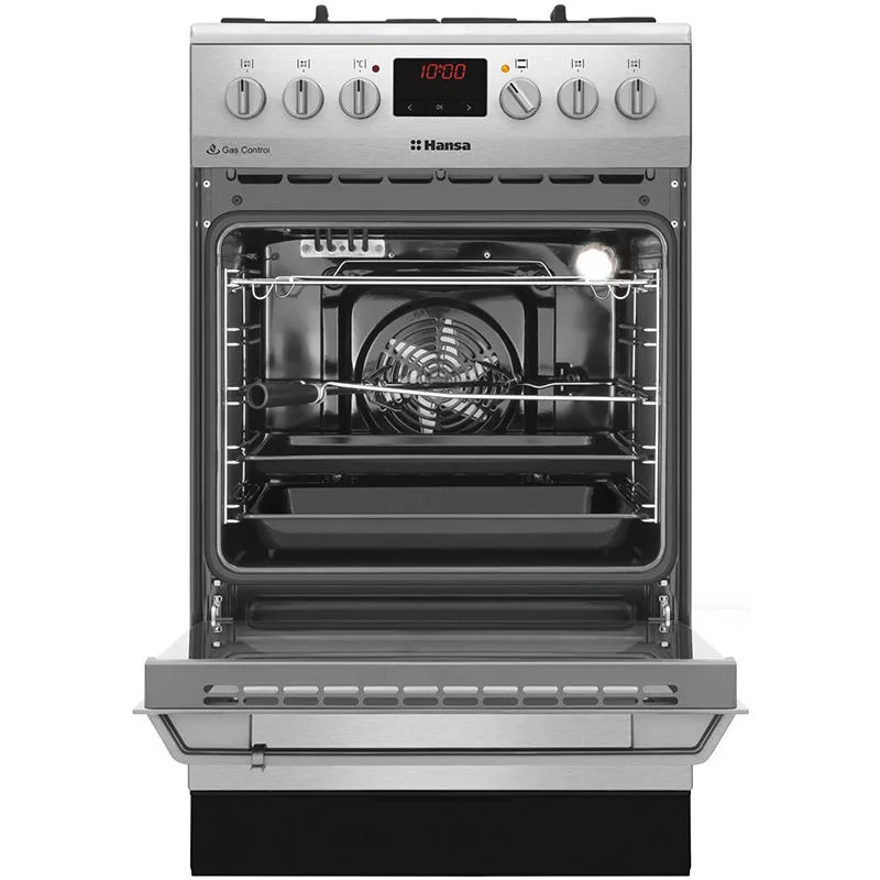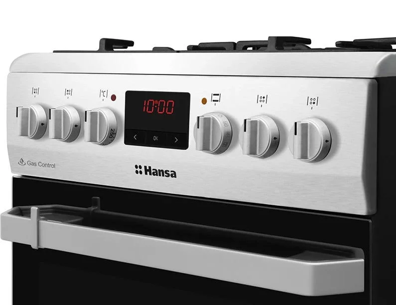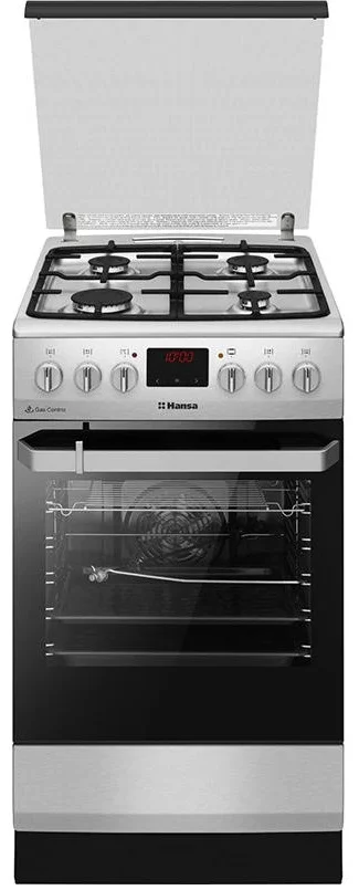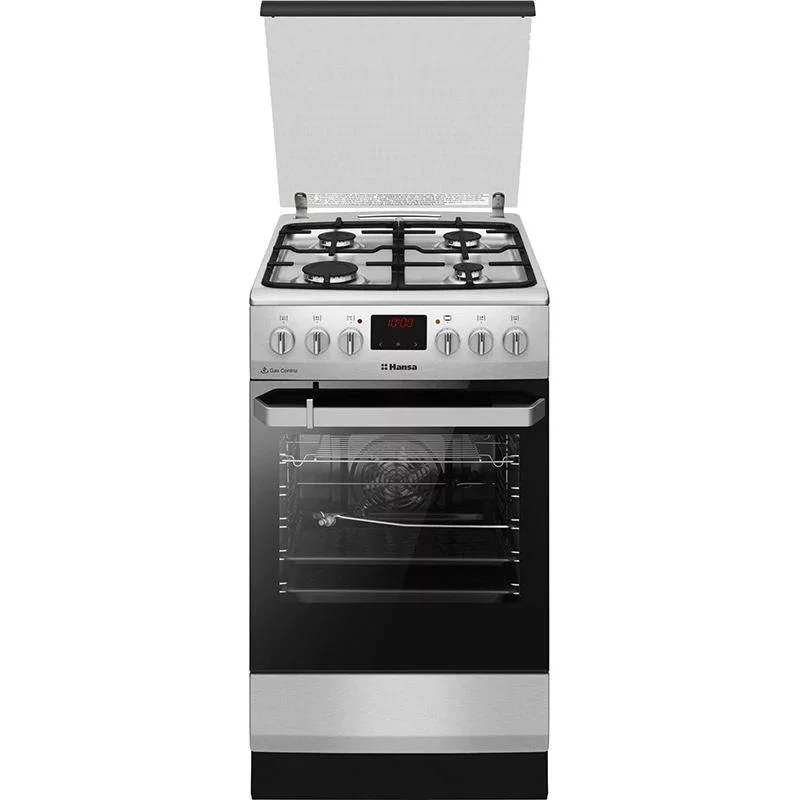 Комбінована плита Hansa FCMX59229 (50×60 см) оснащена 4 газовими конфорками з чавунними решітками та електричною духовкою об’ємом 65 л. Духовка має 10 режимів приготування, включаючи гриль, гаряче повітря та швидкий розігрів, а також каталітичну систему очищення. Зручне управління кнопками та ручками, LED-дисплей і знімні дверцята з 3 шарами скла забезпечують комфорт у використанні.