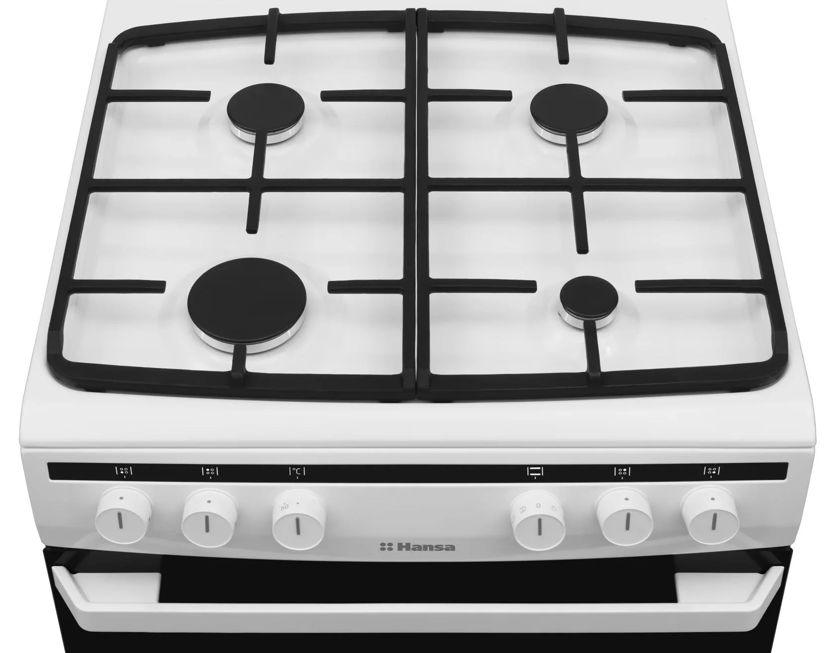 Комбінована плита Hansa FCMW680451 об’єднує електричну духовку об’ємом 62 л та газову варильну поверхню з чавунними решітками. Вісім режимів нагрівання, серед яких гриль, нижній нагрів та функція швидкого розігріву, забезпечують зручність у приготуванні різних страв. Очищення паром значно спрощує догляд за духовкою, а внутрішнє освітлення та рецепти на склі дверцят додають практичності.