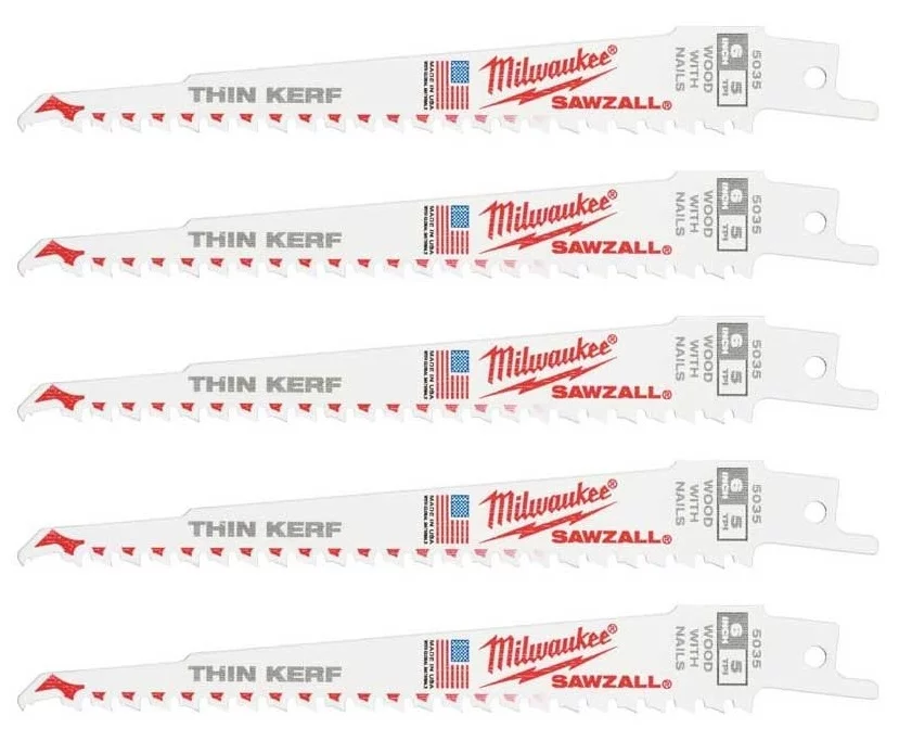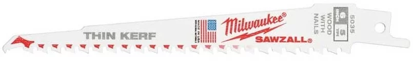 Полотно пиляльне Milwaukee FANG TIP THIN KERF 48005035 для шабельної пилки по дереву, довжина 150 мм, крок зуба 5 мм, біметал Matrix II, 5 шт. Забезпечує швидкий та агресивний різ деревини, включно з деревиною з цвяхами. Технологія FANG TIP полегшує занурення, THIN KERF зменшує опір. Цей набір пасує до демонтажу та будівельних робіт.
