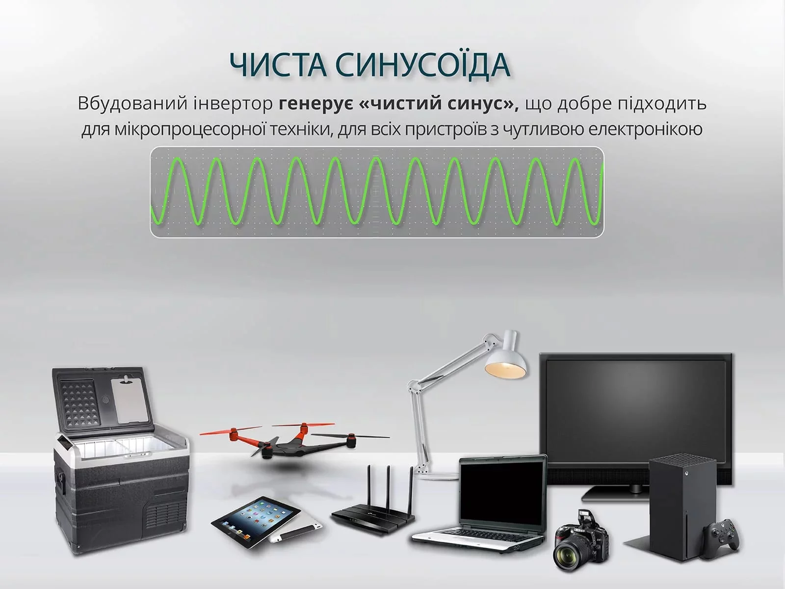 USB (Quick Charge 3.0) 2 × USB-A 18Вт, Вихід Type-C PD 100 Вт, Вихідний роз’єм для прикурювача 12 В/10 A, Вхід для заряджання від сонячного модуля PV МРРТ DC 7909 Макс. 120Вт