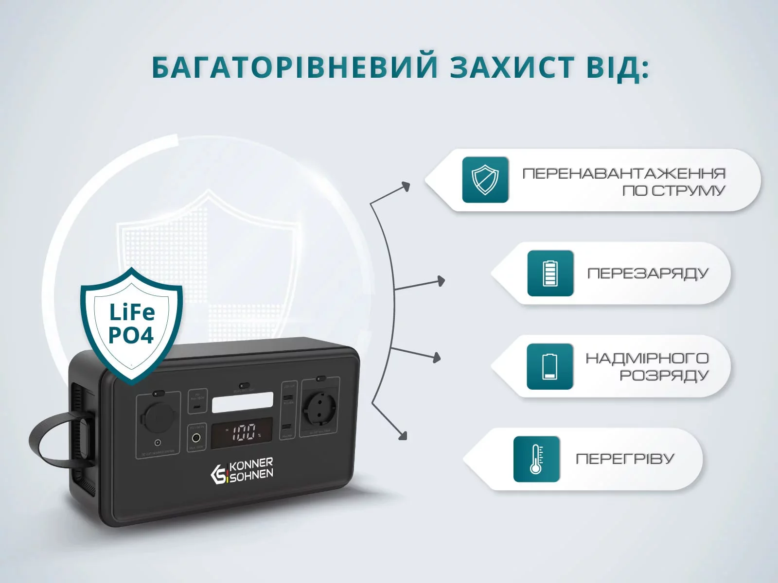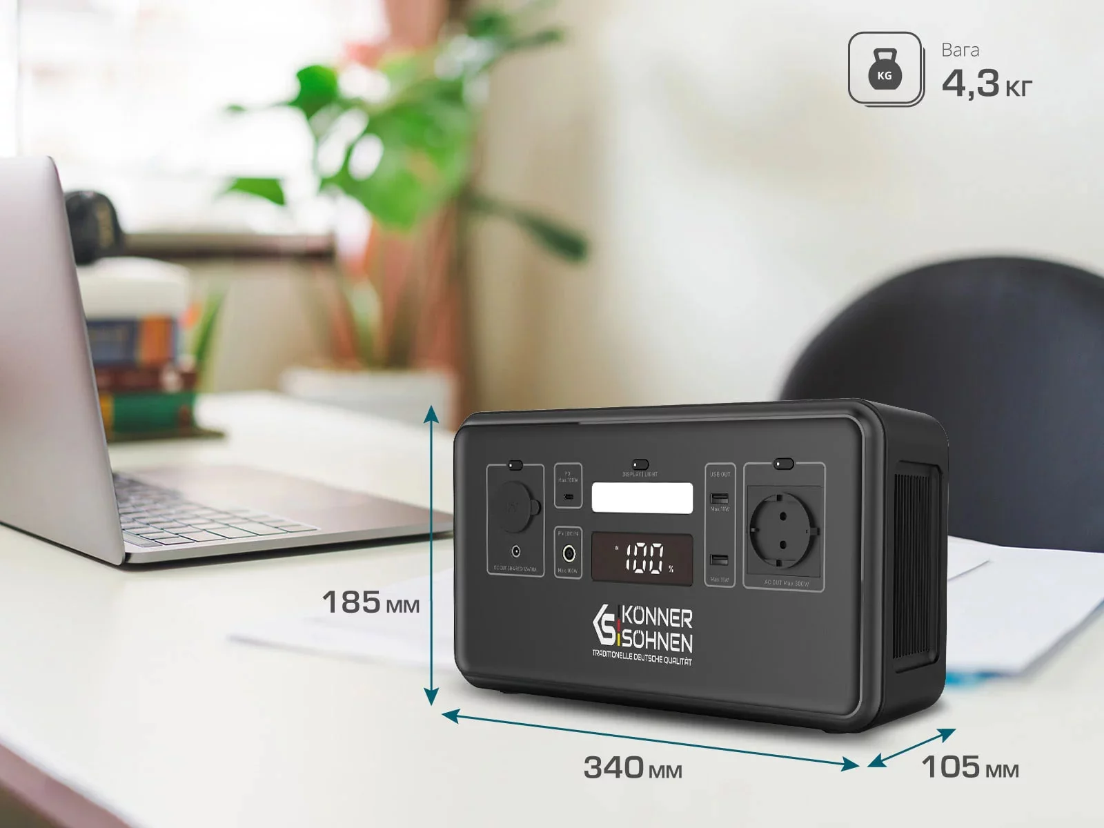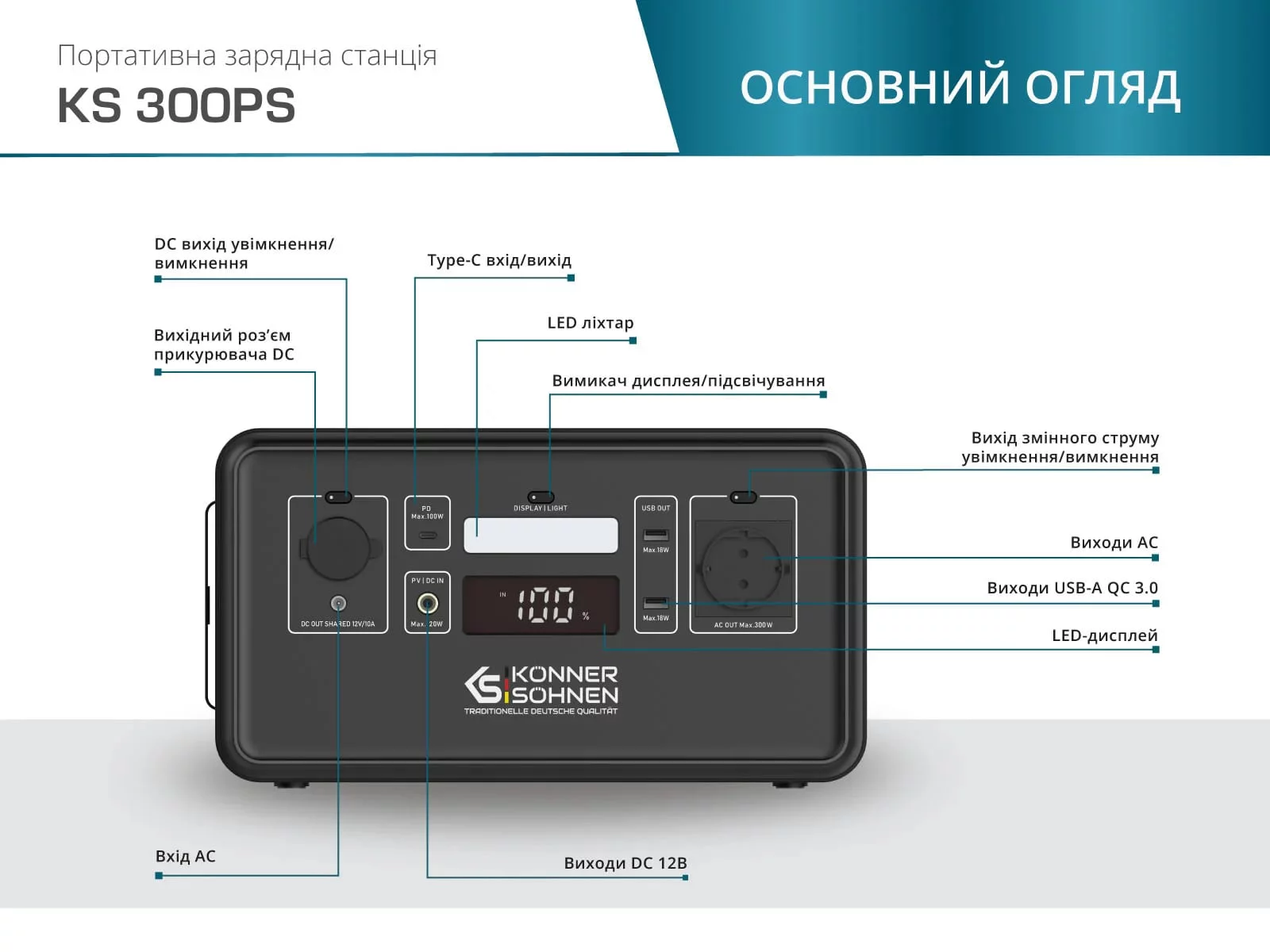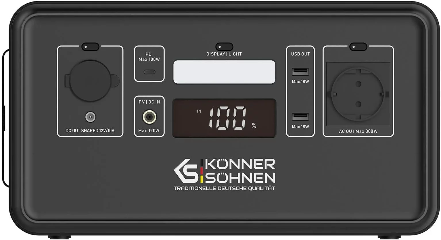 Мобільна портативна електростанція KS 300PS німецької торгової марки Könner & Söhnen виготовляється з використанням високоякісних LifePO4 літій-залізо-фосфатних акумуляторів високої ємності, які мають більш високу енергетичну щільність в порівняні з Li-ion, вони можуть зберігати більше енергії в компактному форматі та мають великий життєвий цикл – 4000 циклів заряд-розряд. Вона стане надійним помічником для зарядки пристроїв в дорозі або в разі збоїв електропостачання. Її потужності буде достатньо для роботи такої техніки як смартфон, цифрова камера, планшет, дрон, міні-холодильник, насос для накачування, вентилятор. Вона працює тихо, тому дозволить живити електричні пристрої та насолоджуватись часом без будь-якого заважаючого шуму.