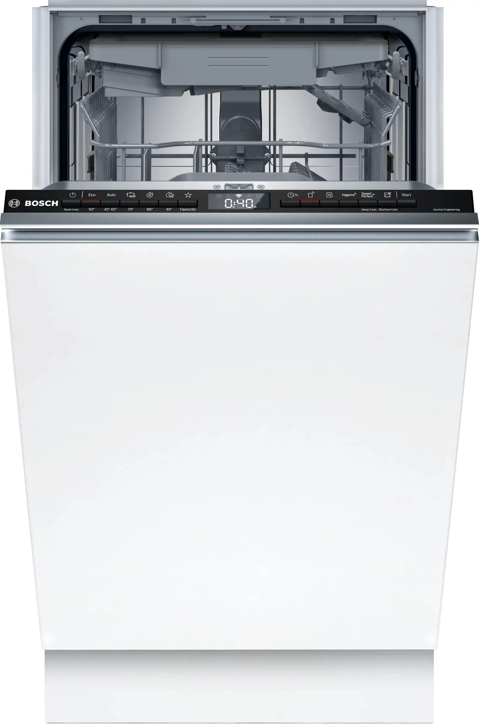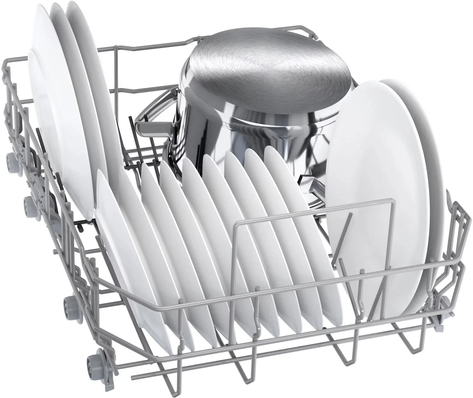 Вбудована вузька посудомийна машина Bosch SPV4HMX14Q із підключенням Home Connect: дистанційний запуск, push-сповіщення, «Улюблене» та Easy Start. Опція SpeedPerfect+ скорочує тривалість циклу, Heat Exchanger дбайливо миє скло й фарфор, Self Cleaning Filter зменшує потребу в ручному очищенні фільтра. Стопори нижнього короба роблять завантаження зручнішим.