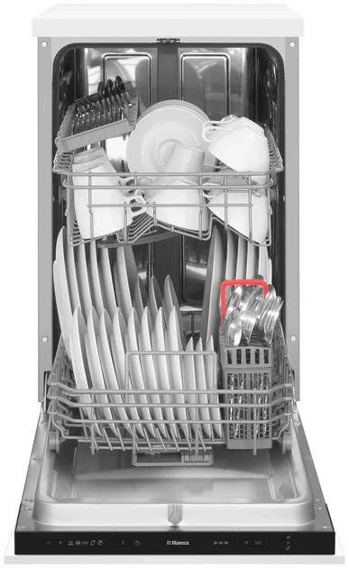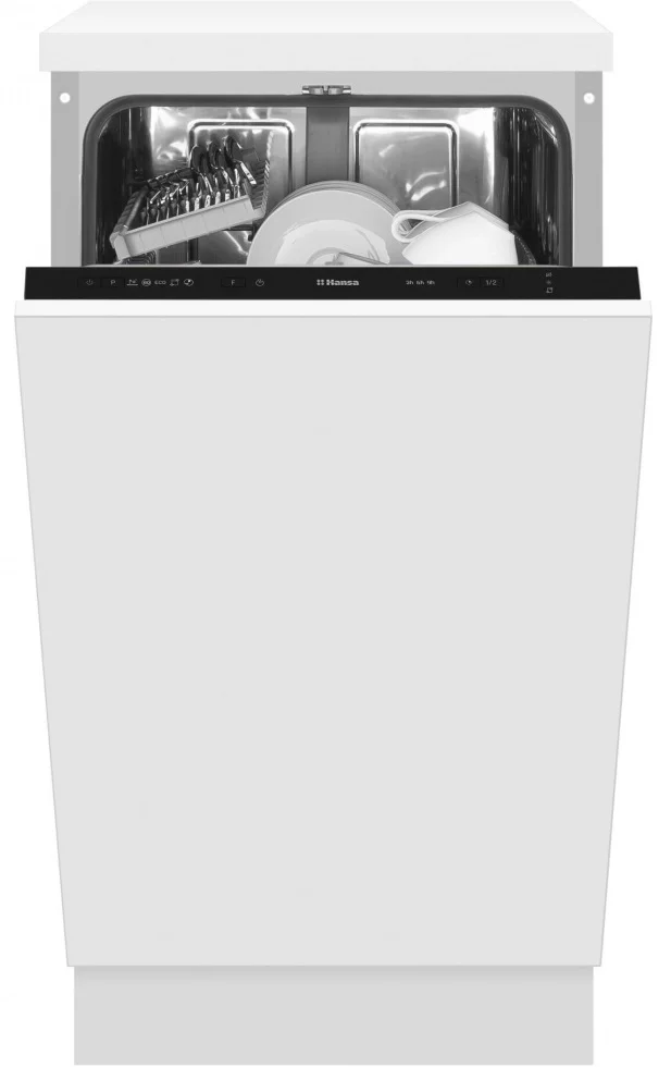 Вбудована посудомийна машина Hansa ZIM435H на 9 комплектів із 5 програмами забезпечує ефективне миття та сушіння класу A. Має функцію половинного завантаження, відкладений старт (3/6/9 год) та додаткове сушіння. Споживає лише 9 л води за цикл, рівень шуму – 49 дБ.