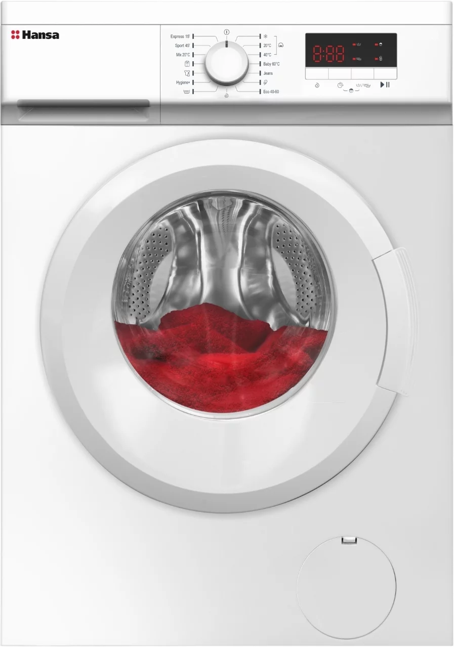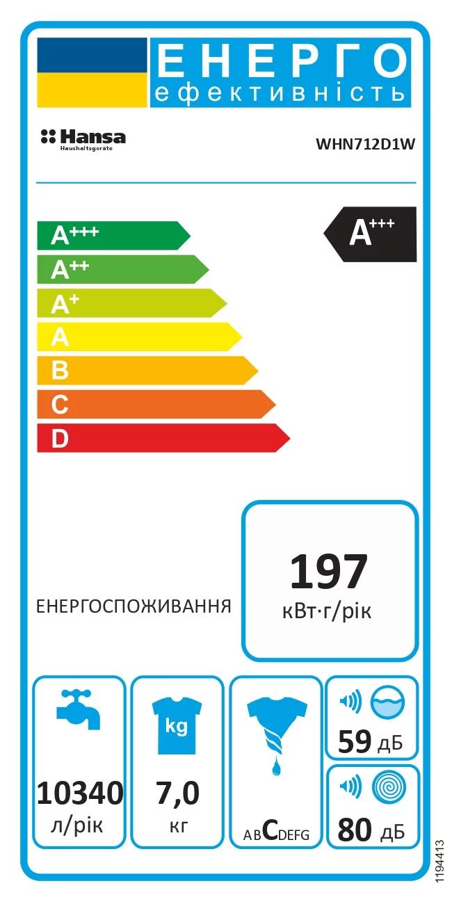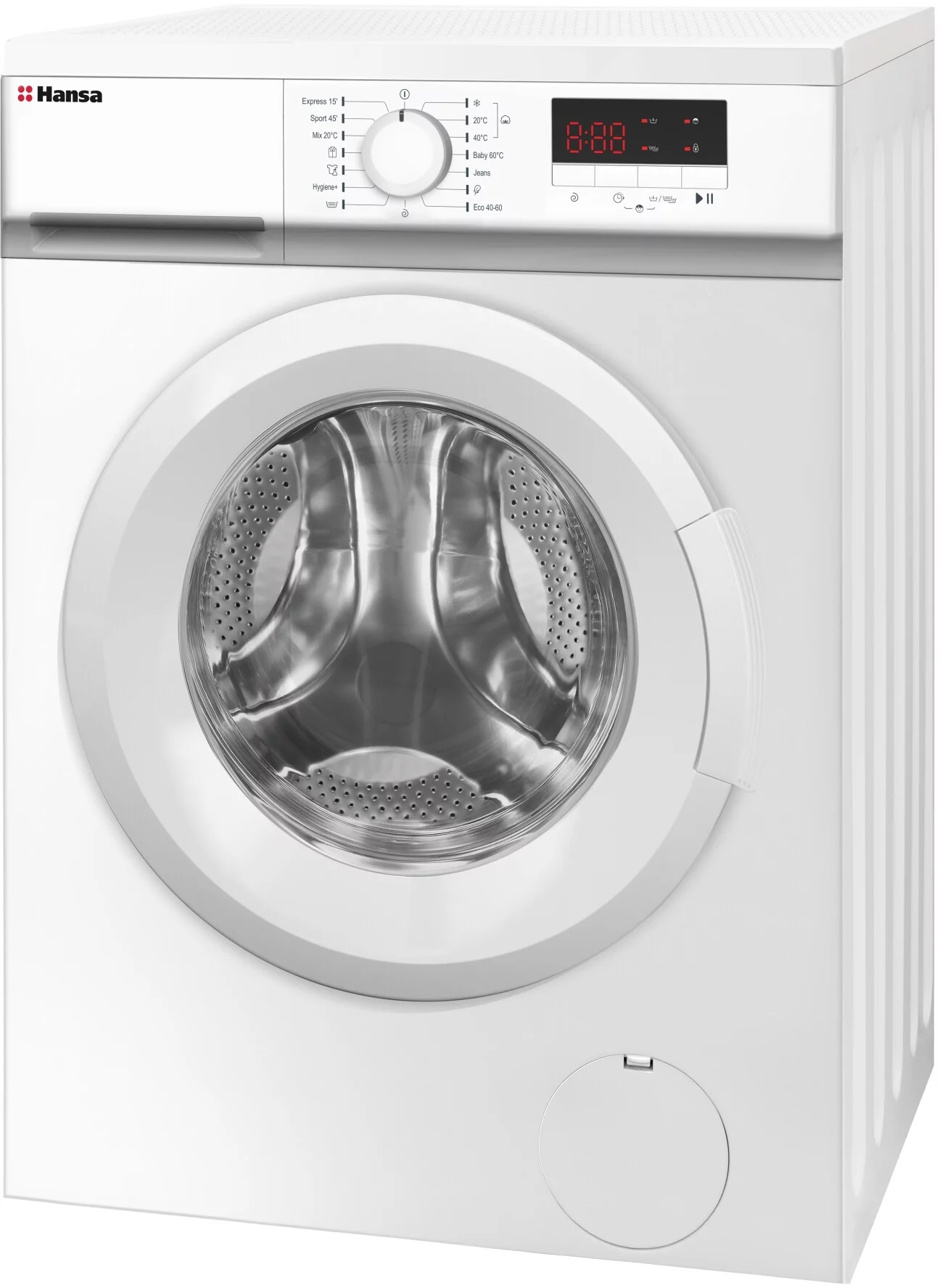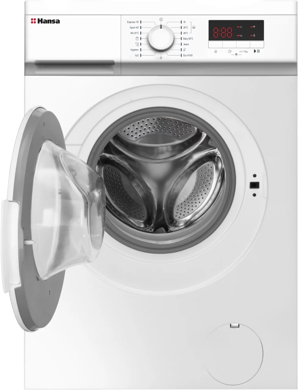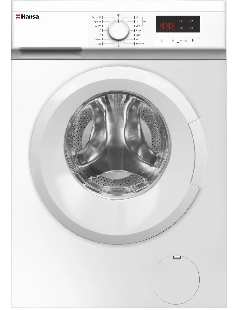 Фронтальна пральна машина Hansa WHN712D1W з завантаженням 7 кг і швидкістю віджиму до 1200 об/хв. Має 15 програм, включно з ЕКО 40–60, швидкими циклами на 15 і 45 хвилин, програмою для вовни та джинсів. Оснащена LED-дисплеєм, опціями відкладеного старту, додаткового полоскання й блокування від дітей. Клас енергоефективності — A+++, річне споживання води становить 10340 л.