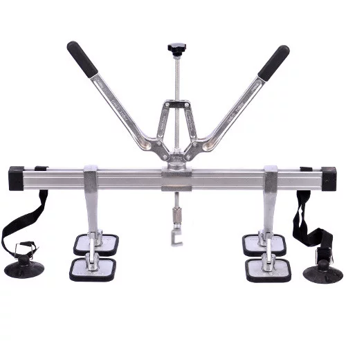 Кріплення рихтувального пристосування здійснюється за допомогою вакуумних гумових присосок, розміщених із двох боків, а за допомогою нарізних важелів деталь виправляється в потрібному напрямку.