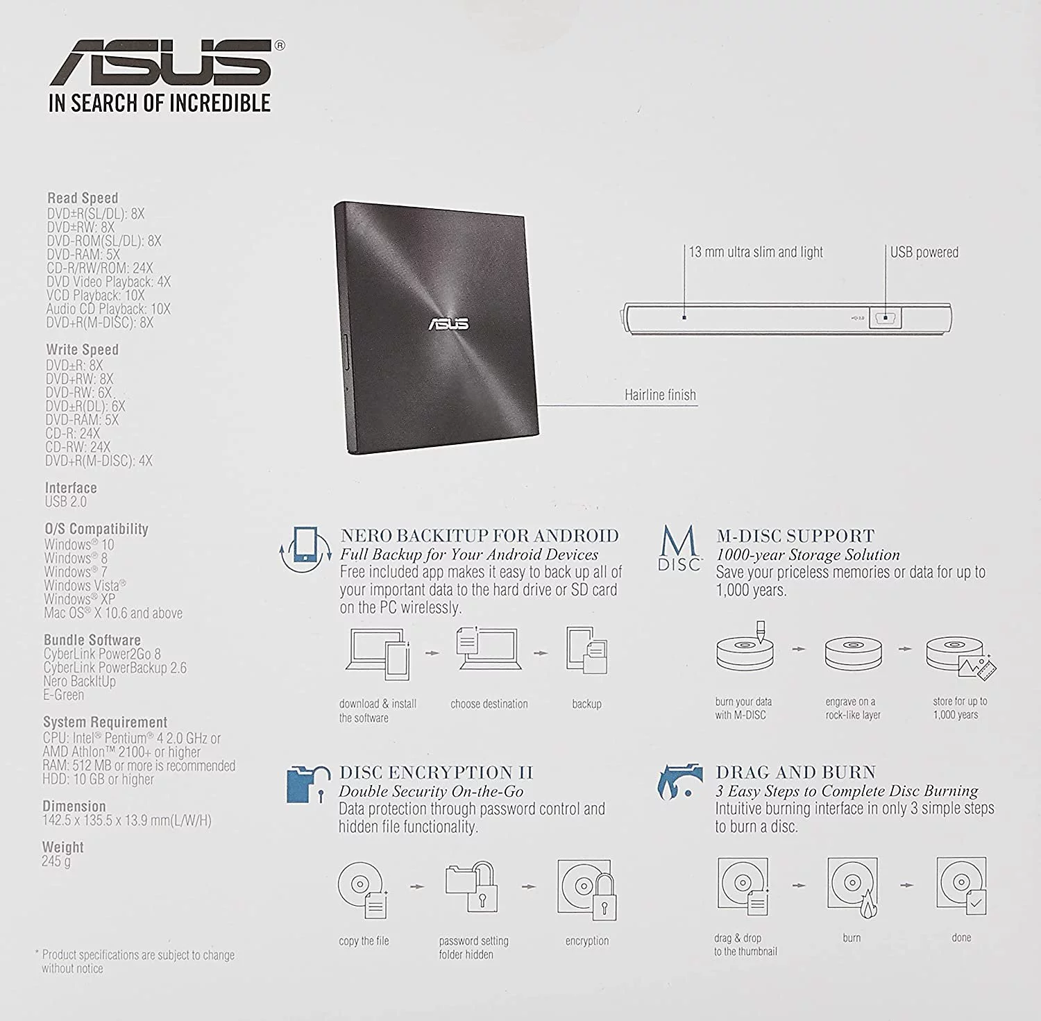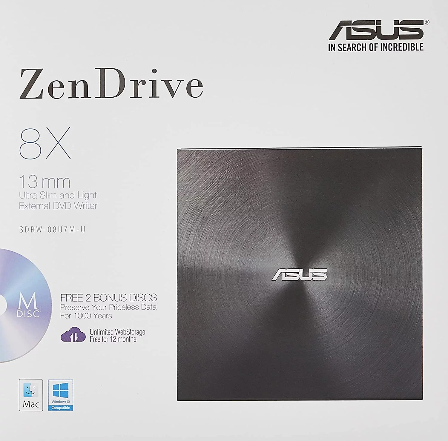 ASUS ZenDrive U7M — це зовнішній записувальний DVD-привод, виготовлений у тонкому корпусі з відмітним дизайном у стилі Zen. Однією з особливостей цієї моделі є підтримка довговічних оптичних носіїв формату M-Disc. На відміну від багатьох інших оптичних приводів, ASUS ZenDrive U7M є сумісним із носіями формату M-Disc, термін експлуатації яких становить понад тисячу років. Привод ASUS ZenDrive U7M виготовлений у корпусі всього 13 мм завтовшки, що робить його ідеальним аксесуаром для тонких і легких ноутбуків.