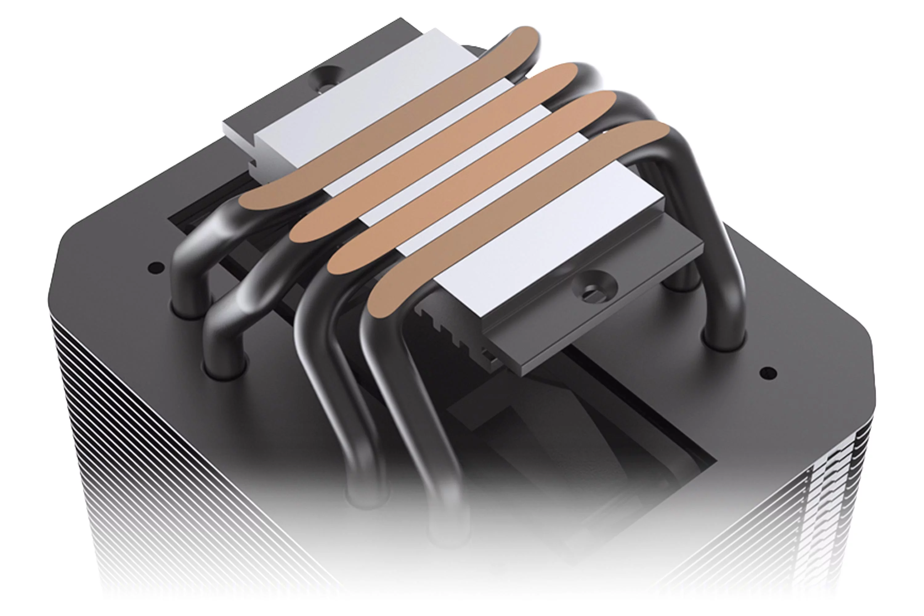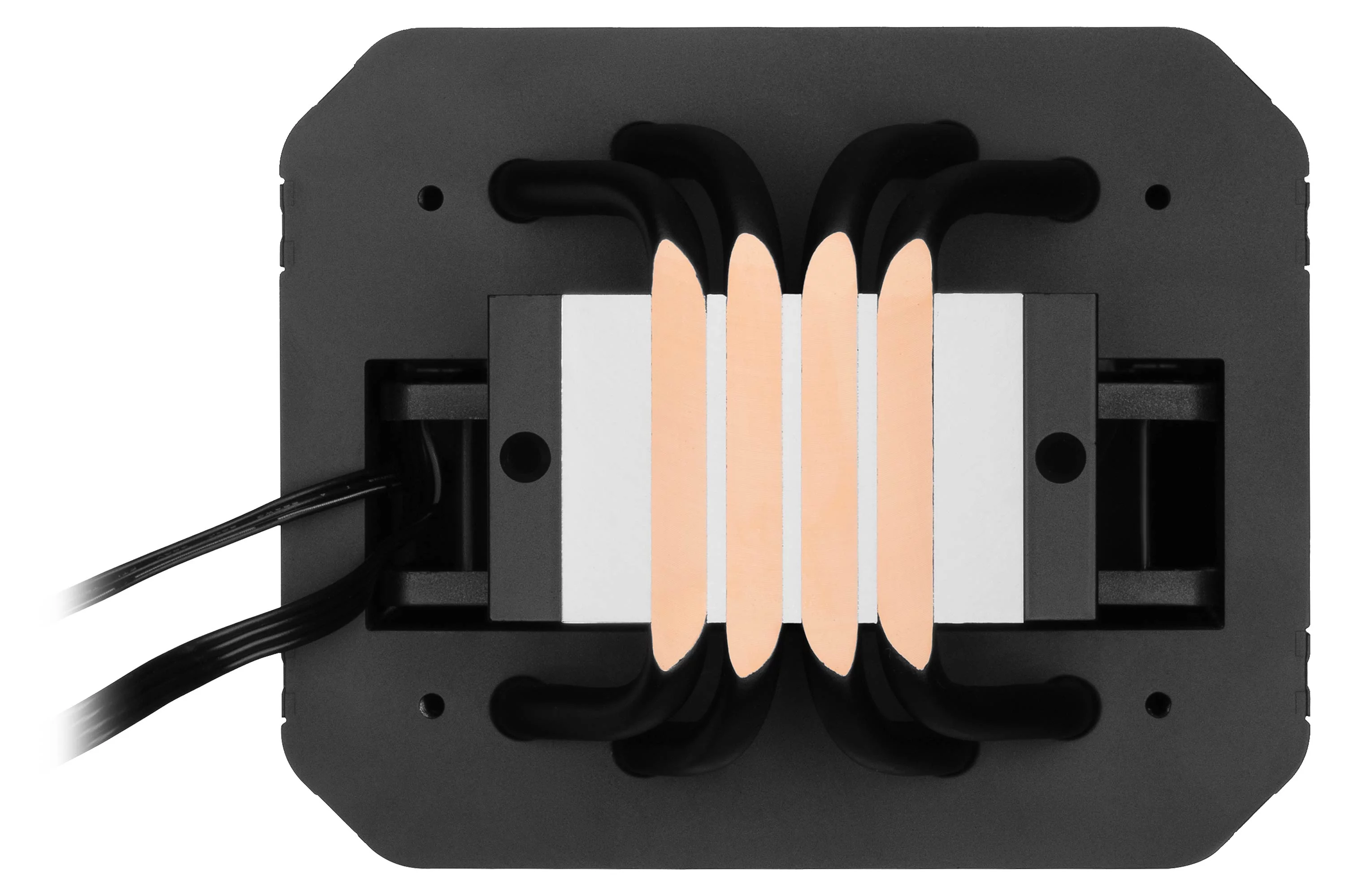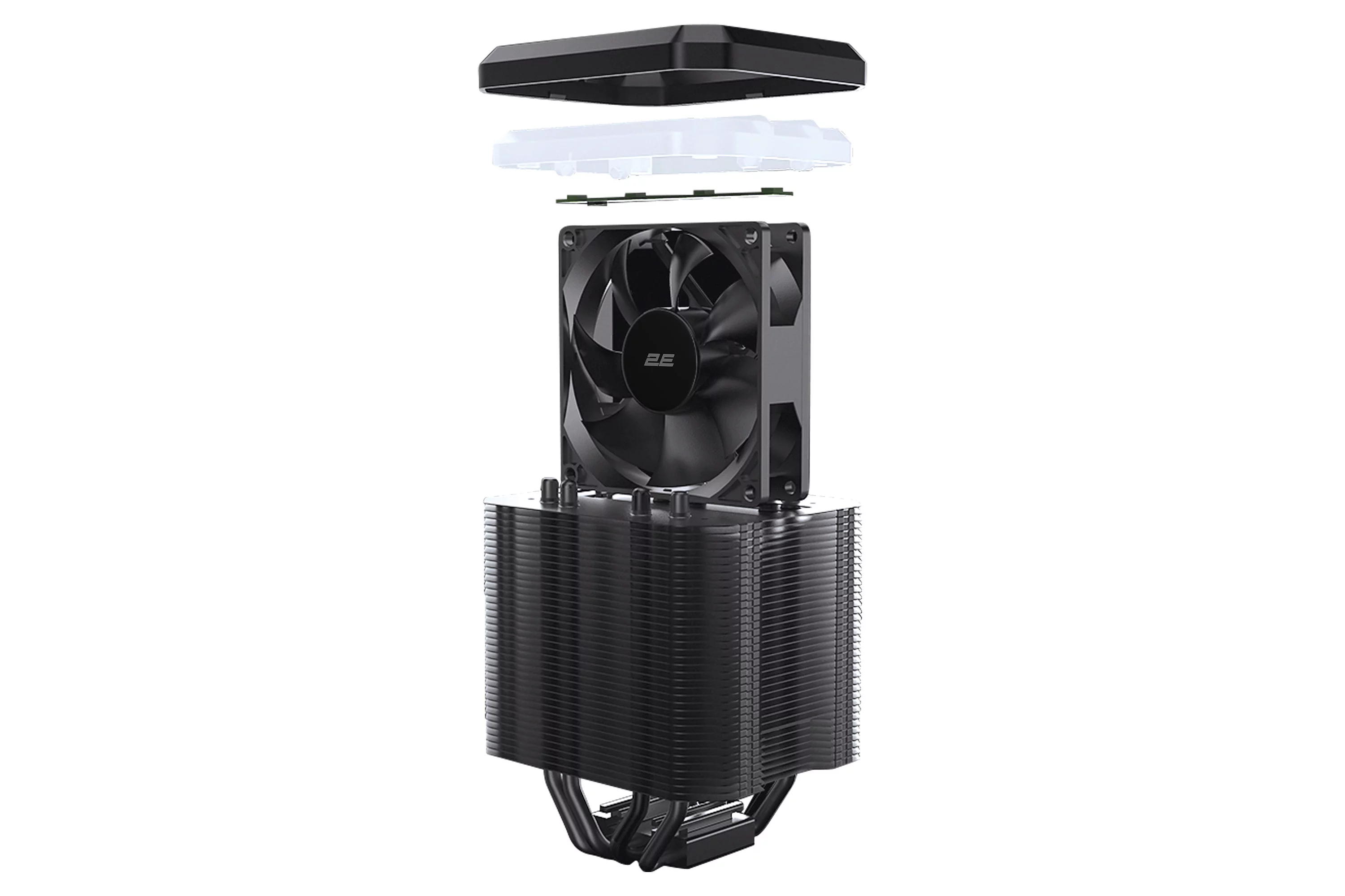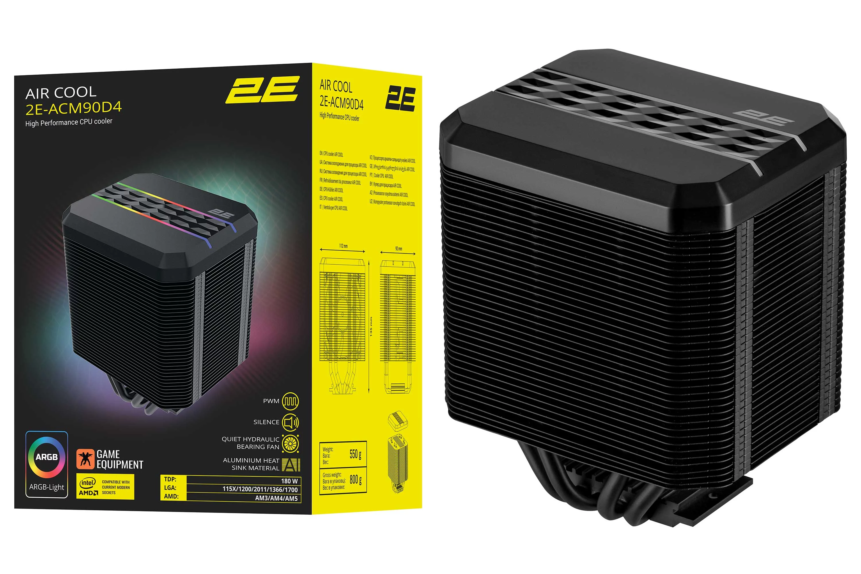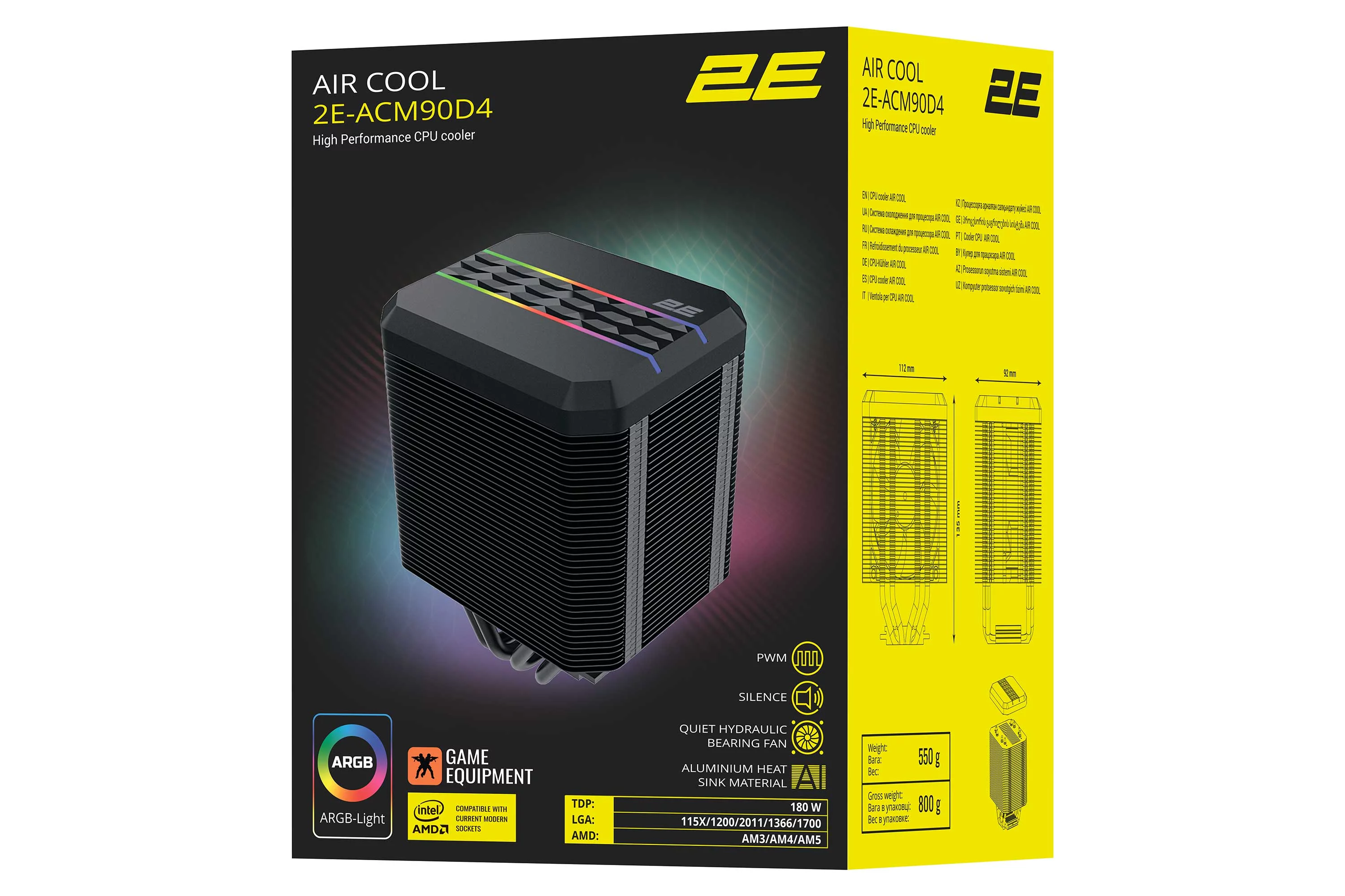 Охолодження для процесору 2E Gaming Air Cool ACM90D4 з ARGB підсвіченням верхнього сегменту декору, вмонтованим в класичну баштову конструкцію радіатору 90 мм вентилятором на гідравлічному підшипнику. Алюмінієвий радіатор із чотирма 6 мм мідними тепловими трубками, які вбудовані в основу на певній відстані, що підвищує ефективність охолодження та впливає на розподіл повітряних потоків. Поверхня радіатору із спеціальним чорним покриттям із керамічними вкрапленнями, що підвищує ефективність охолодження та гарантує при цьому показник TDP 180W. Кулер ACM90D4 із відшліфованою поверхнею основи. Прямий контакт теплових трубок із процесором за DTH технологією, покращує тепловідведення.