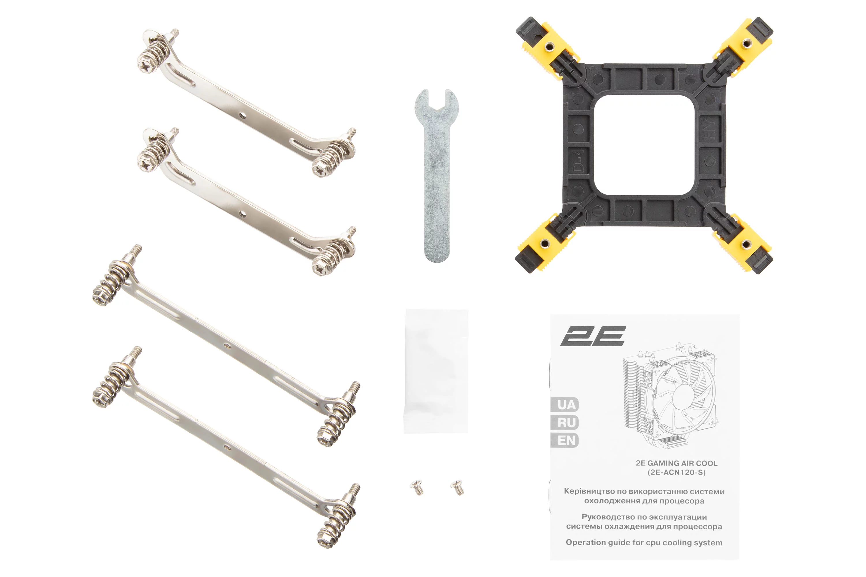 вентилятор, гайковий ключ, гарантійний талон, інструкція, кріпильний комплект, скоби, термопаста