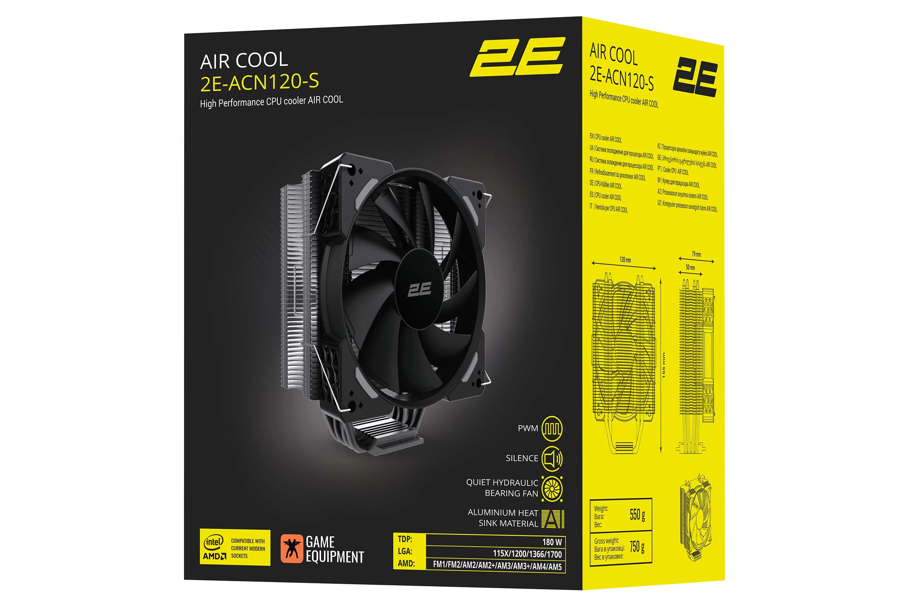 Охолодження для процесору 2E Gaming Air Cool ACN120-S без підсвічування, із класичною баштовою конструкцією радіатора. Компактний кулер із тихим 120 мм вентилятором на гідравлічному підшипнику. Радіатор із чотирма 6 мм мідними тепловими трубками, які вбудовані в основу на певній відстані, що підвищує ефективність охолодження та впливає на розподіл повітряних потоків. Алюмінієва поверхня радіатору із спеціальним чорним покриттям із керамічними вкрапленнями, що підвищує ефективність охолодження та гарантує при цьому показник TDP 180W. Кулер ACN120-S із відшліфованою поверхнею основи. Прямий контакт теплових трубок із процесором за DTH технологією, покращує тепловідведення.