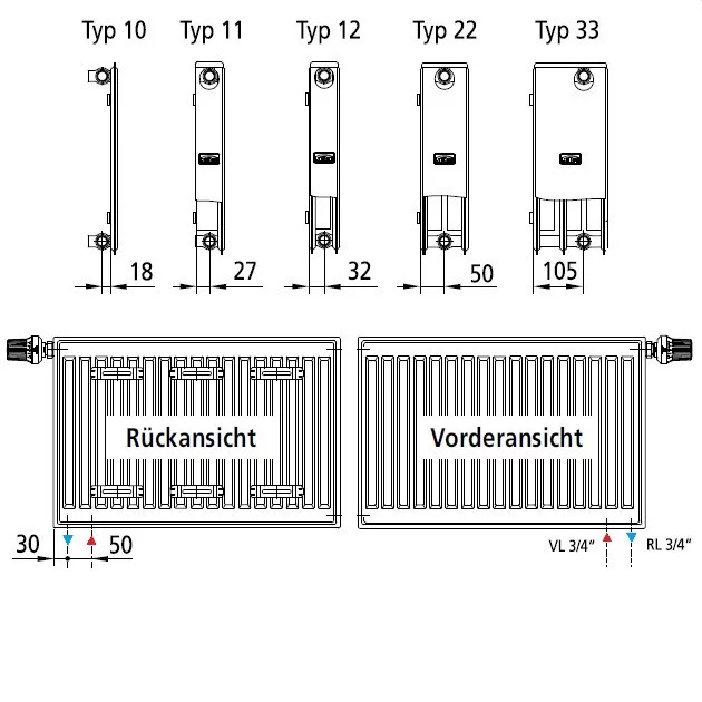 енергозберігаюча технологія, оснащений вентильним клапаном під термостат, профільні панелі (з оребренням), радіатор з нижнім підключенням до труб, 2 - дві гріючі панелі, 2 - два оребрення
