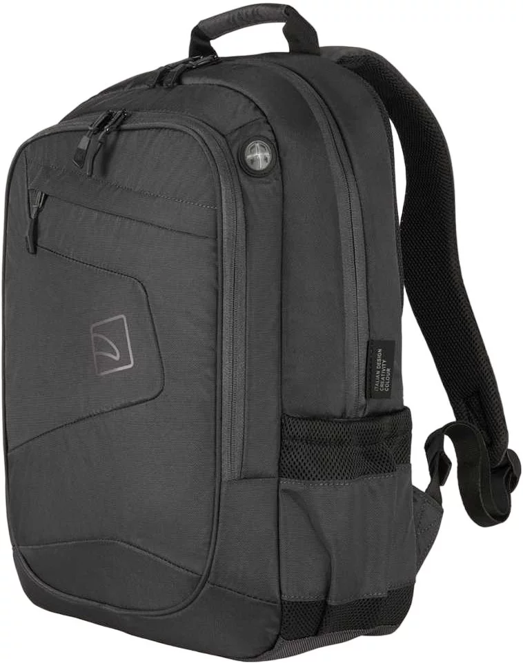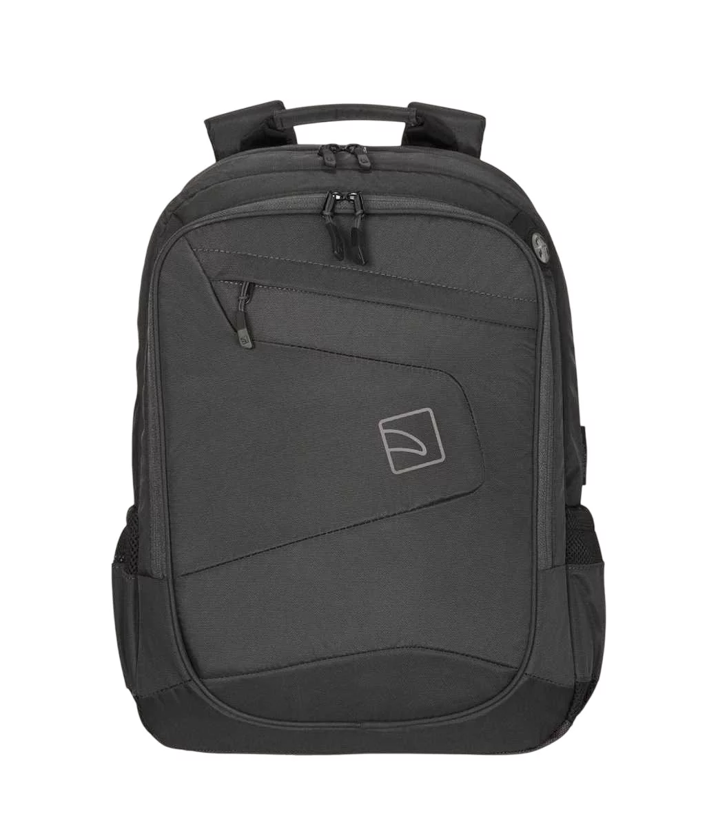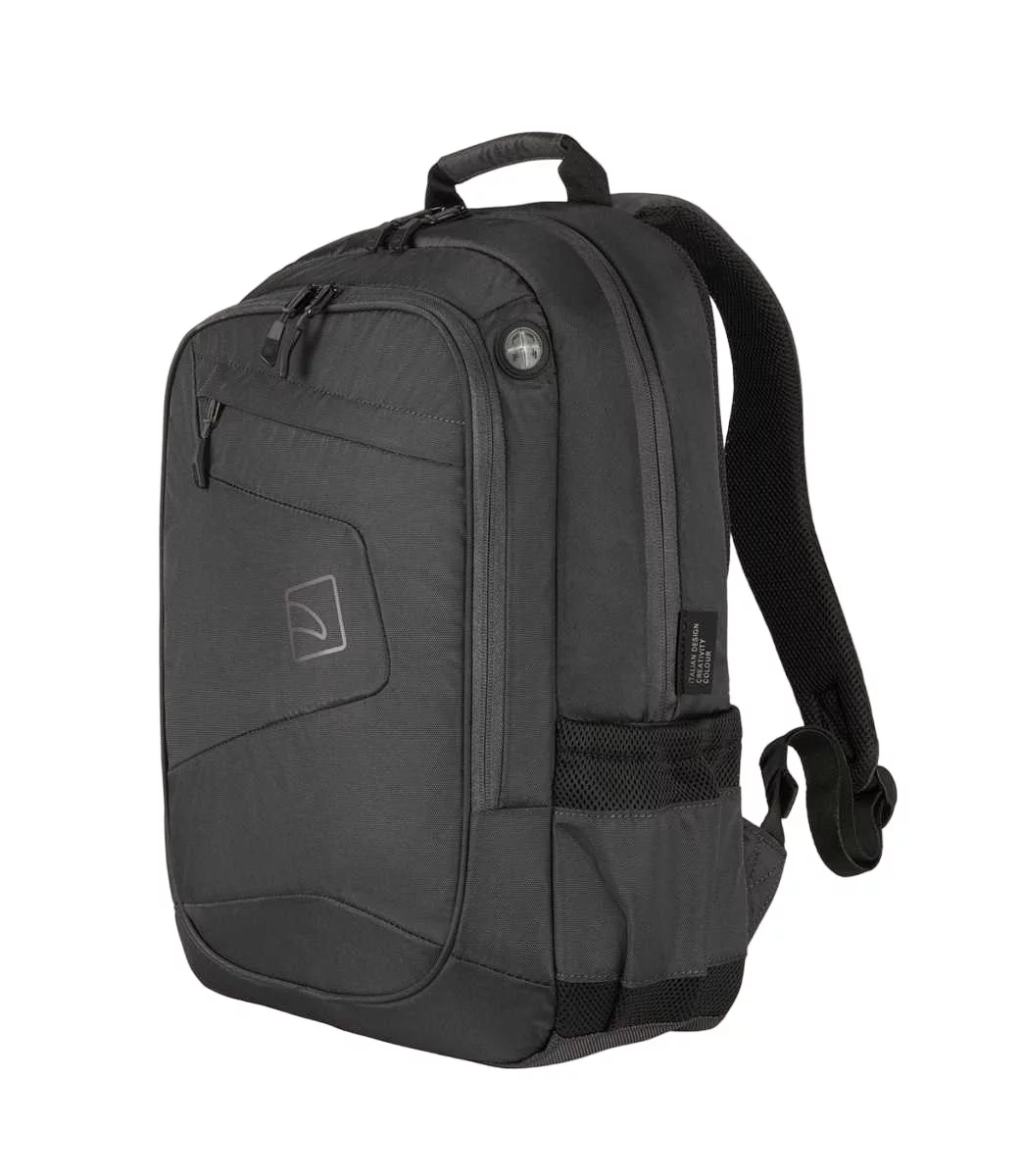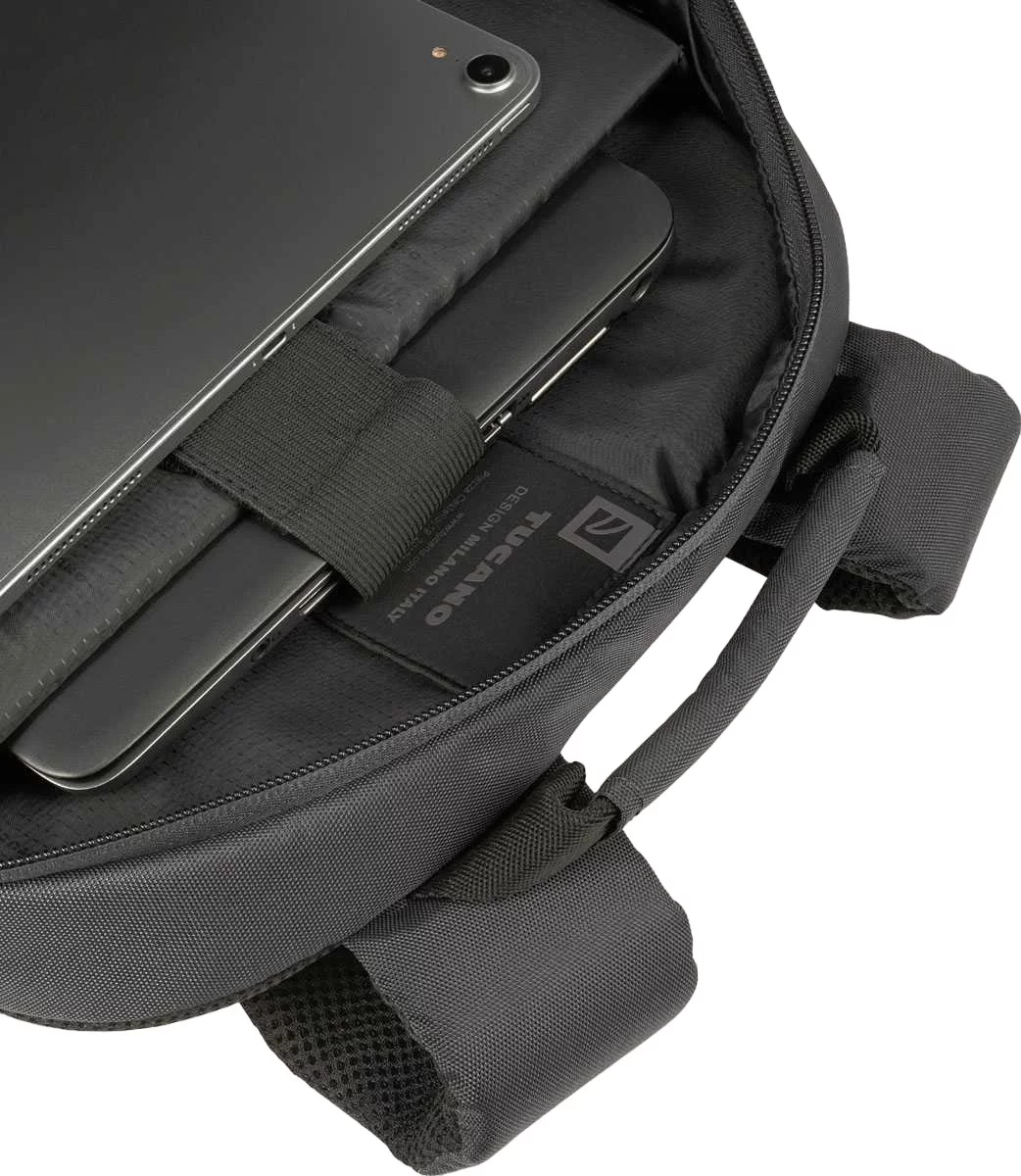 Повсякденний рюкзак Tucano Lato 15 в діловому стилі зі спортивними нотками розраховано для 16-дюймового MacBook Pro та 15,6-16 дюймових ноутбуків. Виготовлений із матеріалів з використанням переробленого пластику. Організована передня зовнішня кишеня та маленька кишеня для аксесуарів, обидві на блискавці. Невеликий спеціальний отвір дозволяє виводити навушники. Велике внутрішнє відділення оснащене м'якою подвійною кишенею з фіксуючим ремінцем на липучці (окрема кишеня для ноутбука і окрема кишеня для планшету). Збоку дві еластичні сітчасті кишені для пляшок, парасольок і предметів подібного розміру. Задня сторона, з ергономічною спинкою та регульованими м'якими плечовими лямками, оснащена паском для кріплення рюкзакая на ручці валізи.